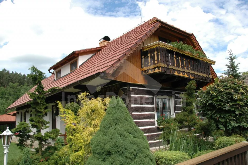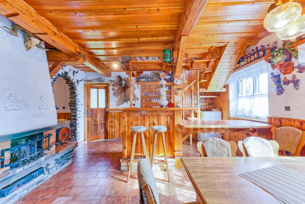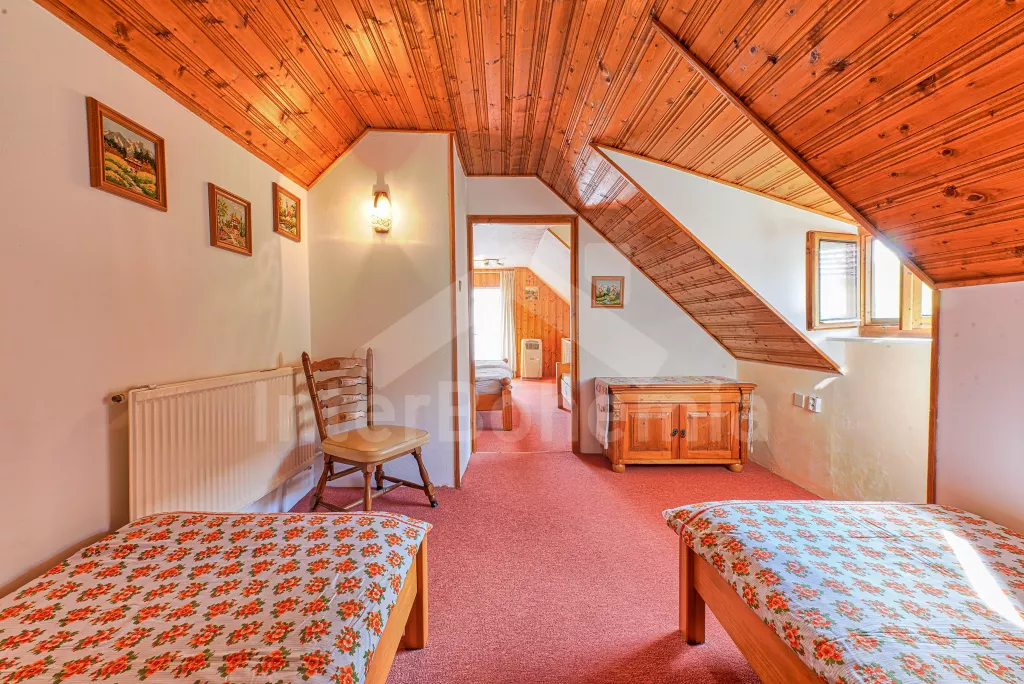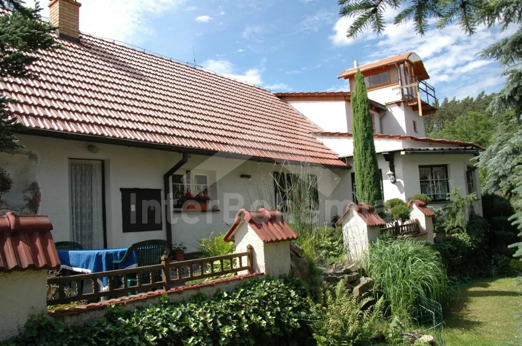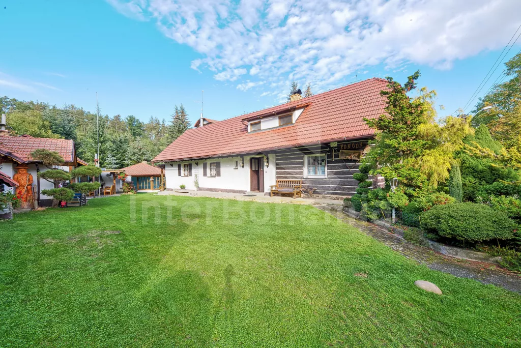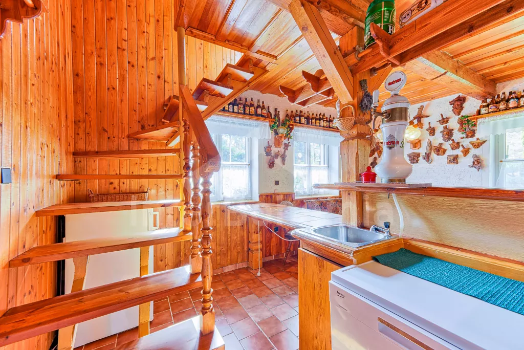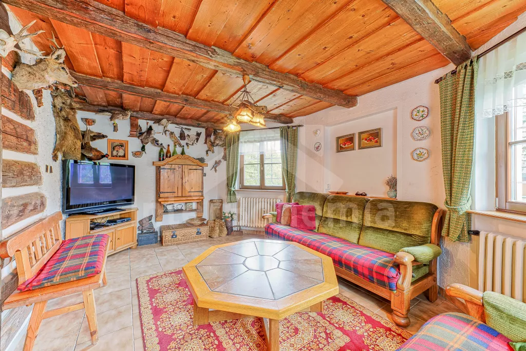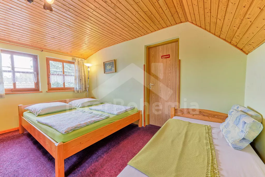 Volně stojící dům, velmi pěkné a pohodlné ubytování! Objekt je vkusně zařízen a pečlivě udržován. Obytná část tohoto domu, zrenovovaného ve starém stylu, se skládá z 6 místností. Vchod do haly. Obývací pokoj se sedací soupravou pro 6 osob, jídelním stolem pro 7 osob, krbem, televizí se satelitním příjmem, radiem a vstupem na terasu. Z části otevřená kuchyně s barem s chladícím výčepním zařízením a barovými stoličkami, elektrickým sporákem s elektrickou troubou, lednicí, myčkou, kávovarem a varnou konvicí. Koupelna s vanou a WC. Druhé samostatné WC. Ložnice s dvojlůžkem a dětskou postýlkou. Tato ložnice je přístupná z chodby nebo z druhého obývacího pokoje. Druhý obývací pokoj má samostatný vchod zvenčí a je vybaven sedací soupravou a jídelním stolem pro 4 osoby a televizí se satelitním příjmem. Malý kuchyňský kout s dvouplotýnkovým vařičem, lednicí, mikrovlnkou, kávovarem a varnou konvicí. Druhá koupelna se sprchou a WC. V patře se nachází ještě tři ložnice – jedna průchozí se třemi lůžky, druhá ložnice s dvojlůžkem a třetí ložnice s dvojlůžkem, jedním samostatným lůžkem a vlastní toaletou s umyvadlem. Ústřední plynové topení. V letní sezoně (květen - září) je k dispozici vnitřní bazén 6,5 x 4 m s filtrací a s vyhříváním tepelným čerpadlem. Dále je v objektu sauna, biliár (na mince), stolní fotbal, stolní tenis. Okrasná zahrada s květinami a malým rybníčkem. Dvě terasy, z nichž jedna je zastřešená. K dispozici zahradní krb, zahradní nábytek a slunečník. Pro děti je k dispozici domeček na hraní se skluzavkou, houpačka, houpací koník a pískoviště.