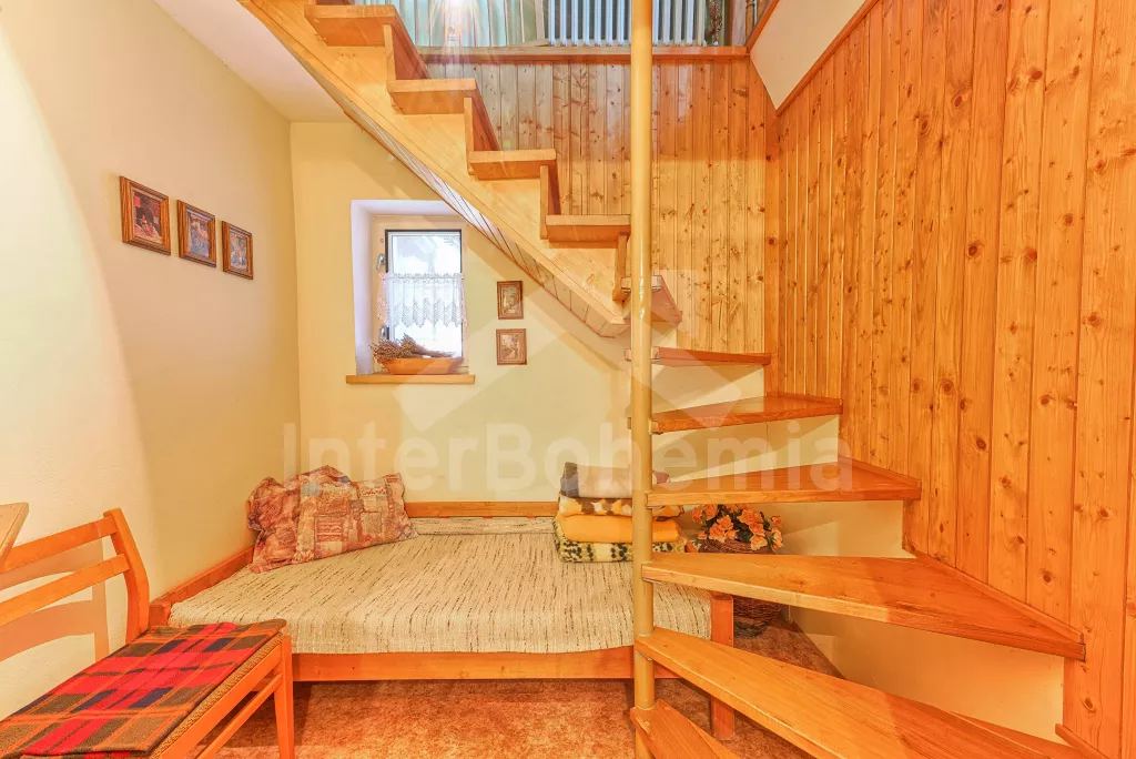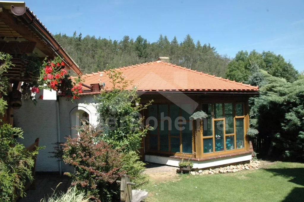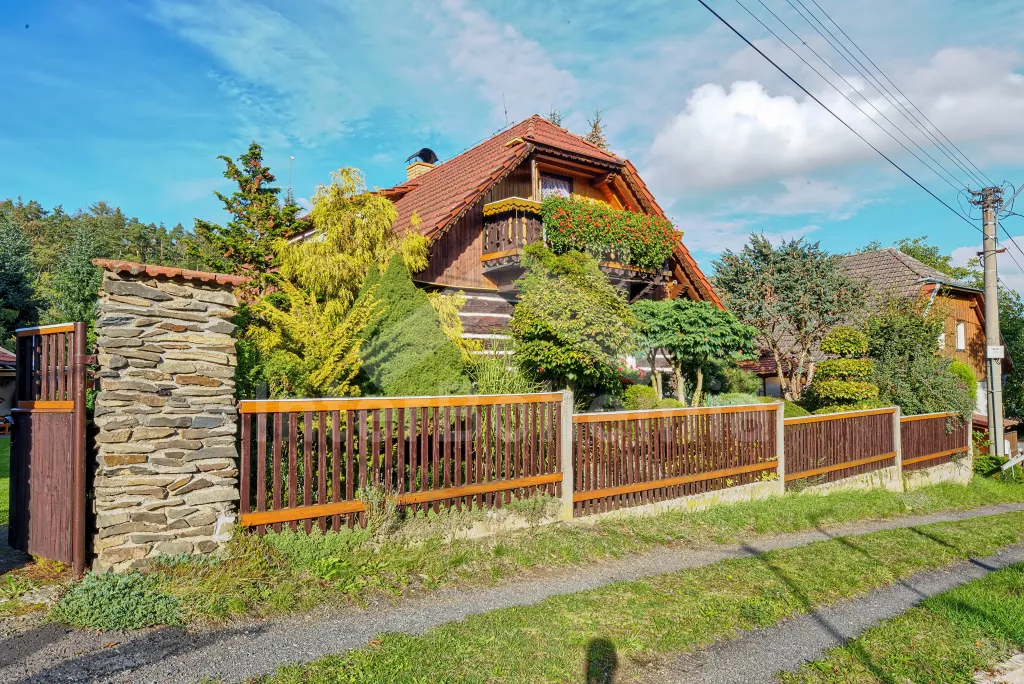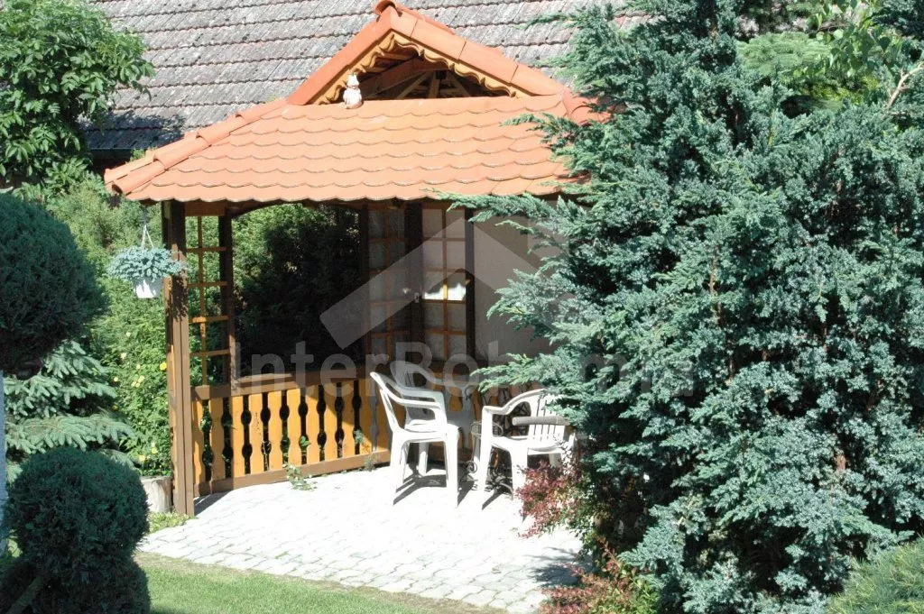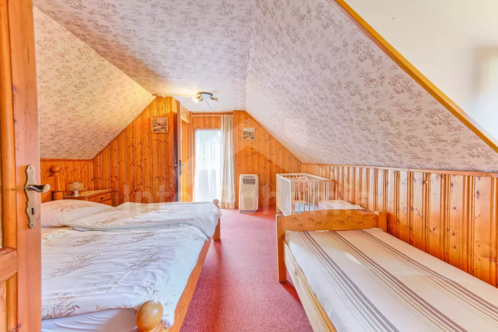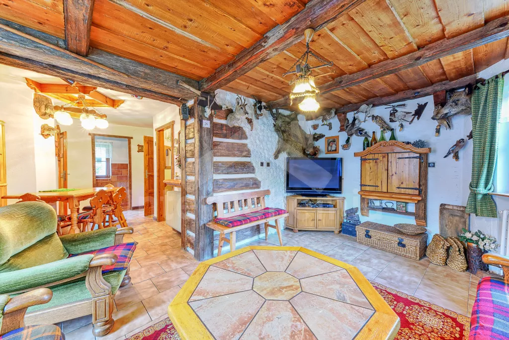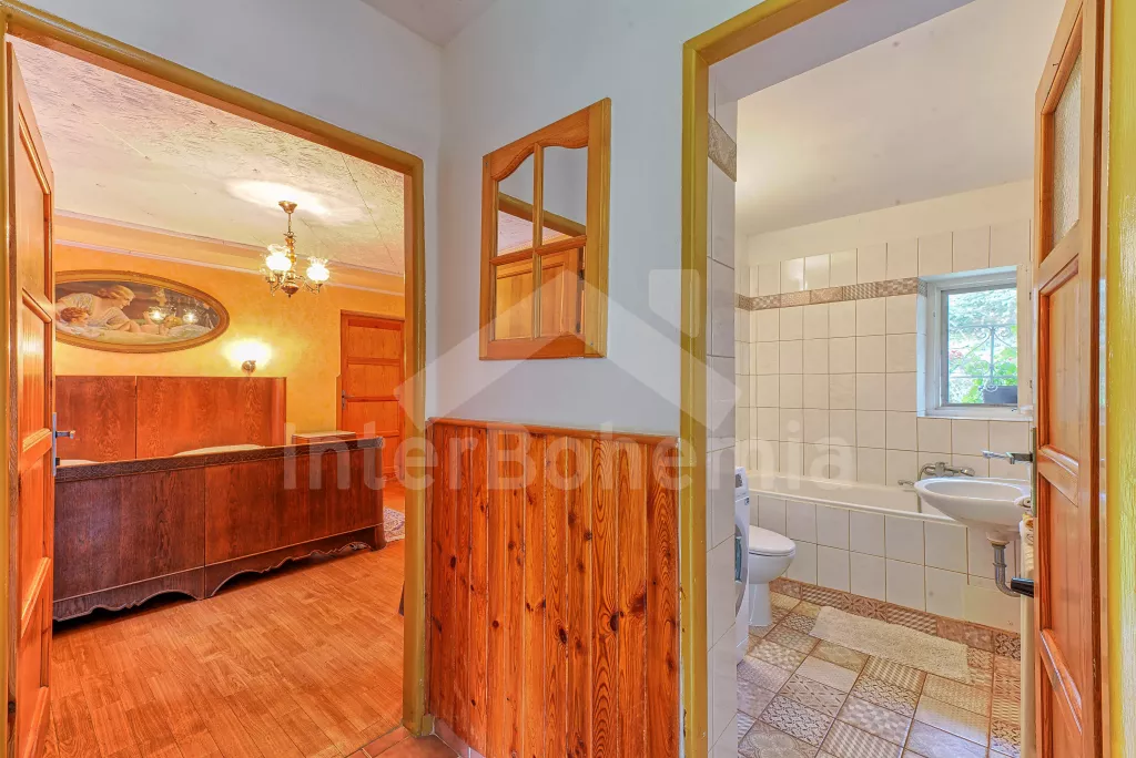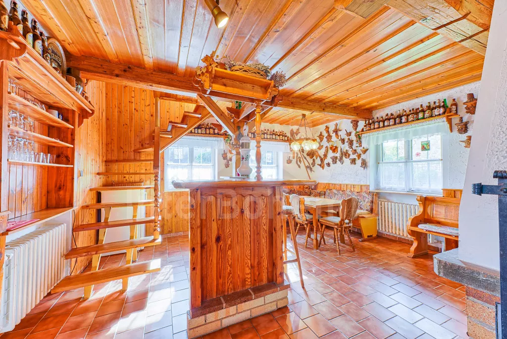 Volně stojící dům, velmi pěkné a pohodlné ubytování! Objekt je vkusně zařízen a pečlivě udržován. Obytná část tohoto domu, zrenovovaného ve starém stylu, se skládá z 6 místností. Vchod do haly. Obývací pokoj se sedací soupravou pro 6 osob, jídelním stolem pro 7 osob, krbem, televizí se satelitním příjmem, radiem a vstupem na terasu. Z části otevřená kuchyně s barem s chladícím výčepním zařízením a barovými stoličkami, elektrickým sporákem s elektrickou troubou, lednicí, myčkou, kávovarem a varnou konvicí. Koupelna s vanou a WC. Druhé samostatné WC. Ložnice s dvojlůžkem a dětskou postýlkou. Tato ložnice je přístupná z chodby nebo z druhého obývacího pokoje. Druhý obývací pokoj má samostatný vchod zvenčí a je vybaven sedací soupravou a jídelním stolem pro 4 osoby a televizí se satelitním příjmem. Malý kuchyňský kout s dvouplotýnkovým vařičem, lednicí, mikrovlnkou, kávovarem a varnou konvicí. Druhá koupelna se sprchou a WC. V patře se nachází ještě tři ložnice – jedna průchozí se třemi lůžky, druhá ložnice s dvojlůžkem a třetí ložnice s dvojlůžkem, jedním samostatným lůžkem a vlastní toaletou s umyvadlem. Ústřední plynové topení. V letní sezoně (květen - září) je k dispozici vnitřní bazén 6,5 x 4 m s filtrací a s vyhříváním tepelným čerpadlem. Dále je v objektu sauna, biliár (na mince), stolní fotbal, stolní tenis. Okrasná zahrada s květinami a malým rybníčkem. Dvě terasy, z nichž jedna je zastřešená. K dispozici zahradní krb, zahradní nábytek a slunečník. Pro děti je k dispozici domeček na hraní se skluzavkou, houpačka, houpací koník a pískoviště.