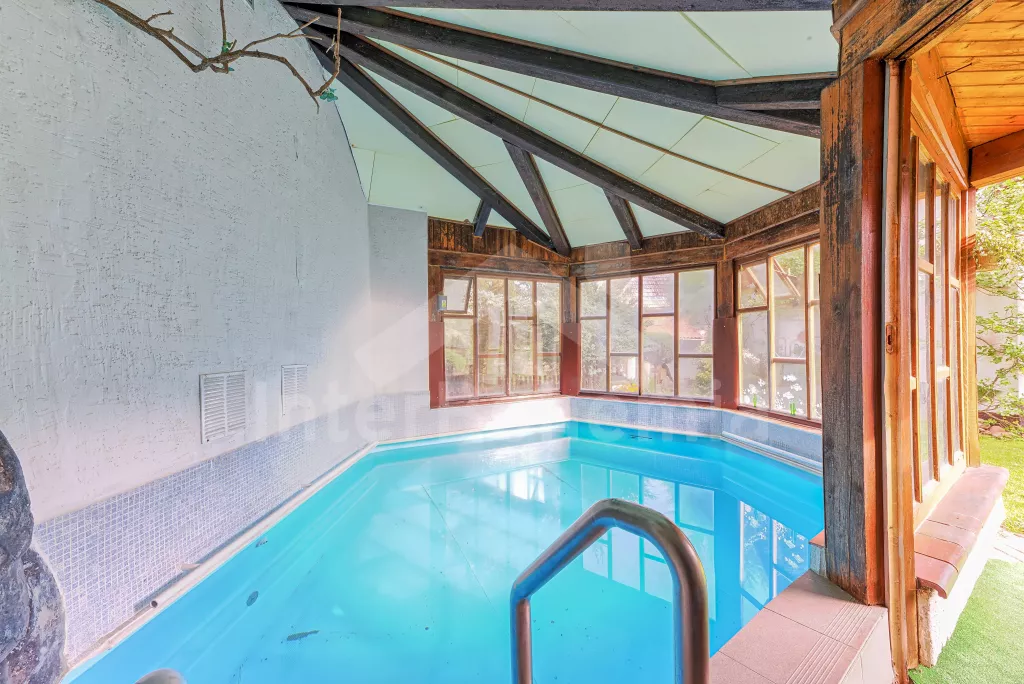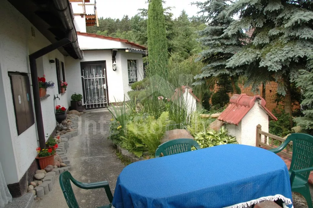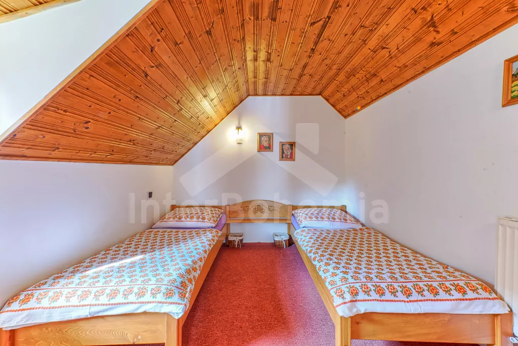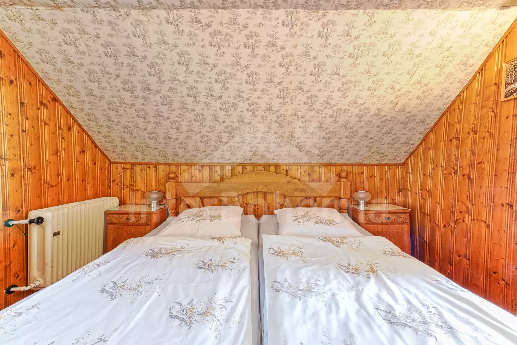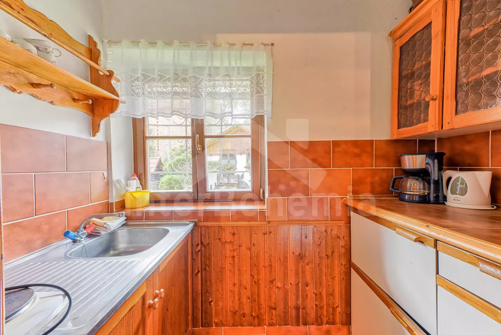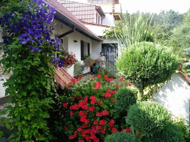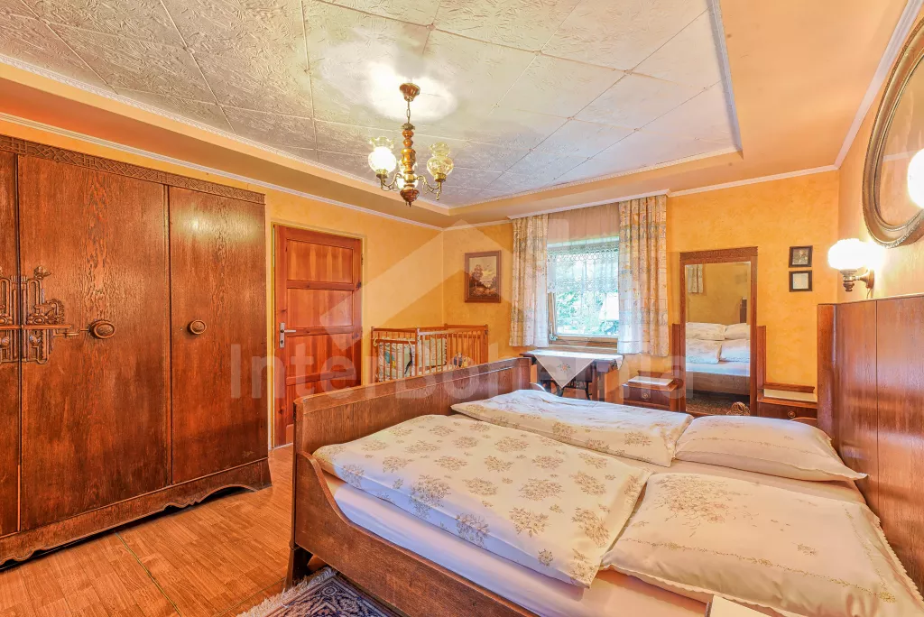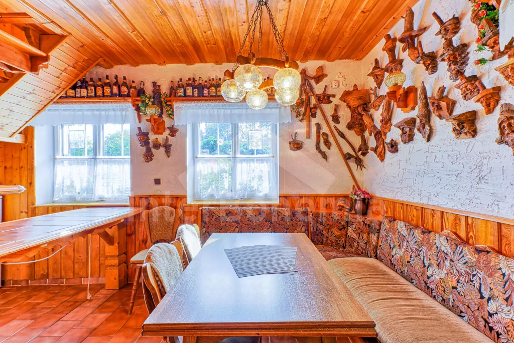 Volně stojící dům, velmi pěkné a pohodlné ubytování! Objekt je vkusně zařízen a pečlivě udržován. Obytná část tohoto domu, zrenovovaného ve starém stylu, se skládá z 6 místností. Vchod do haly. Obývací pokoj se sedací soupravou pro 6 osob, jídelním stolem pro 7 osob, krbem, televizí se satelitním příjmem, radiem a vstupem na terasu. Z části otevřená kuchyně s barem s chladícím výčepním zařízením a barovými stoličkami, elektrickým sporákem s elektrickou troubou, lednicí, myčkou, kávovarem a varnou konvicí. Koupelna s vanou a WC. Druhé samostatné WC. Ložnice s dvojlůžkem a dětskou postýlkou. Tato ložnice je přístupná z chodby nebo z druhého obývacího pokoje. Druhý obývací pokoj má samostatný vchod zvenčí a je vybaven sedací soupravou a jídelním stolem pro 4 osoby a televizí se satelitním příjmem. Malý kuchyňský kout s dvouplotýnkovým vařičem, lednicí, mikrovlnkou, kávovarem a varnou konvicí. Druhá koupelna se sprchou a WC. V patře se nachází ještě tři ložnice – jedna průchozí se třemi lůžky, druhá ložnice s dvojlůžkem a třetí ložnice s dvojlůžkem, jedním samostatným lůžkem a vlastní toaletou s umyvadlem. Ústřední plynové topení. V letní sezoně (květen - září) je k dispozici vnitřní bazén 6,5 x 4 m s filtrací a s vyhříváním tepelným čerpadlem. Dále je v objektu sauna, biliár (na mince), stolní fotbal, stolní tenis. Okrasná zahrada s květinami a malým rybníčkem. Dvě terasy, z nichž jedna je zastřešená. K dispozici zahradní krb, zahradní nábytek a slunečník. Pro děti je k dispozici domeček na hraní se skluzavkou, houpačka, houpací koník a pískoviště.