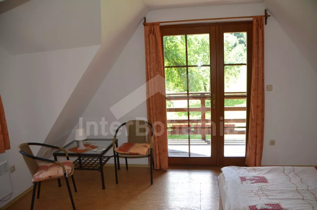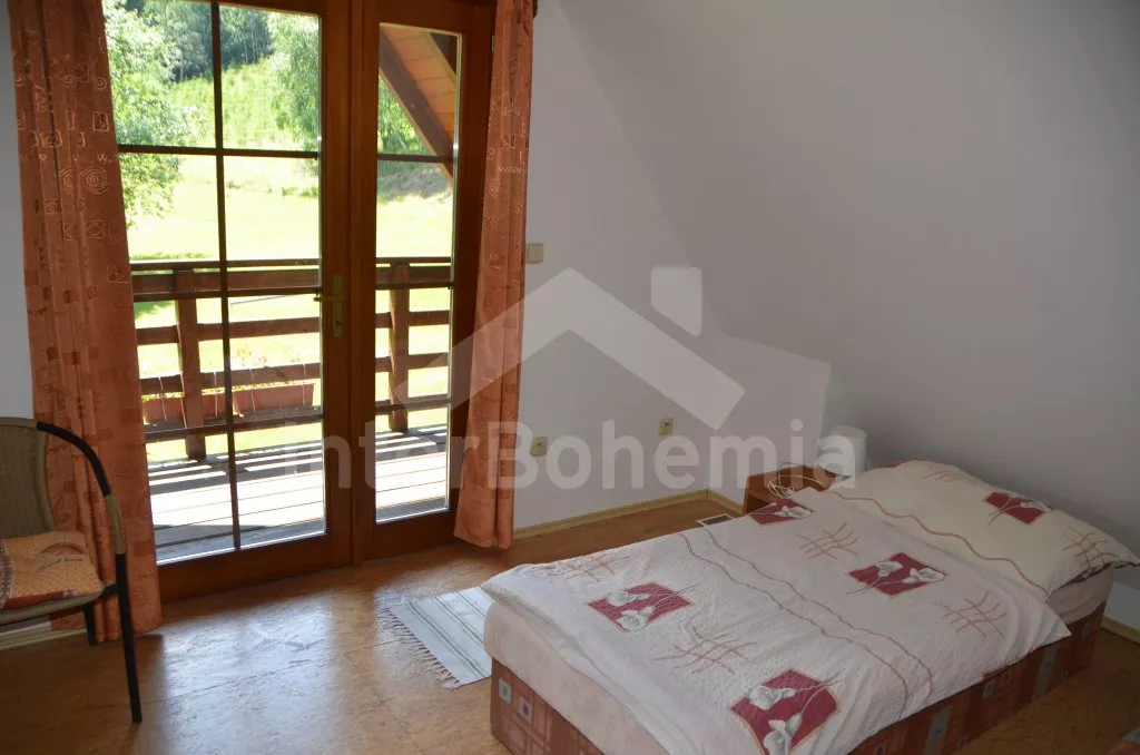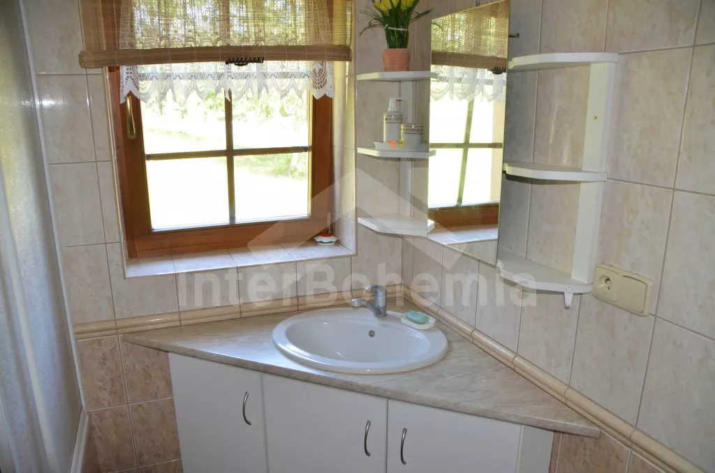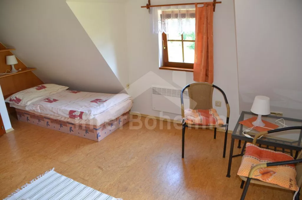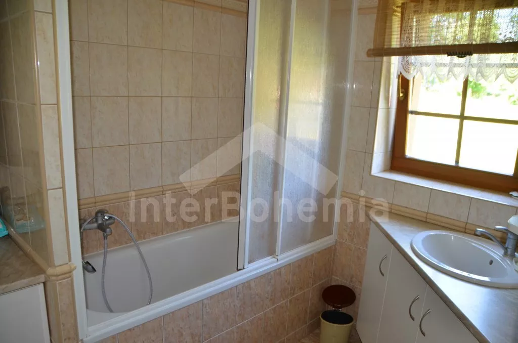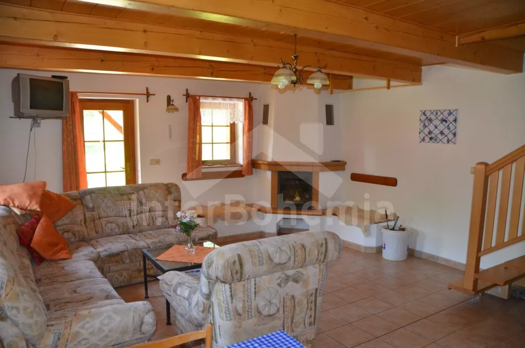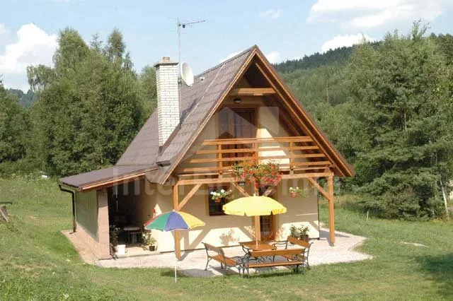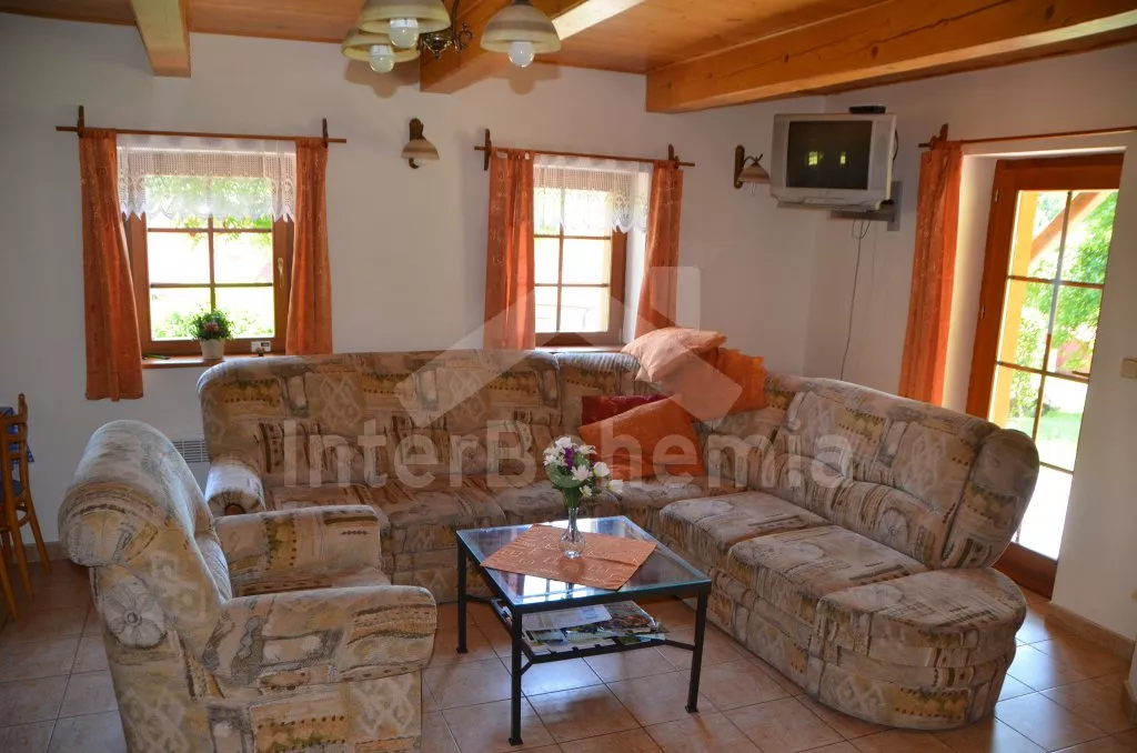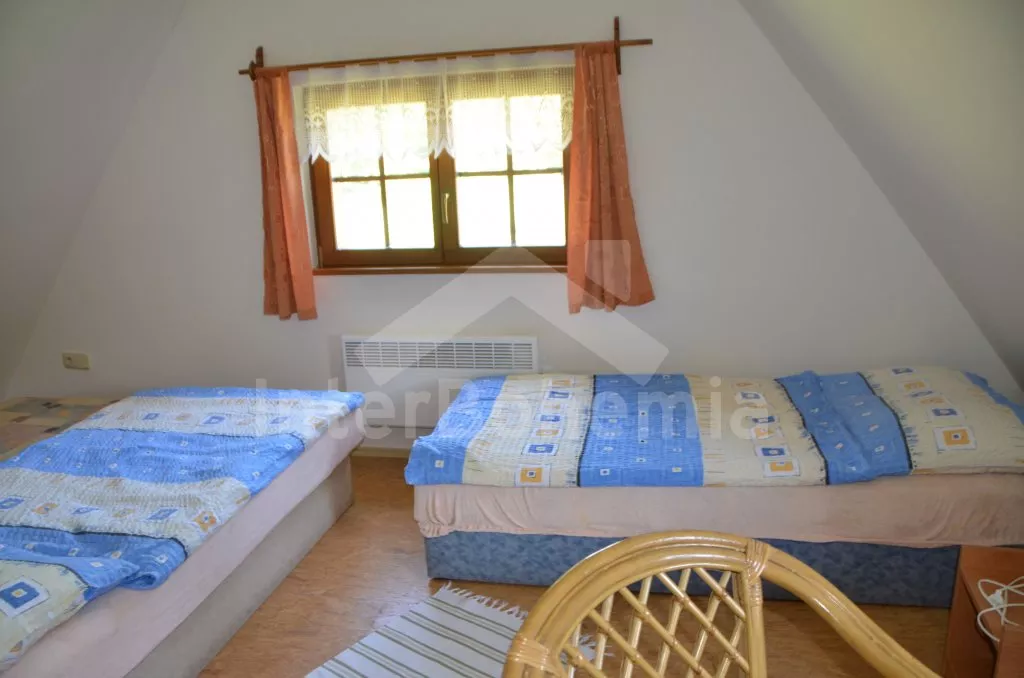 Volně stojící dům, v roce 2005 nově postavený, nově, moderně a komfortně zařízený. Vchod, chodba, prostorný obývací pokoj se sedací soupravou, jídelním stolem, krbem, televizí se satelitním příjmem a vstupem na terasu. Možnost dvou přistýlek (rozkládací gauč). Otevřená kuchyně s elektrickým sporákem s keramickou deskou, lednicí, kávovarem, varnou konvicí a mikrovlnnou troubou. Koupelna s vanou a uzavřeným WC. Z obývacího pokoje vedou schody do podkroví. Zde se nachází druhé WC, průchozí ložnice s dvojlůžkem, jedním samostatným lůžkem a posezením a druhá ložnice se třemi lůžky, posezením a balkonem. Dům stojí ve velké, neoplocené zahradě, k dispozici je terasa, zahradní nábytek se slunečníkem, přenosný gril, ohniště a 30 m od objektu částečně zapuštěný kulatý bazén o průměru 4,5 m s filtrační jednotkou a solárním ohřevem. Elektrické topení. Garáž za poplatek (Kč 350,-/týden) a vlastní parkoviště.