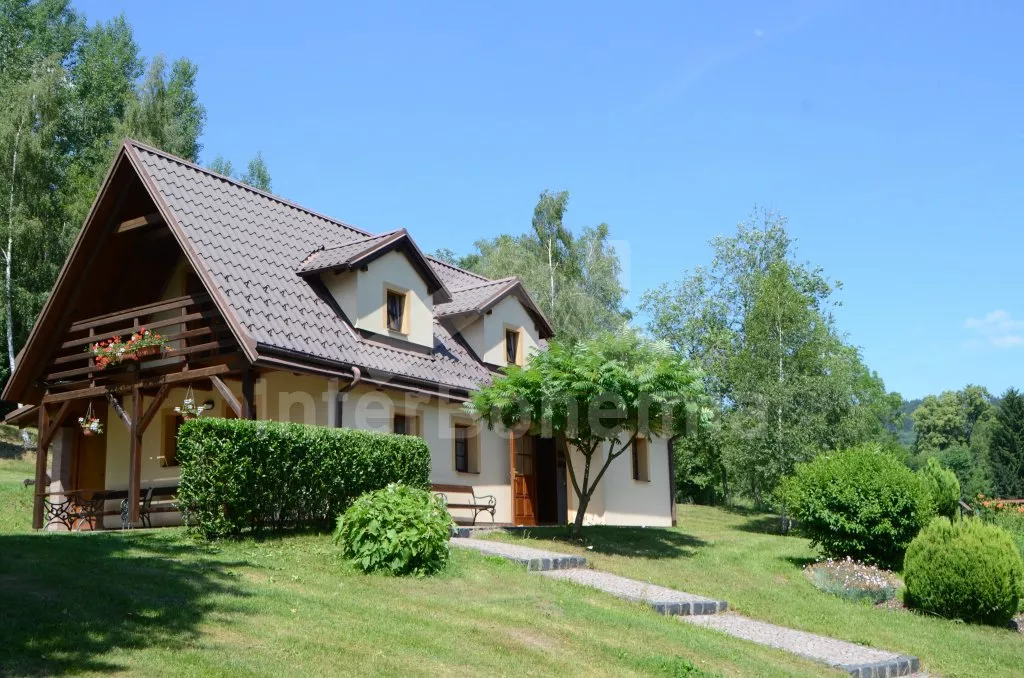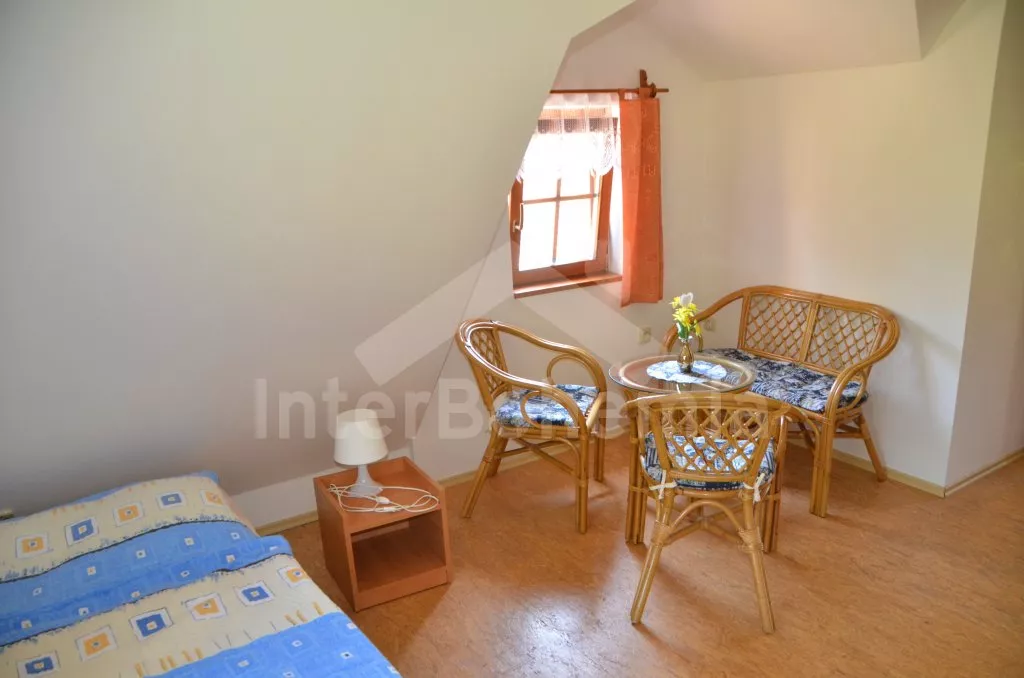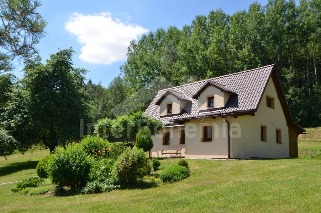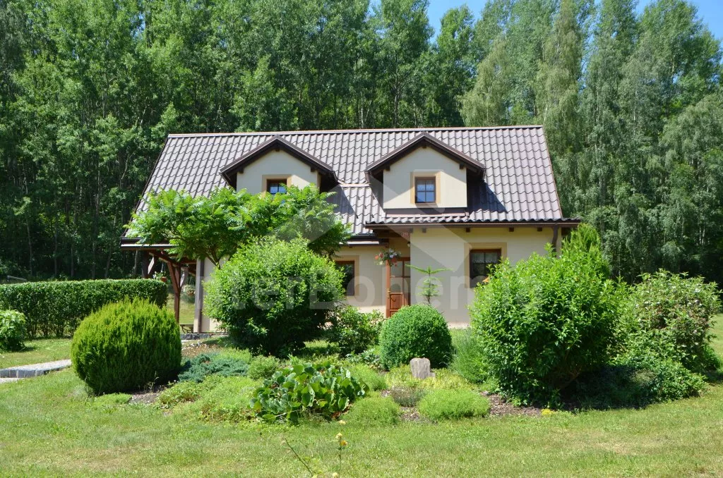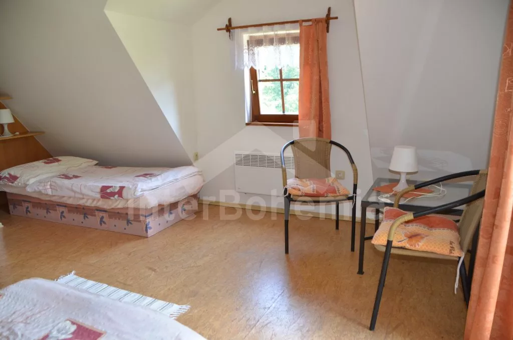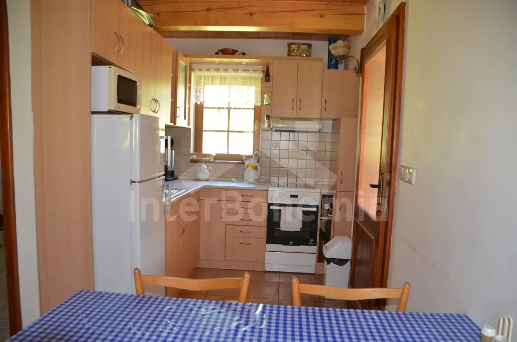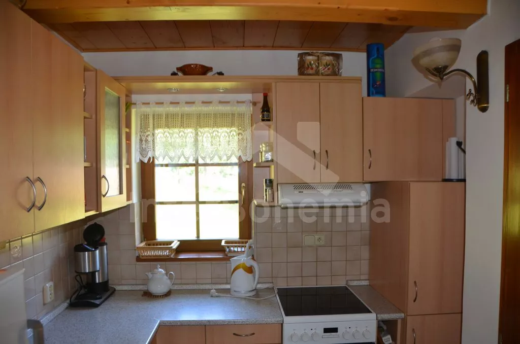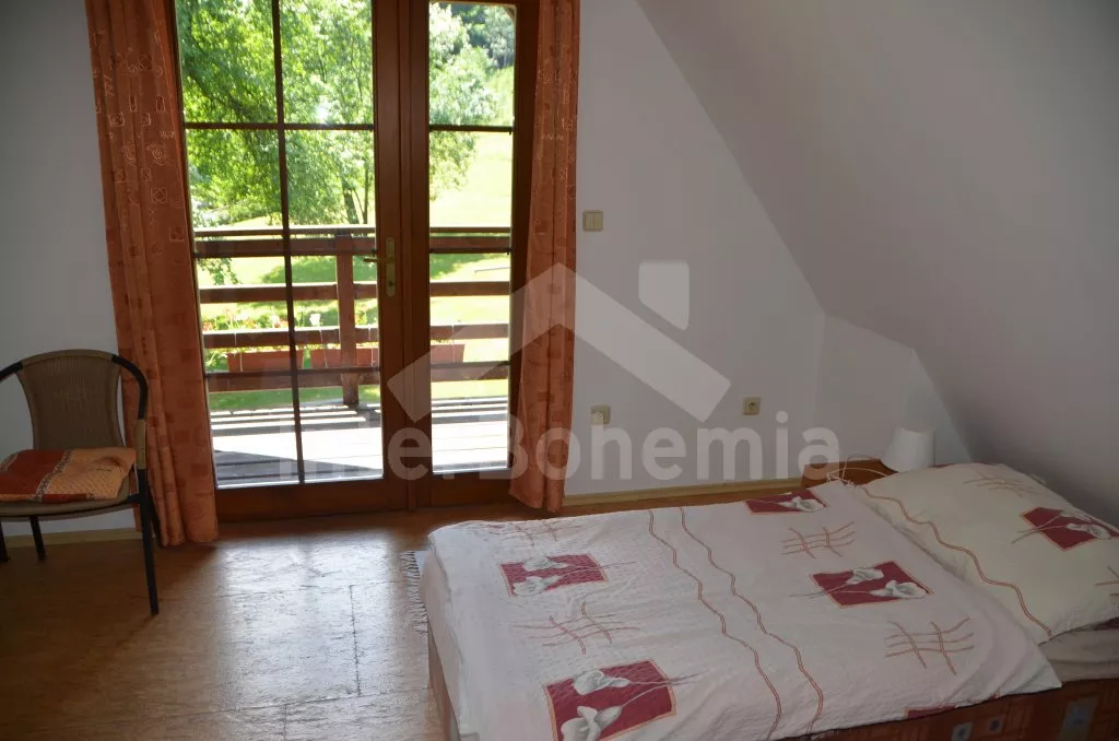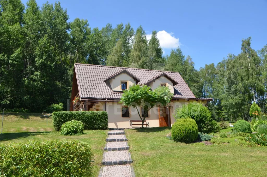 Volně stojící dům, v roce 2005 nově postavený, nově, moderně a komfortně zařízený. Vchod, chodba, prostorný obývací pokoj se sedací soupravou, jídelním stolem, krbem, televizí se satelitním příjmem a vstupem na terasu. Možnost dvou přistýlek (rozkládací gauč). Otevřená kuchyně s elektrickým sporákem s keramickou deskou, lednicí, kávovarem, varnou konvicí a mikrovlnnou troubou. Koupelna s vanou a uzavřeným WC. Z obývacího pokoje vedou schody do podkroví. Zde se nachází druhé WC, průchozí ložnice s dvojlůžkem, jedním samostatným lůžkem a posezením a druhá ložnice se třemi lůžky, posezením a balkonem. Dům stojí ve velké, neoplocené zahradě, k dispozici je terasa, zahradní nábytek se slunečníkem, přenosný gril, ohniště a 30 m od objektu částečně zapuštěný kulatý bazén o průměru 4,5 m s filtrační jednotkou a solárním ohřevem. Elektrické topení. Garáž za poplatek (Kč 350,-/týden) a vlastní parkoviště.