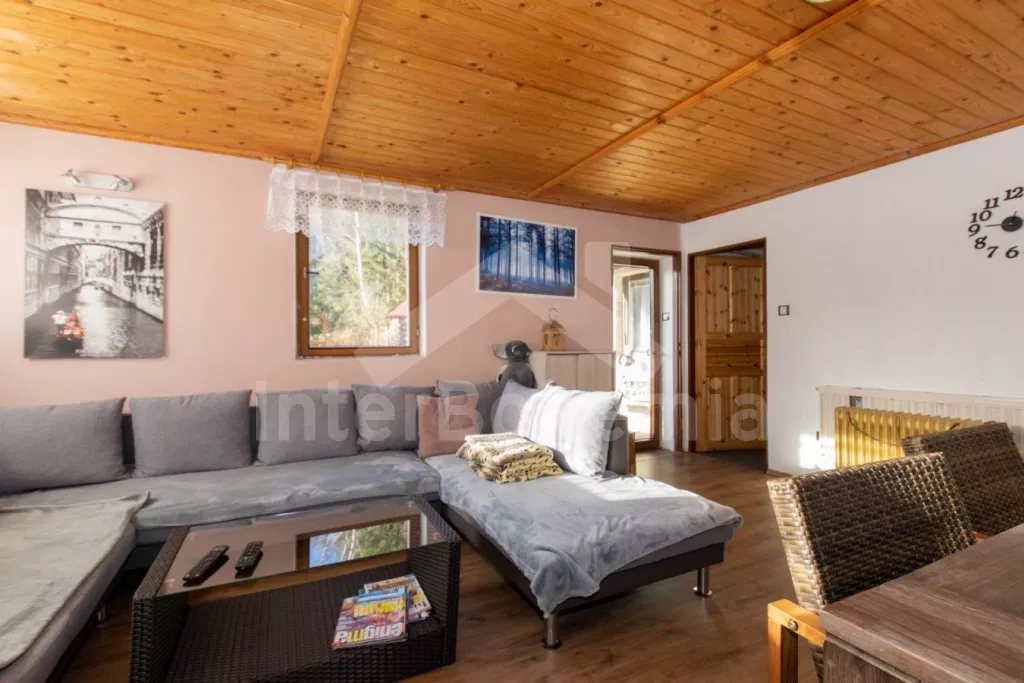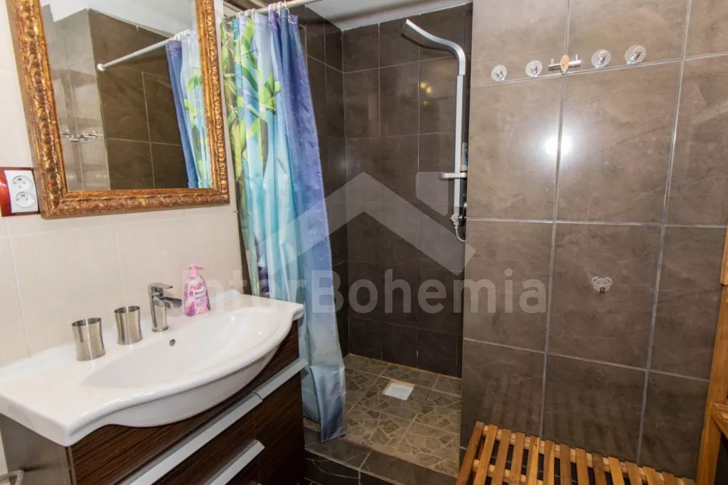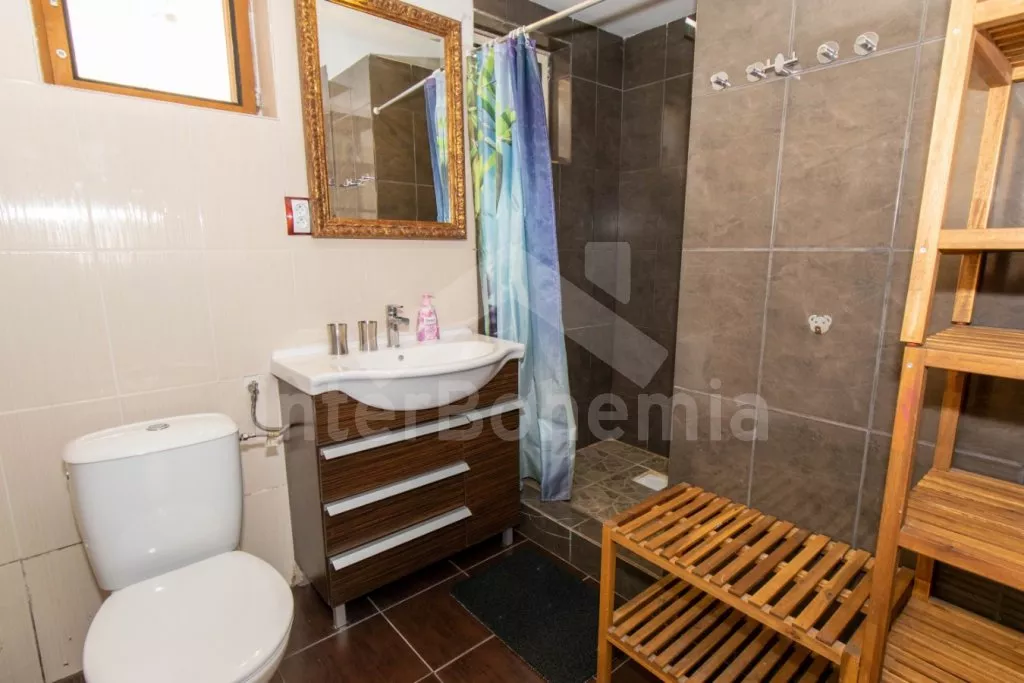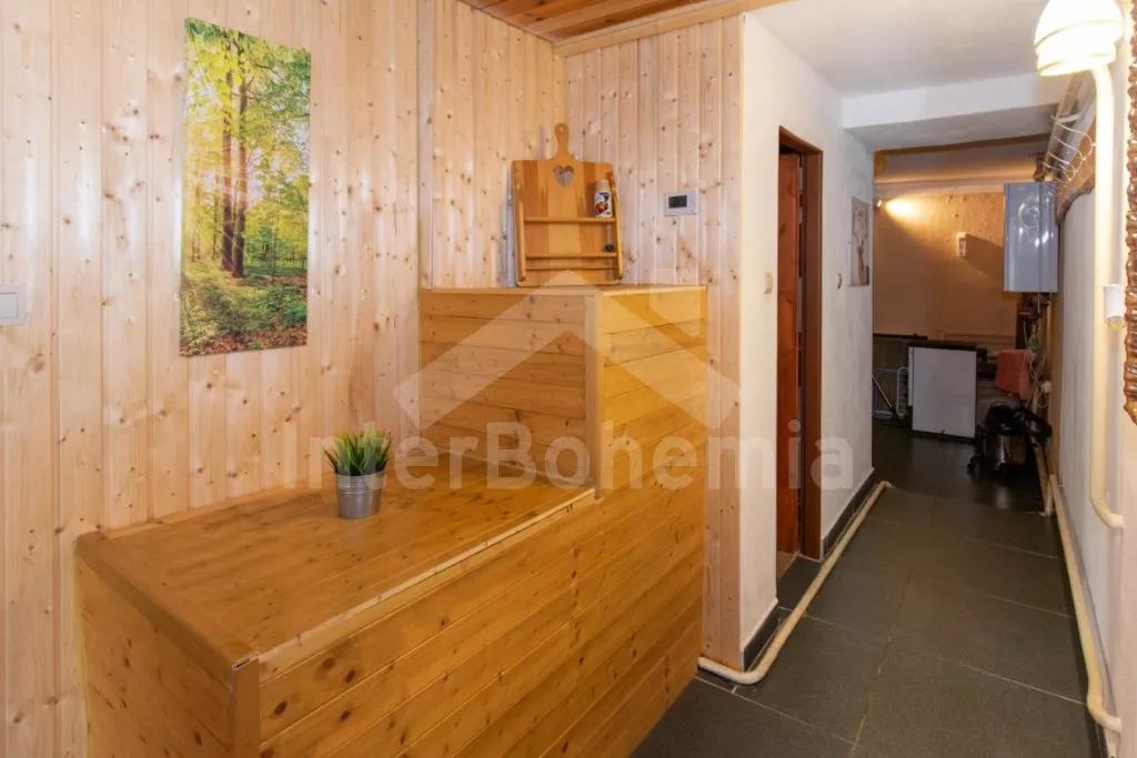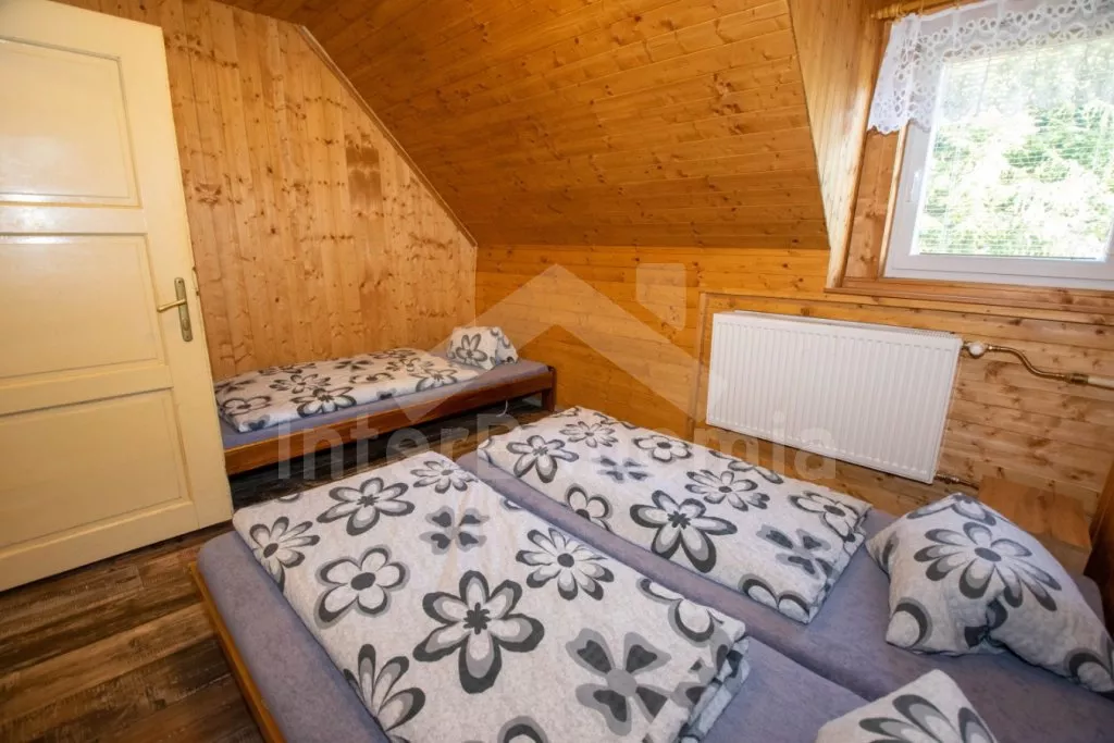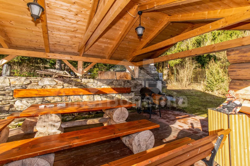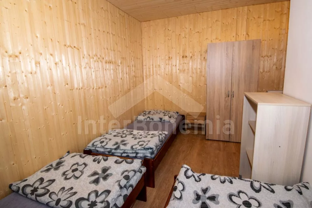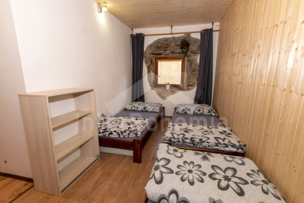 Volně stojící chalupa s oplocenou zahradou. V přízemí najdete kompletně vybavenou kuchyni s varnou deskou, troubou, mikrovlnnou troubou, lednicí s mrazákem, rychlovarnou konvicí, toustovačem, kávovarem na mletou kávu a nádobím. Společenská místnost se sedací soupravou, posezením, LCD televizí a dětským koutkem. Celkem 5 ložnic. První se třemi jednolůžky, druhá a třetí s dvoulůžkem, čtvrtá se třemi lůžky a pátá se dvěma dvoulůžky. Dvě koupelny, každá s WC a sprchovým koutem. K dispozici oplocená zahrada s krbem, krytým posezením v pergole, ohništěm, dětským hřištěm, trampolínou a zděným bazénem. Hosté mohou využívat kolárnu. Parkování u chalupy.