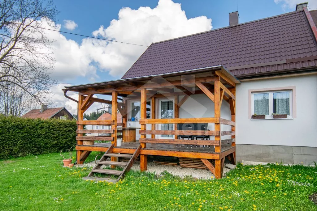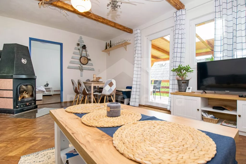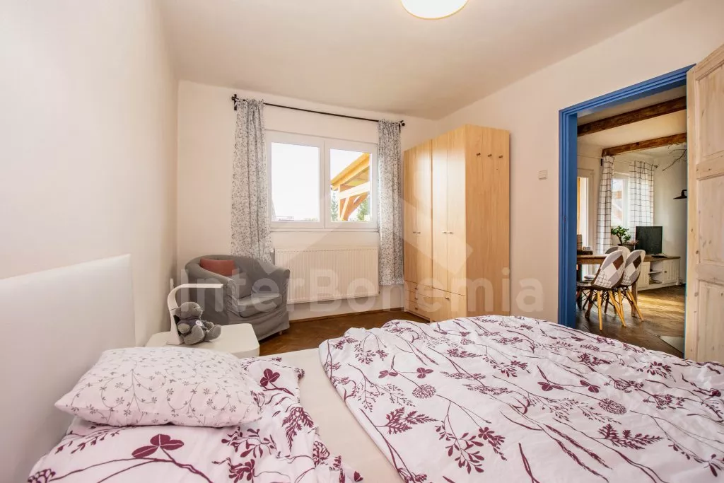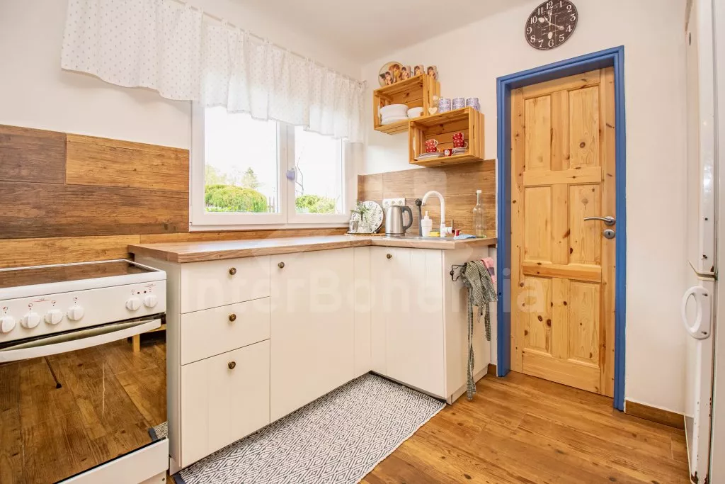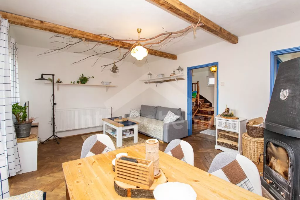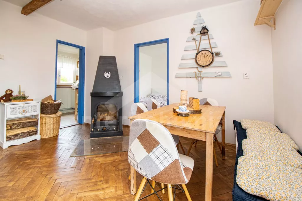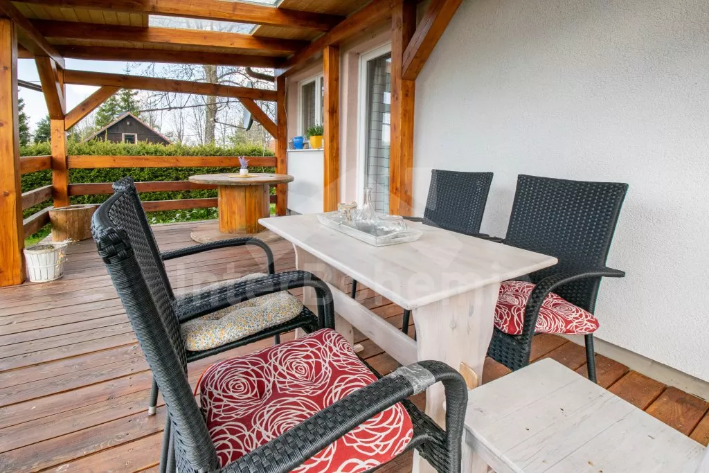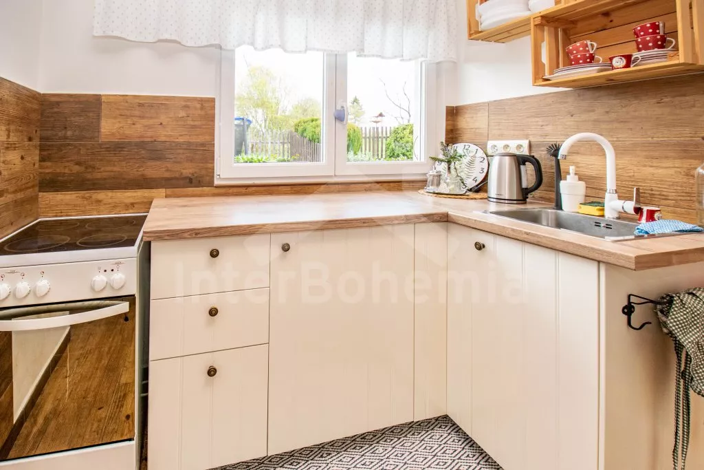 Vkusně zařízená chalupa v klidném prostředí se zastřešenou terasou. Obývací pokoj s rozkl. pohovkou, konferenčním stolkem, TV, jídelním stolem pro 6 osob a krbovými kamny. Kuchyně s lednicí a mrazákem, sklokeramickým sporákem, rychlovarnou konvicí, mikrovlnnou troubou a základním kuchyňským vybavením. Z kuchyně vstup do koupelny se sprchou, umyvadlem a toaletou. V ložnici najdete dvoulůžko, komodu a stůl. V prvním patře druhá ložnice s dvoulůžkem a rozkládací pohovkou. Objekt je vytápěn kamny či ústředním topením. Zastřešená terasa s posezením a zahrada s trampolínou pro děti. Parkování na pozemku pro 2 automobily.
