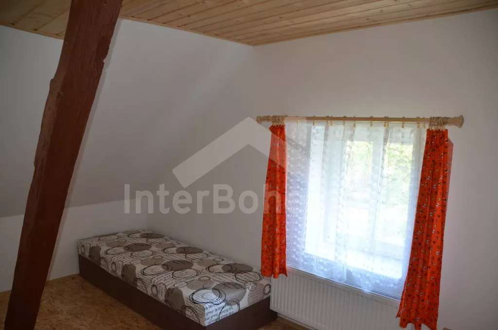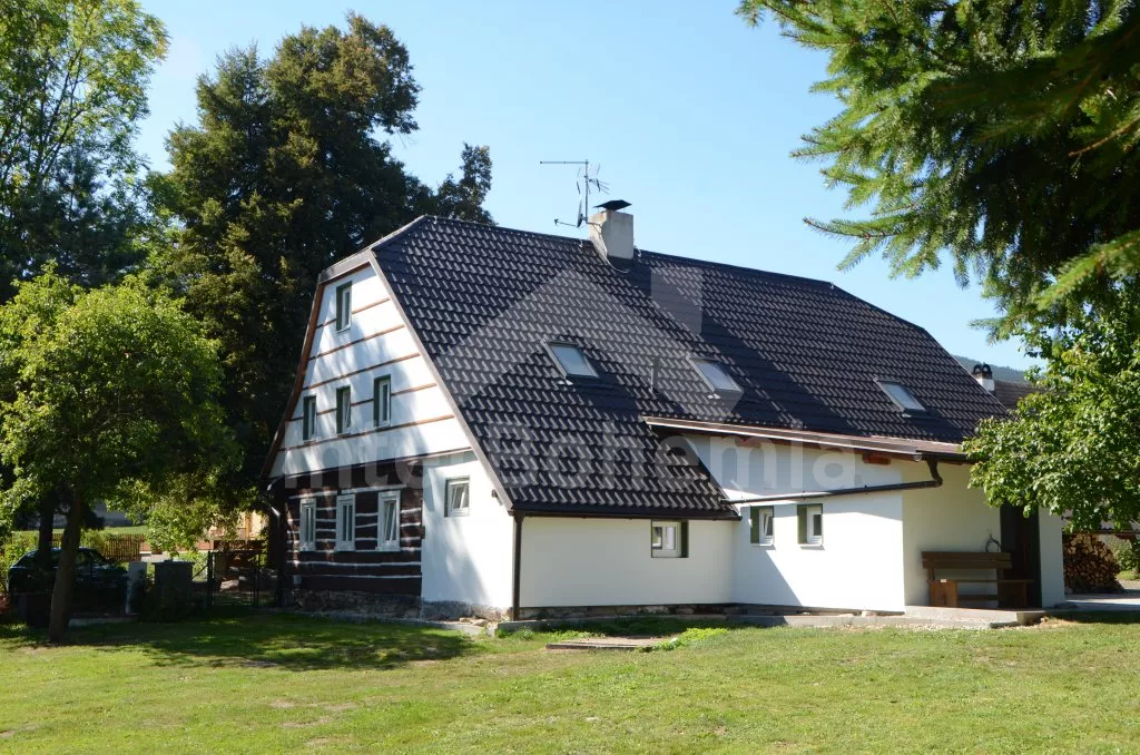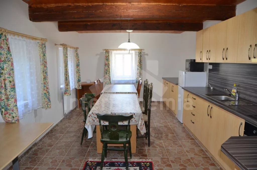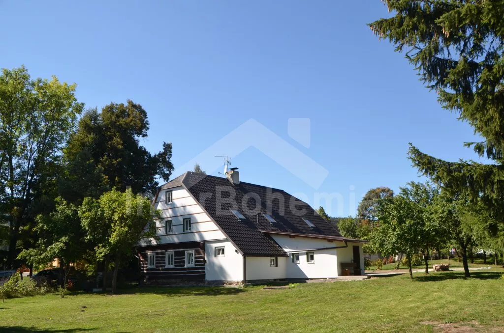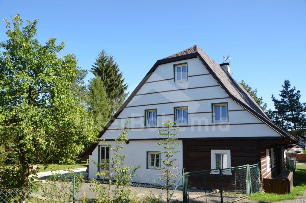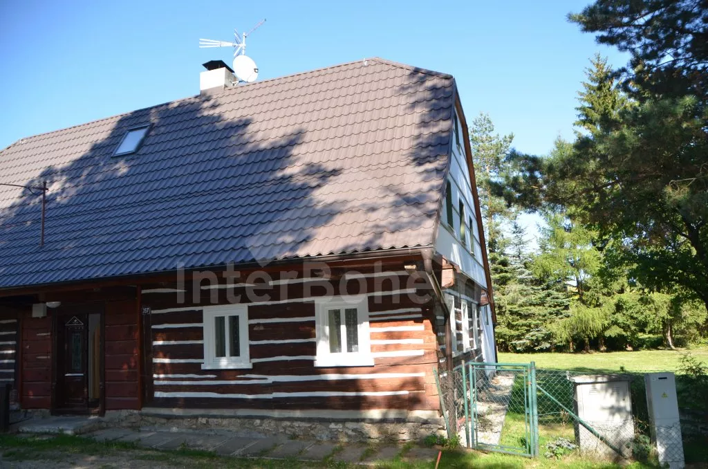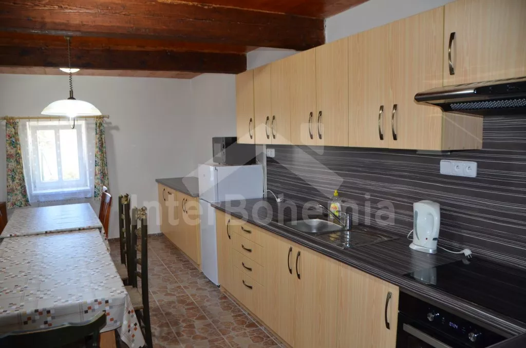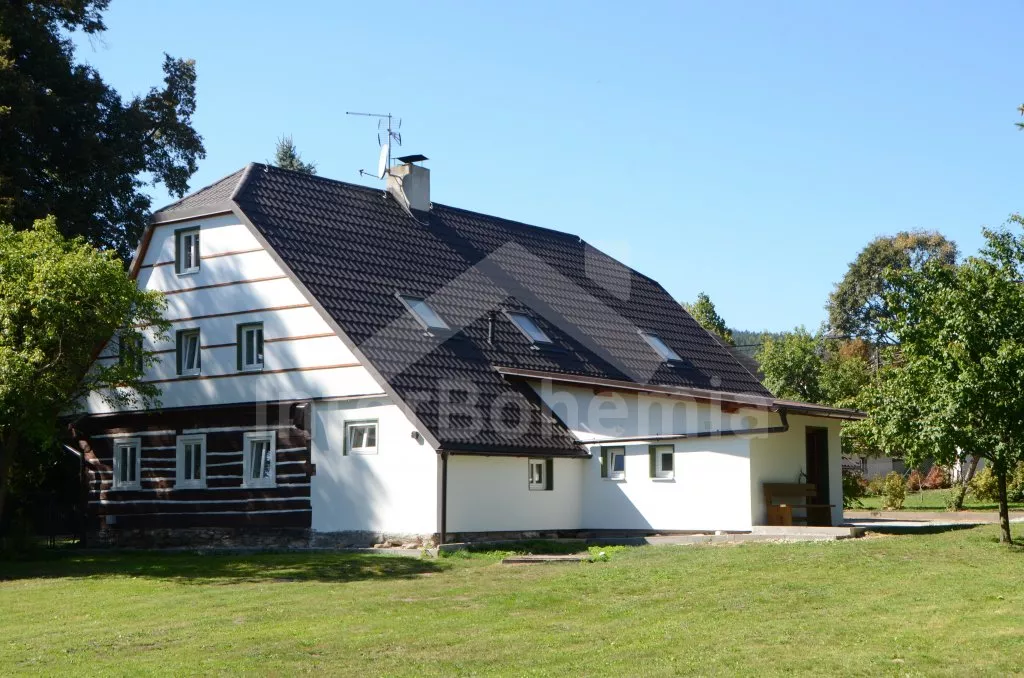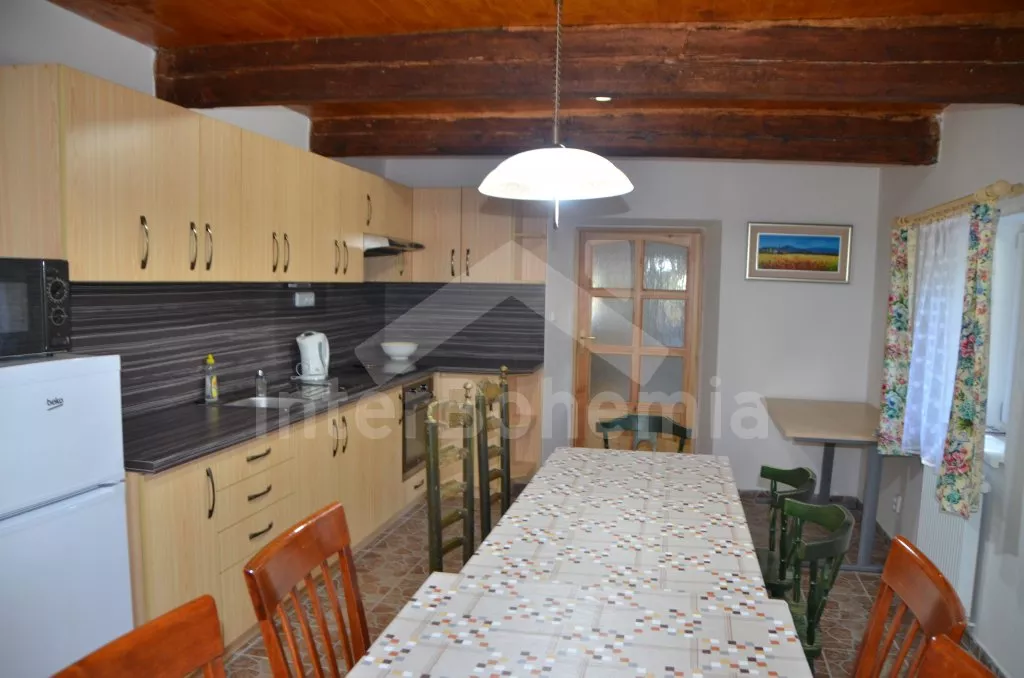 Volně stojící, prostorná roubená chalupa, v roce 2018 kompletně zrekonstruovaná, příjemně zařízená. Přízemí: vstup, chodba, obývací místnost se sedací soupravou, krbovými kamny a televizí se satelitním příjmem. Kuchyně s jídelním stolem, lednicí s mrazákem, elektrickým sporákem s horkovzdušnou troubou a sklokeramickou deskou, myčkou na nádobí, mikrovlnnou troubou a varnou konvicí. Sklípek se stolem, lavicemi a kuchyňkou. Koupelna s vanou a umyvadlem. Zadní vchod, chodba a dvě WC s umyvadly. Zvenčí místnost na kola a lyže. První patro: hala s kuchyňkou, chodba se vstupem do obývací ložnice s televizí, rozkládacím dvoulůžkem a jedním samostatným lůžkem a vstup do ložnice se dvěma samostatnými lůžky, koupelna se sprchou, umyvadlem a WC. Z haly je chodba se vstupem do obývací ložnice s televizí a dvěma rozkládacími gauči jako dvě dvoulůžka a vstup do ložnice se dvěma samostatnými lůžky. Koupelna se sprchou, umyvadlem a WC. Podkroví: hala a dvě ložnice, každá se čtyřmi lůžky. Vytápění a teplá voda na plyn. Velká zahrada, zahradní nábytek, gril a bazén průměr 3,6 m. Vlastní parkoviště. Objekt je vhodný pro maximálně 13/15 osob.