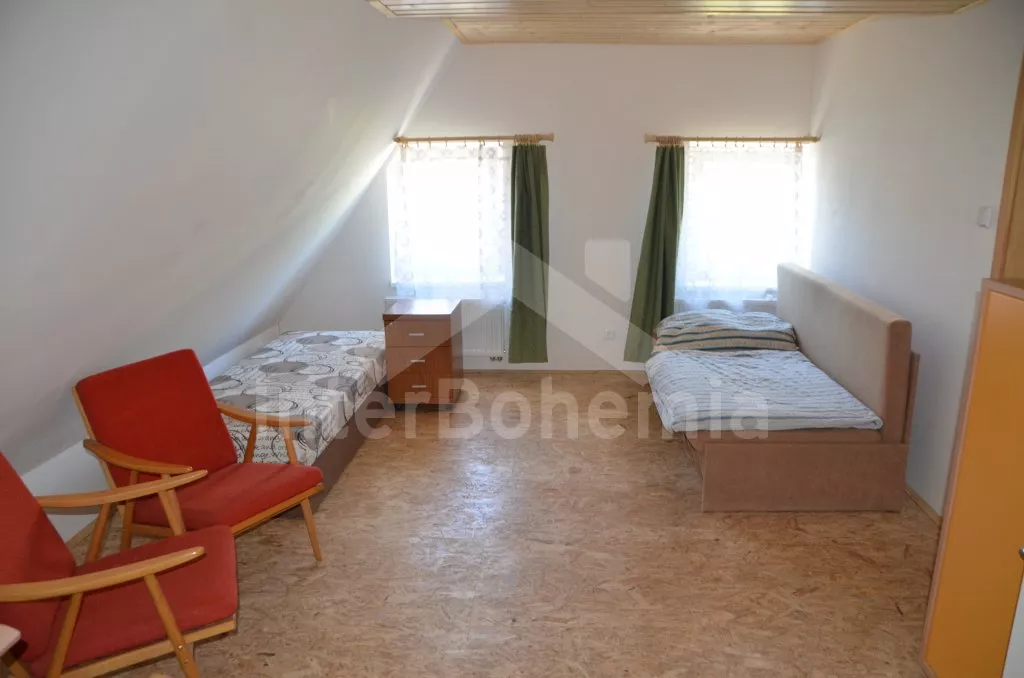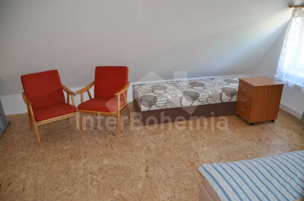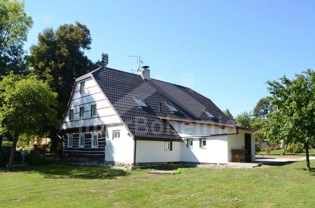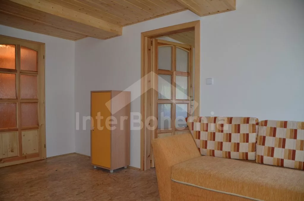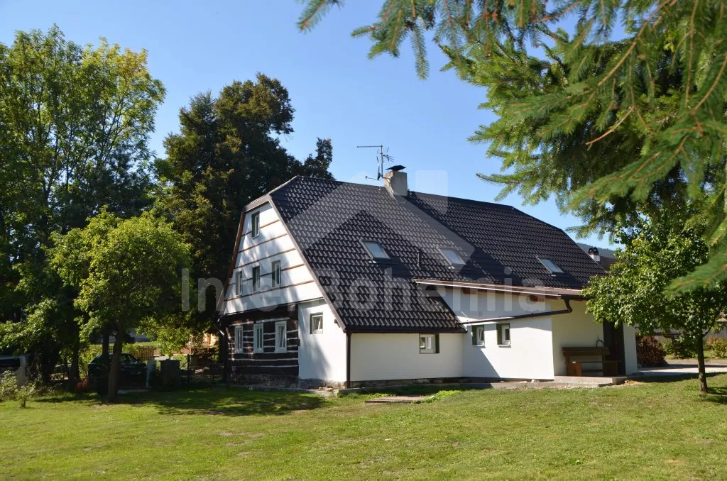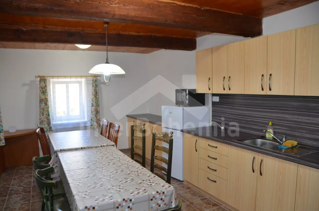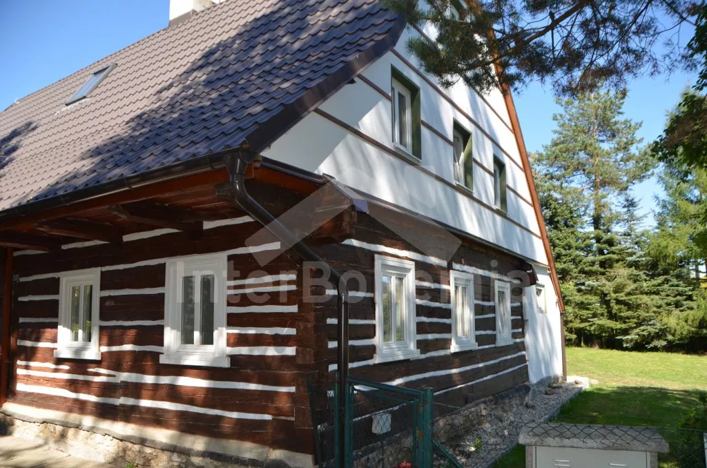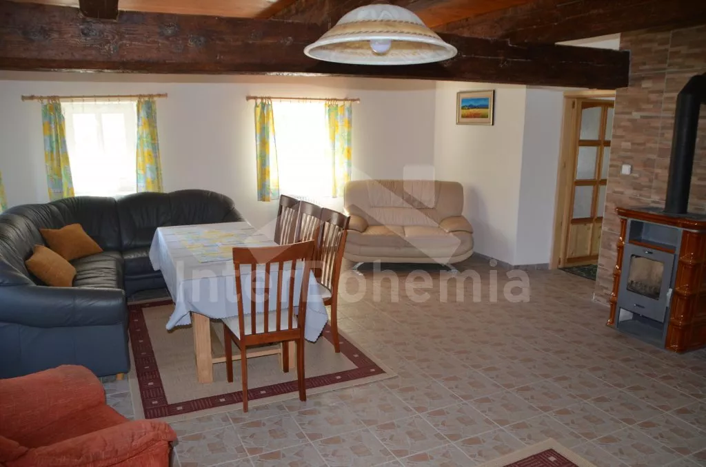 Volně stojící, prostorná roubená chalupa, v roce 2018 kompletně zrekonstruovaná, příjemně zařízená. Přízemí: vstup, chodba, obývací místnost se sedací soupravou, krbovými kamny a televizí se satelitním příjmem. Kuchyně s jídelním stolem, lednicí s mrazákem, elektrickým sporákem s horkovzdušnou troubou a sklokeramickou deskou, myčkou na nádobí, mikrovlnnou troubou a varnou konvicí. Sklípek se stolem, lavicemi a kuchyňkou. Koupelna s vanou a umyvadlem. Zadní vchod, chodba a dvě WC s umyvadly. Zvenčí místnost na kola a lyže. První patro: hala s kuchyňkou, chodba se vstupem do obývací ložnice s televizí, rozkládacím dvoulůžkem a jedním samostatným lůžkem a vstup do ložnice se dvěma samostatnými lůžky, koupelna se sprchou, umyvadlem a WC. Z haly je chodba se vstupem do obývací ložnice s televizí a dvěma rozkládacími gauči jako dvě dvoulůžka a vstup do ložnice se dvěma samostatnými lůžky. Koupelna se sprchou, umyvadlem a WC. Podkroví: hala a dvě ložnice, každá se čtyřmi lůžky. Vytápění a teplá voda na plyn. Velká zahrada, zahradní nábytek, gril a bazén průměr 3,6 m. Vlastní parkoviště. Objekt je vhodný pro maximálně 13/15 osob.