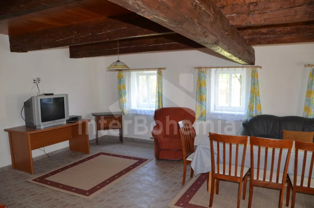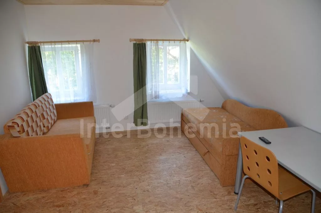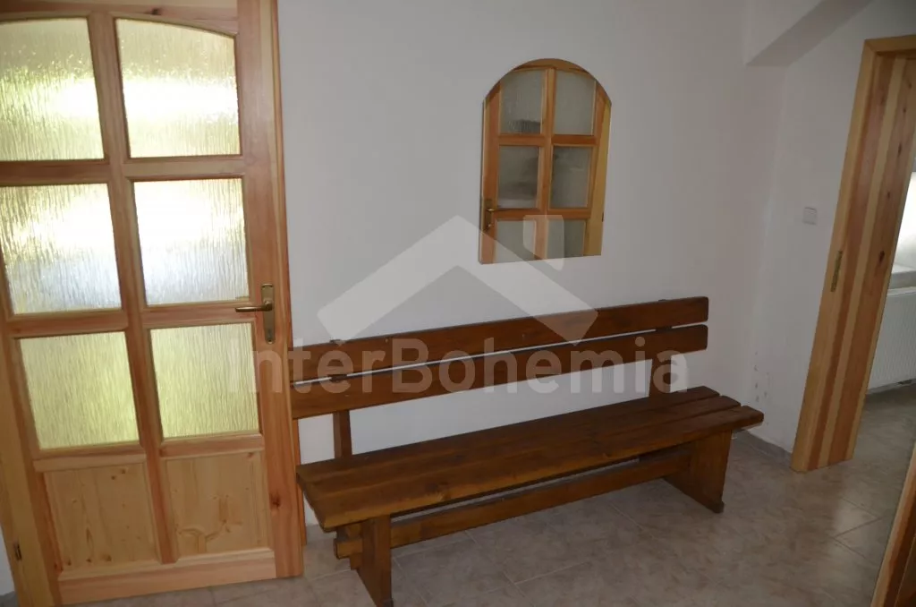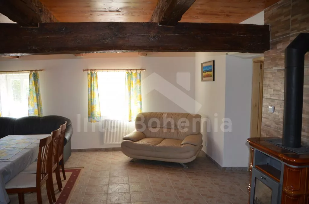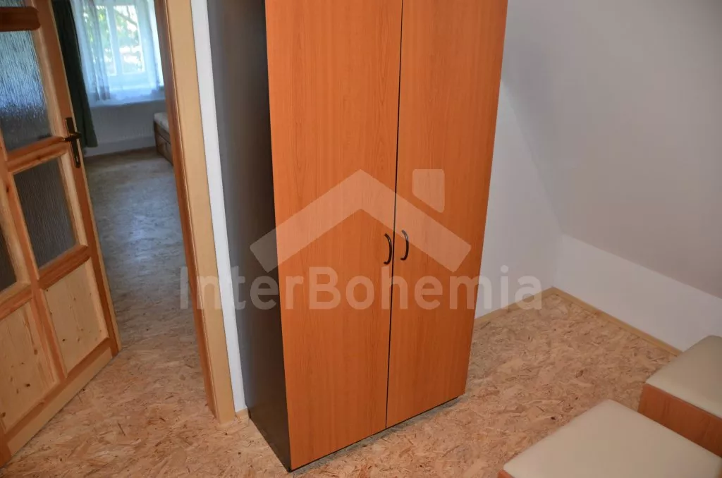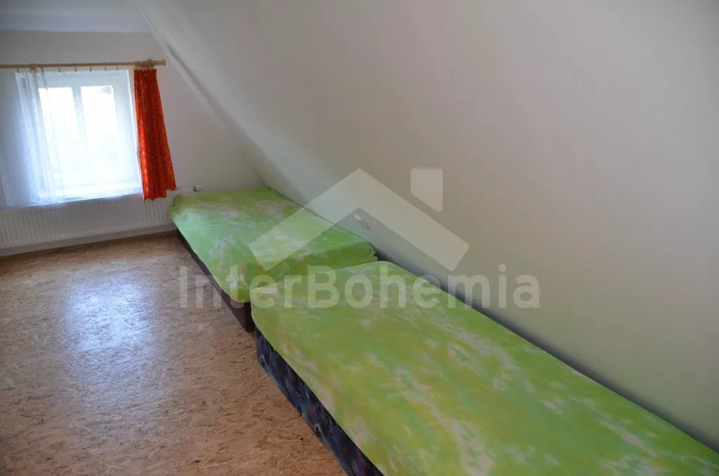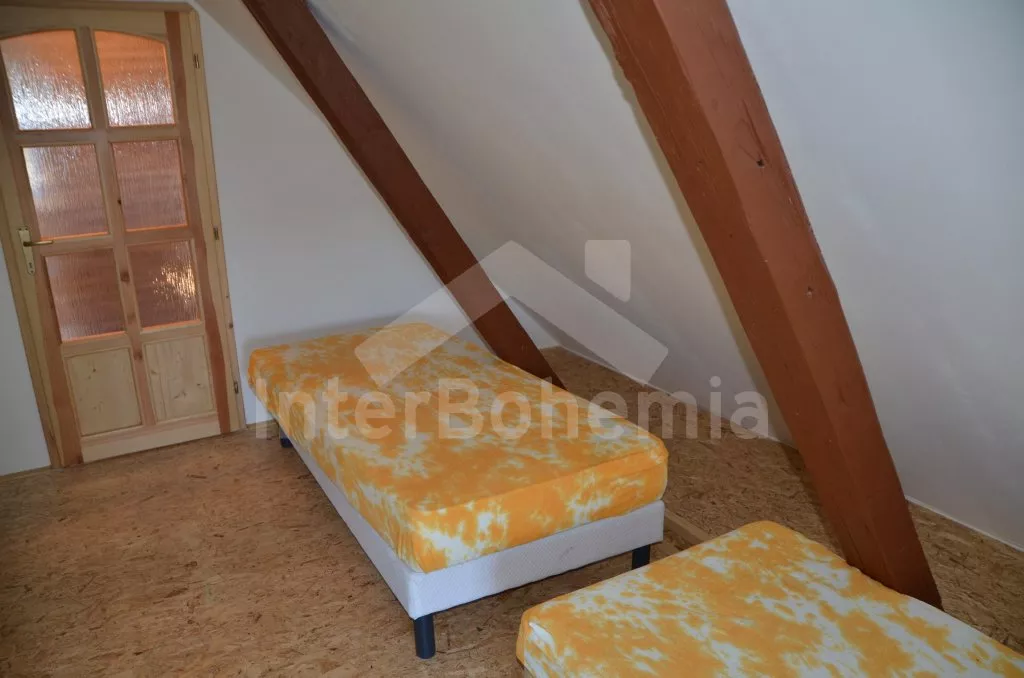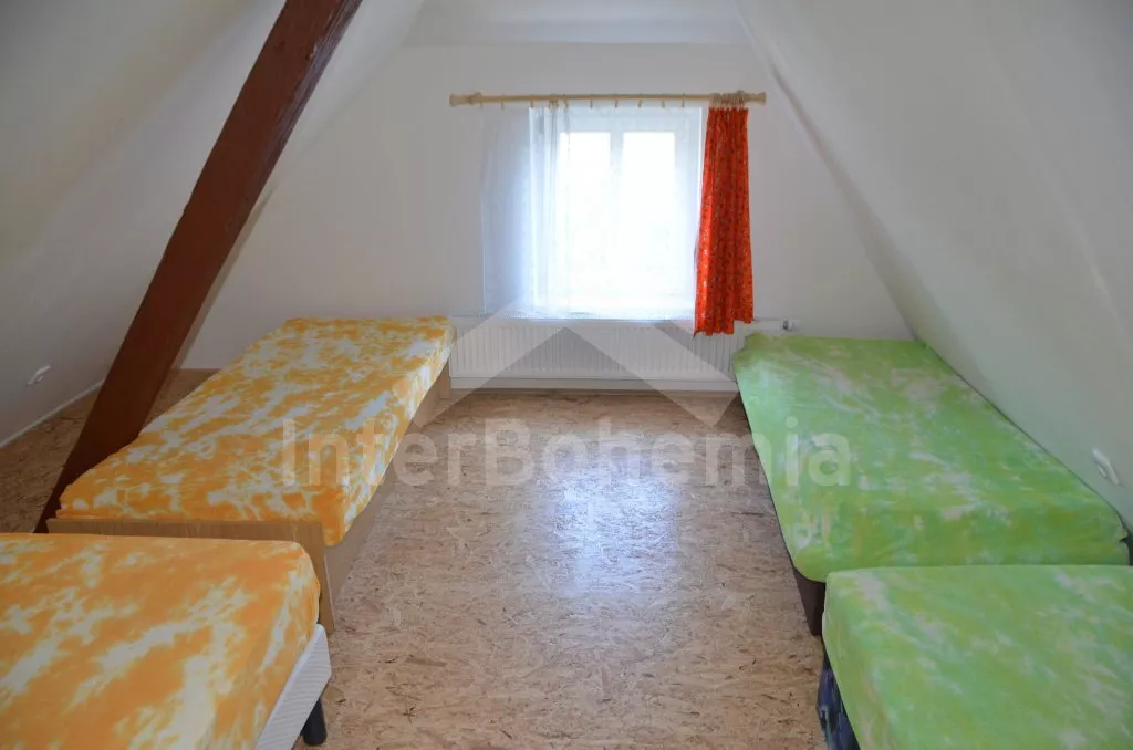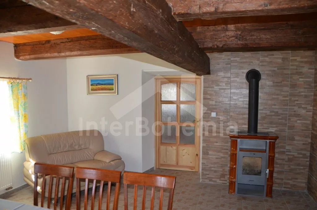 Volně stojící, prostorná roubená chalupa, v roce 2018 kompletně zrekonstruovaná, příjemně zařízená. Přízemí: vstup, chodba, obývací místnost se sedací soupravou, krbovými kamny a televizí se satelitním příjmem. Kuchyně s jídelním stolem, lednicí s mrazákem, elektrickým sporákem s horkovzdušnou troubou a sklokeramickou deskou, myčkou na nádobí, mikrovlnnou troubou a varnou konvicí. Sklípek se stolem, lavicemi a kuchyňkou. Koupelna s vanou a umyvadlem. Zadní vchod, chodba a dvě WC s umyvadly. Zvenčí místnost na kola a lyže. První patro: hala s kuchyňkou, chodba se vstupem do obývací ložnice s televizí, rozkládacím dvoulůžkem a jedním samostatným lůžkem a vstup do ložnice se dvěma samostatnými lůžky, koupelna se sprchou, umyvadlem a WC. Z haly je chodba se vstupem do obývací ložnice s televizí a dvěma rozkládacími gauči jako dvě dvoulůžka a vstup do ložnice se dvěma samostatnými lůžky. Koupelna se sprchou, umyvadlem a WC. Podkroví: hala a dvě ložnice, každá se čtyřmi lůžky. Vytápění a teplá voda na plyn. Velká zahrada, zahradní nábytek, gril a bazén průměr 3,6 m. Vlastní parkoviště. Objekt je vhodný pro maximálně 13/15 osob.