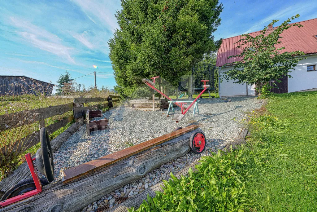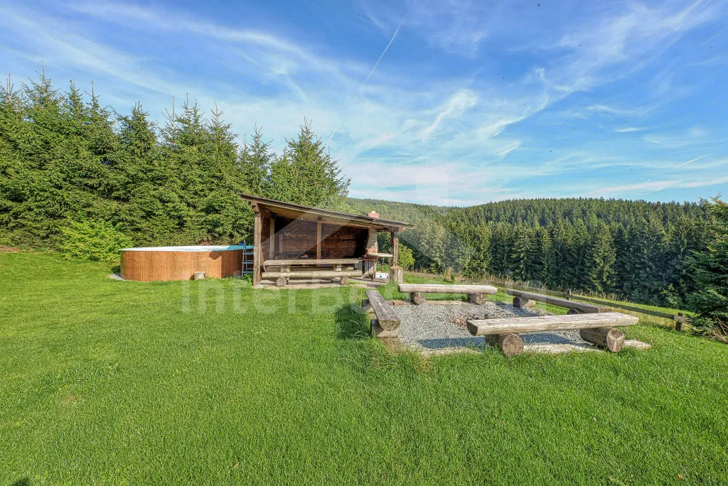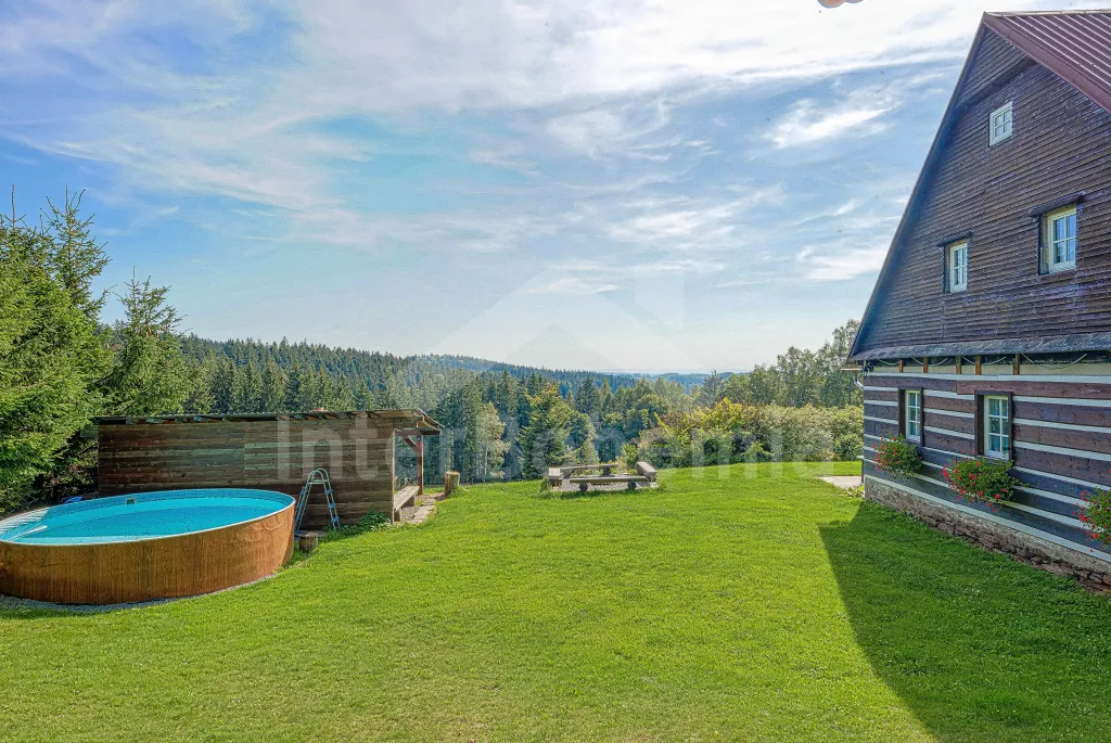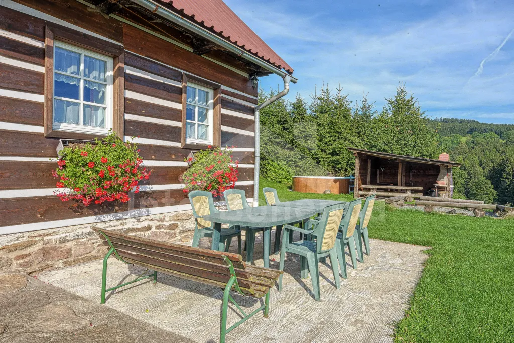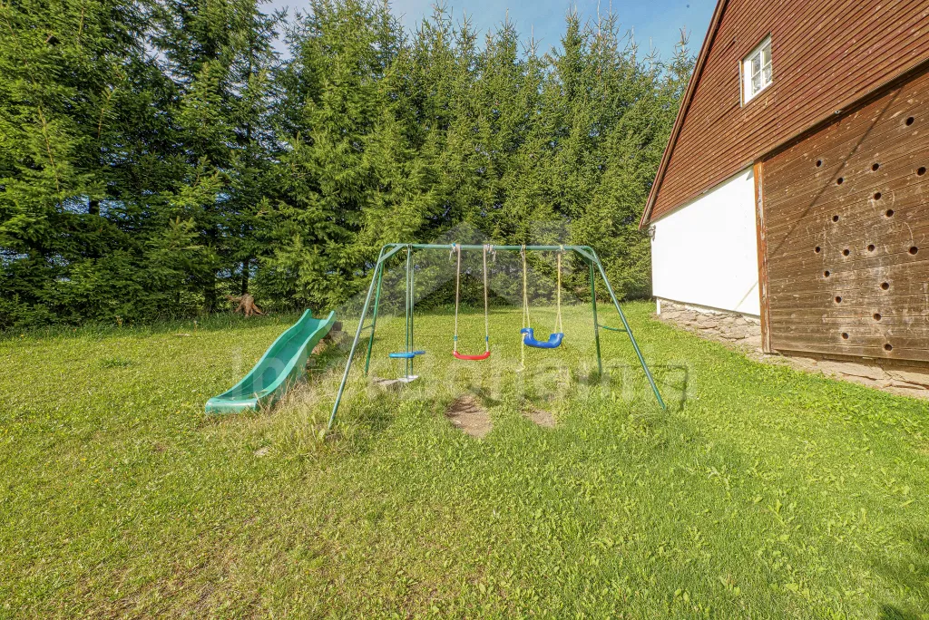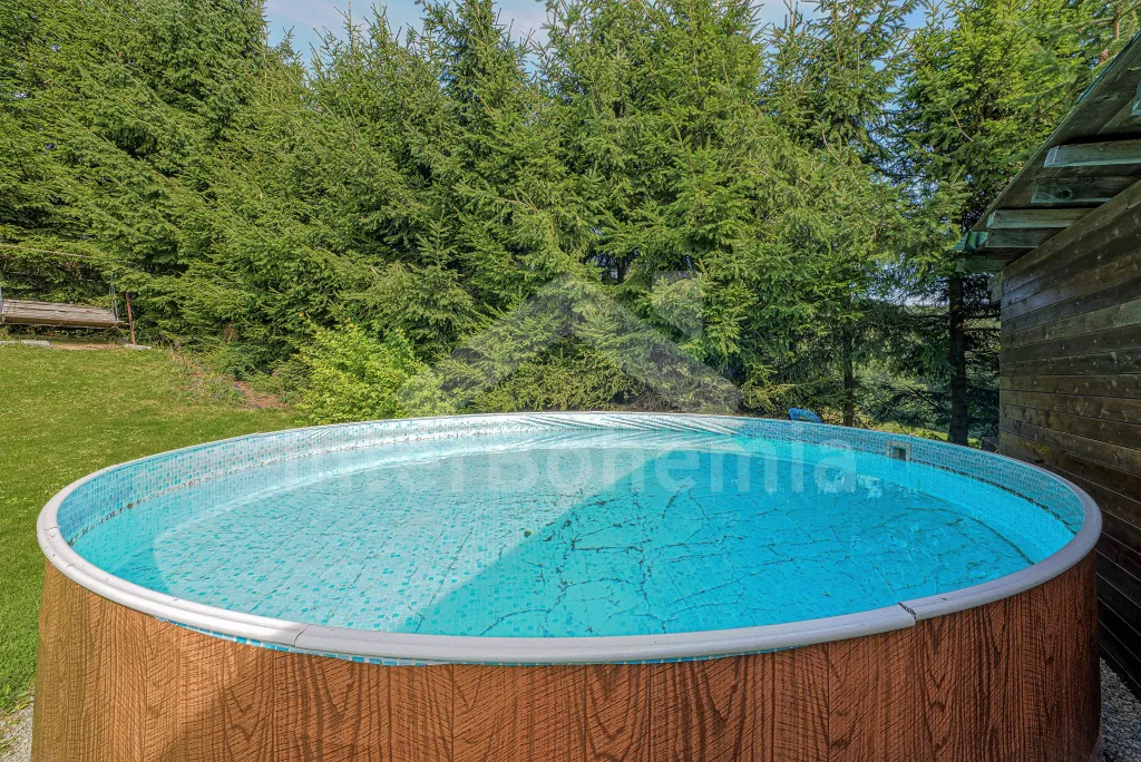 K chalupě náleží rozlehlá neoplocená zahrada s krytou dřevěnou pergolou - posezení, krb, ohniště, dále nadzemní kruhový bazén s filtrací, zahradní houpačka, pro děti houpačky, skluzavka a trampolína. Parkování pro až 8 automobilů.