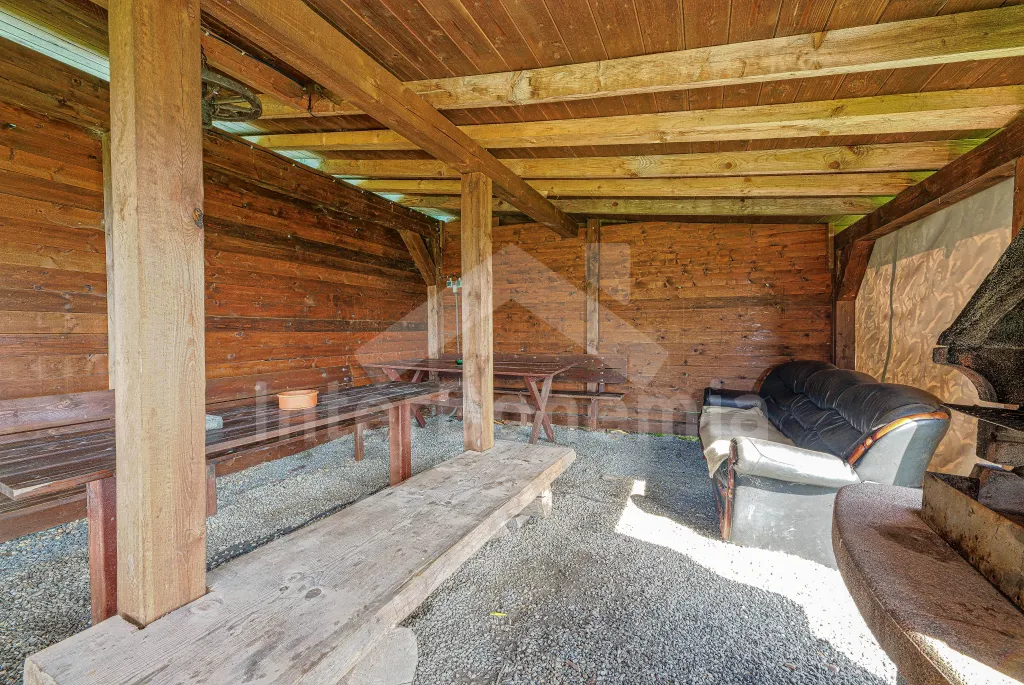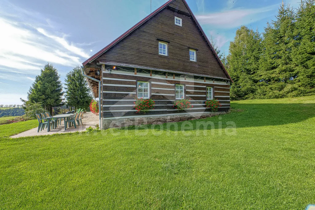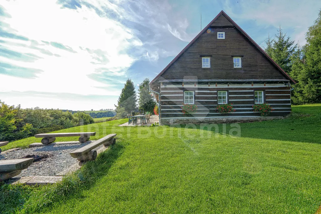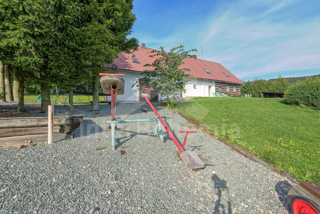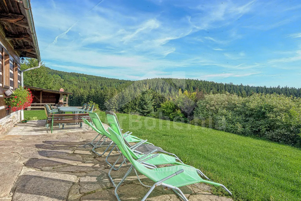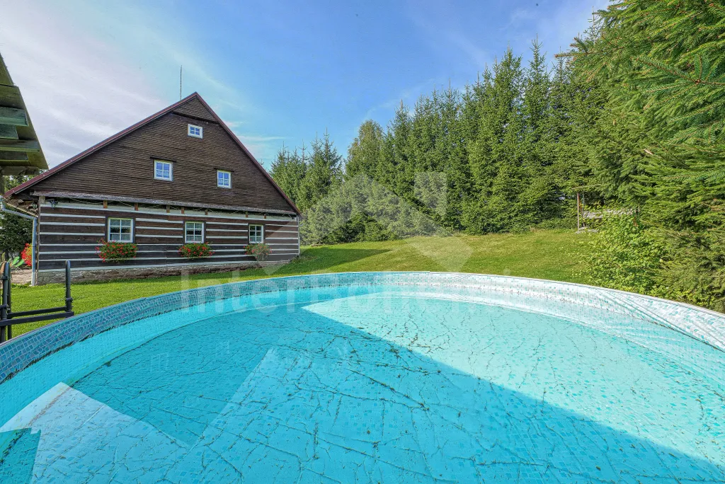 K chalupě náleží rozlehlá neoplocená zahrada s krytou dřevěnou pergolou - posezení, krb, ohniště, dále nadzemní kruhový bazén s filtrací, zahradní houpačka, pro děti houpačky, skluzavka a trampolína. Parkování pro až 8 automobilů.