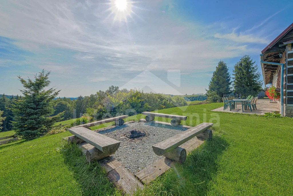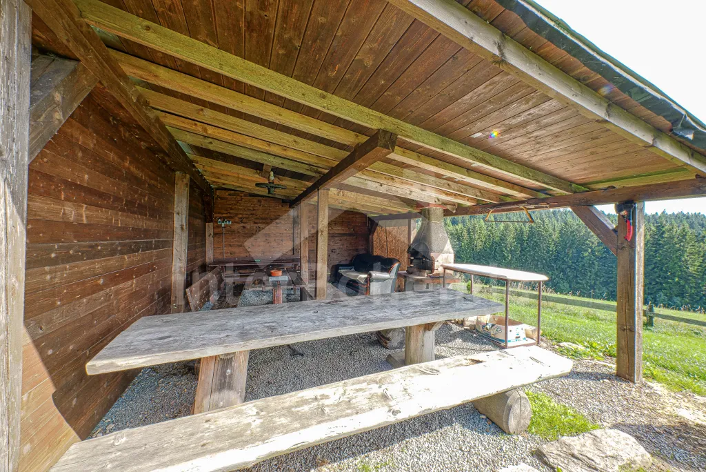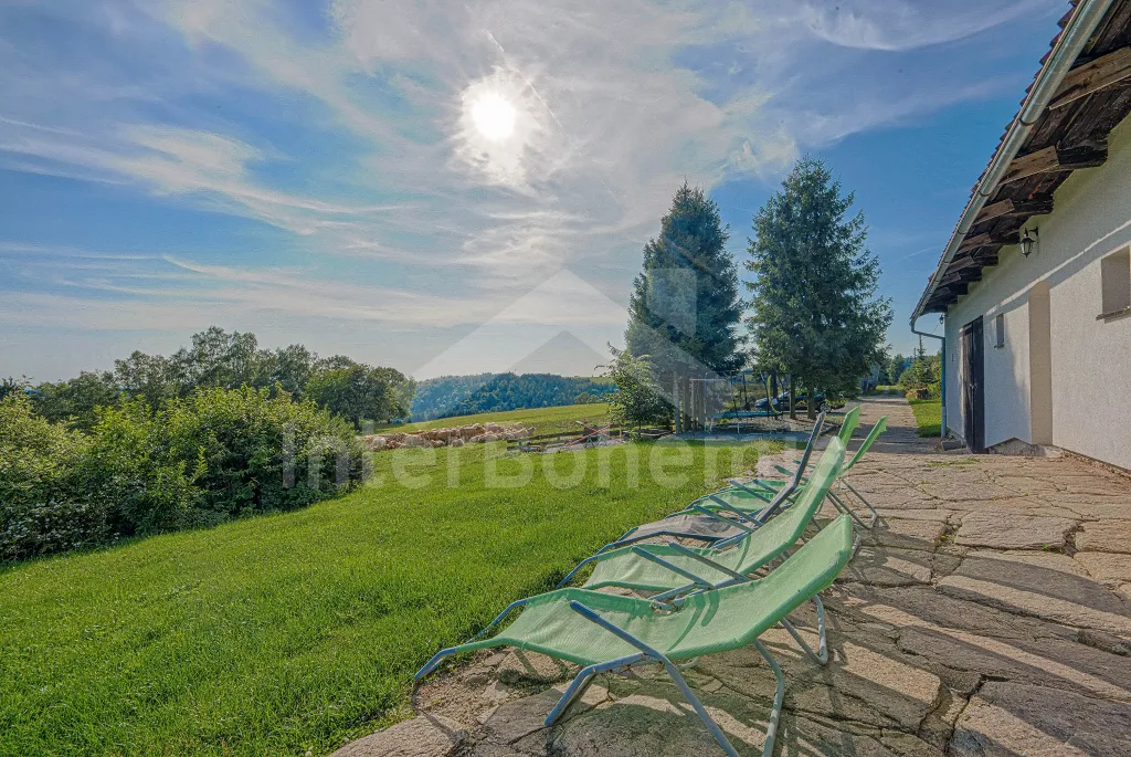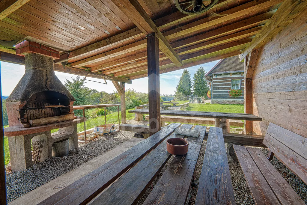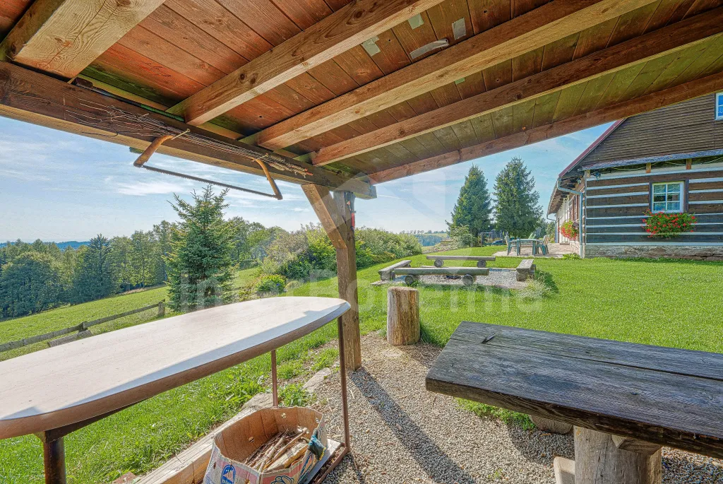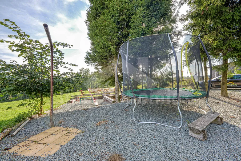 K chalupě náleží rozlehlá neoplocená zahrada s krytou dřevěnou pergolou - posezení, krb, ohniště, dále nadzemní kruhový bazén s filtrací, zahradní houpačka, pro děti houpačky, skluzavka a trampolína. Parkování pro až 8 automobilů.