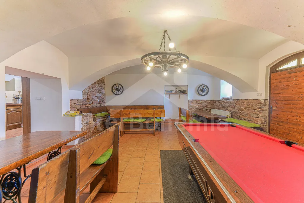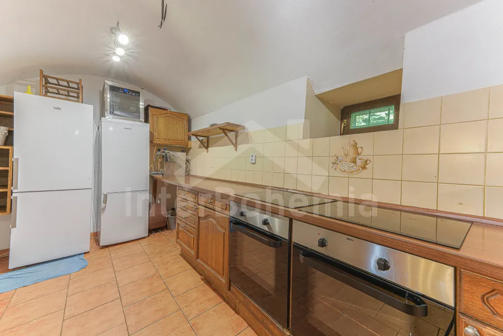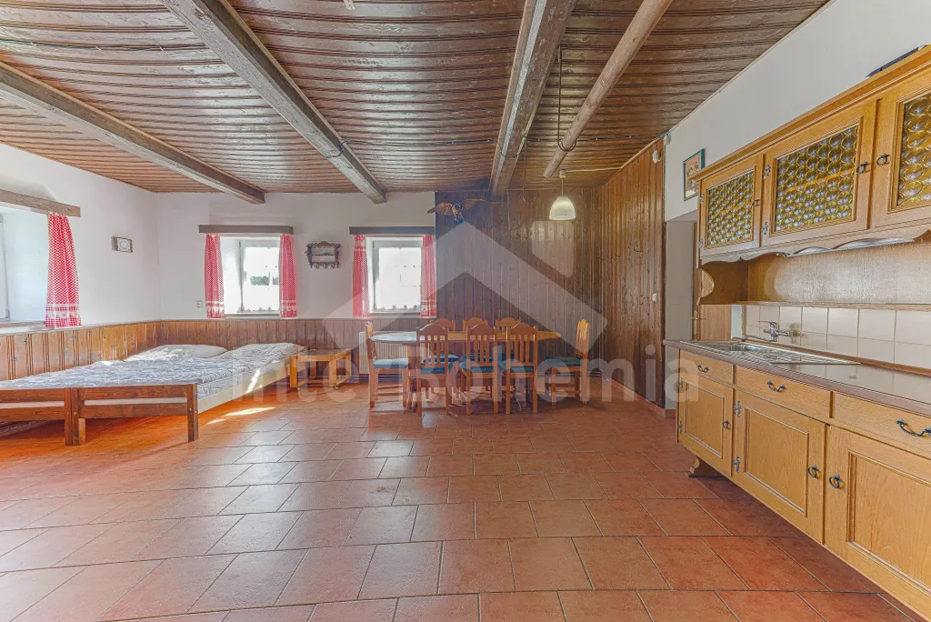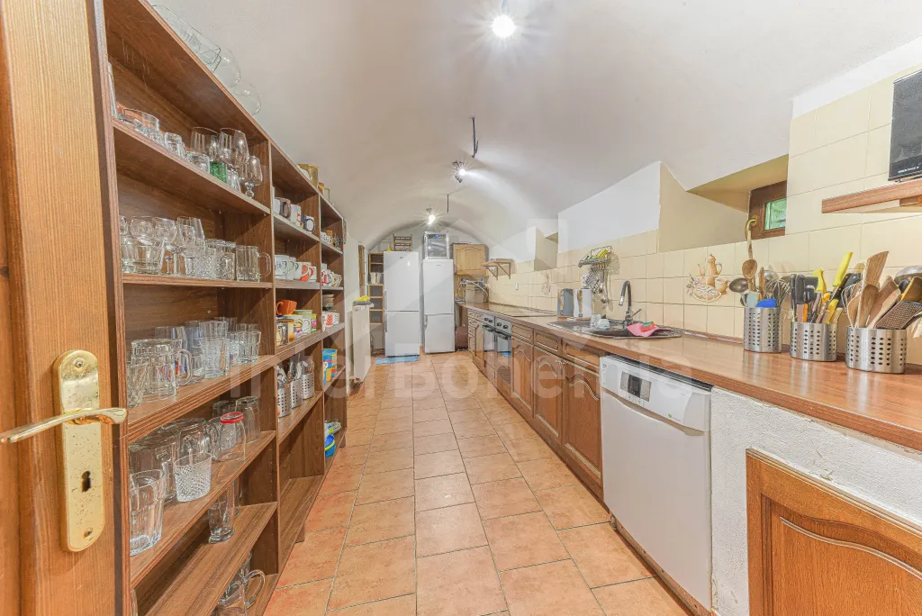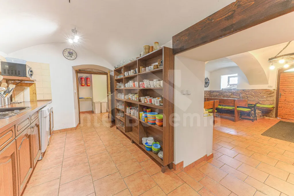 Z centrální chodby v levém křídle chalupy k dispozici bohatě vybavená kuchyně s dvěma sklokeramickými varnými deskami, dvě trouby, mikrovlnná trouba, lednice s mrazákem, kávovar, rychlovarná konvice, myčka na nádobí, výčepní zařízení. Z kuchyně vstup do společenské místnosti s posezením, kulečníkem, šipkami a LCD televizí.