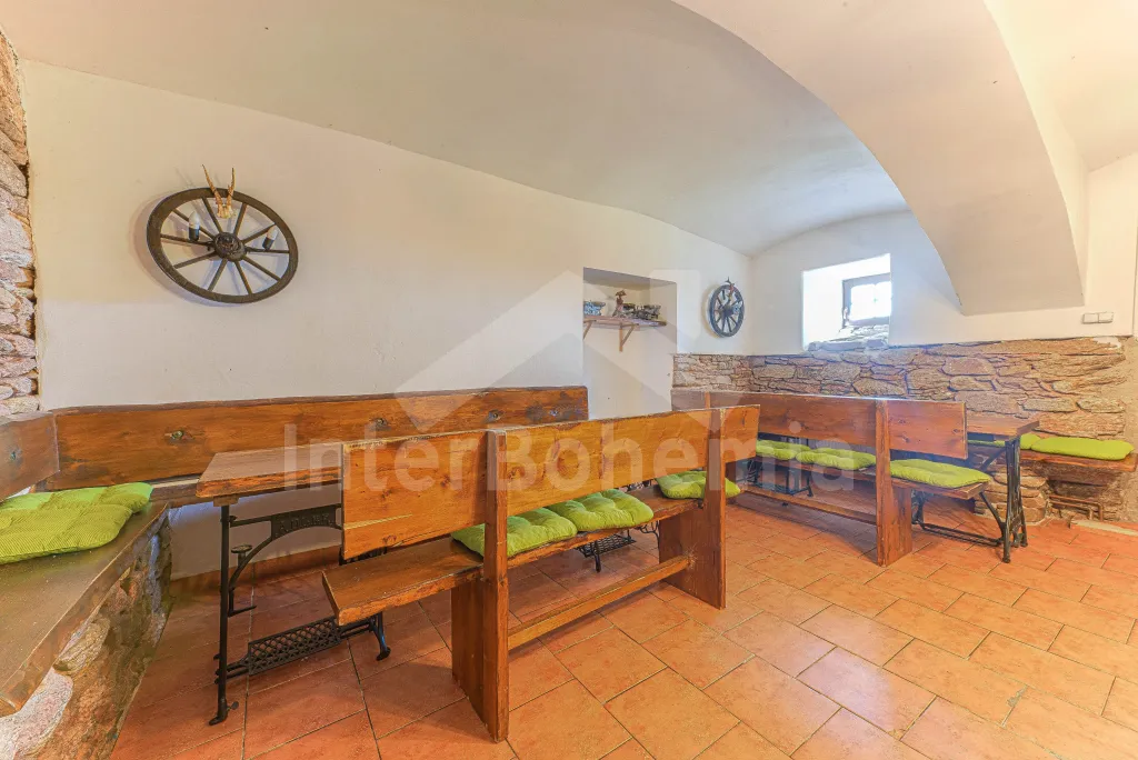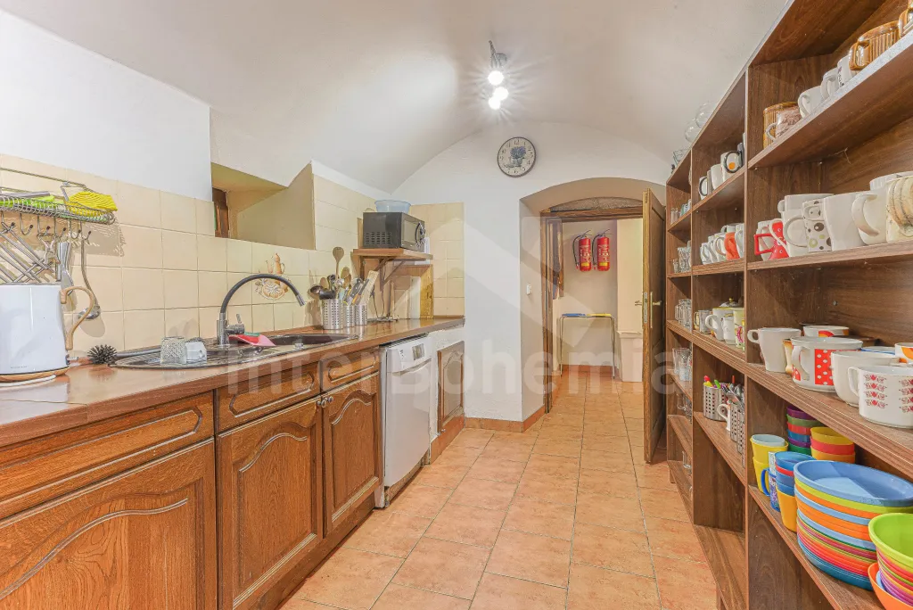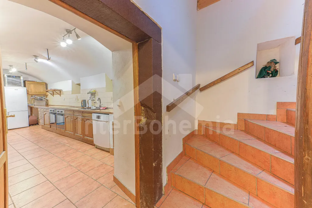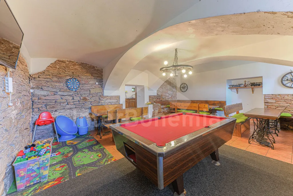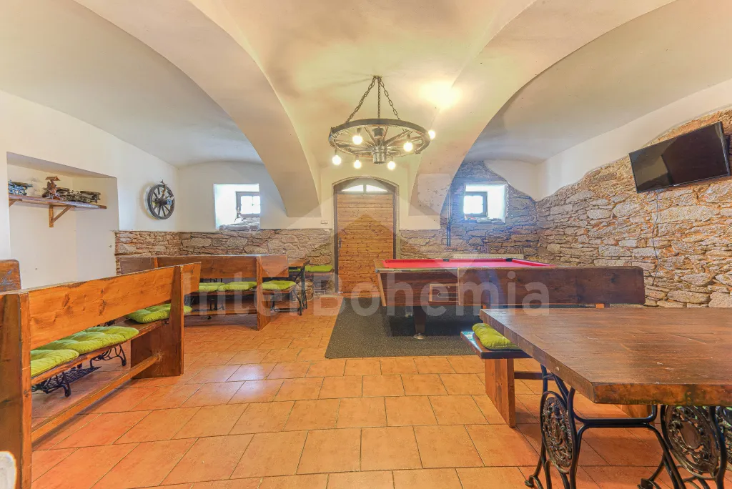 Z centrální chodby v levém křídle chalupy k dispozici bohatě vybavená kuchyně s dvěma sklokeramickými varnými deskami, dvě trouby, mikrovlnná trouba, lednice s mrazákem, kávovar, rychlovarná konvice, myčka na nádobí, výčepní zařízení. Z kuchyně vstup do společenské místnosti s posezením, kulečníkem, šipkami a LCD televizí.