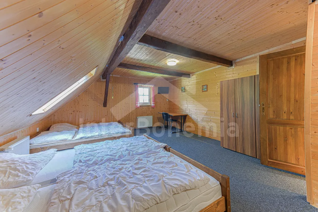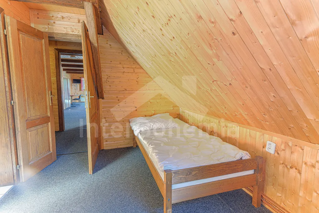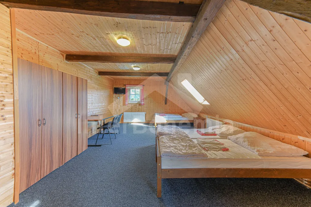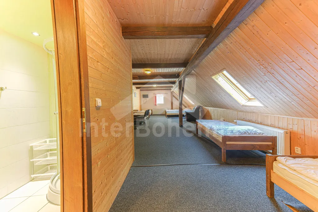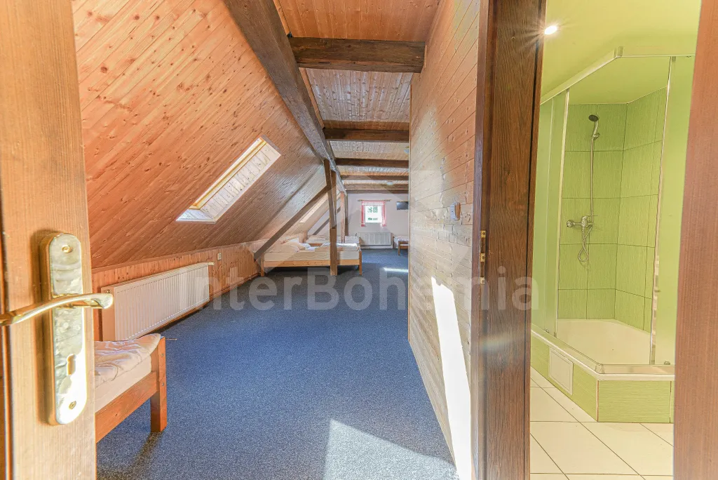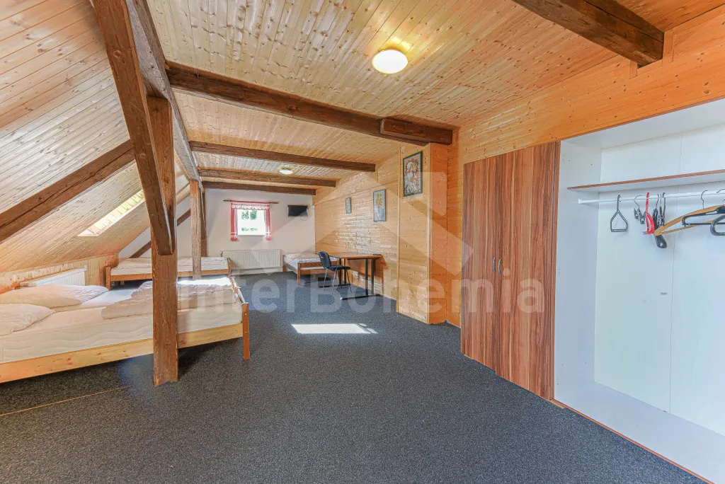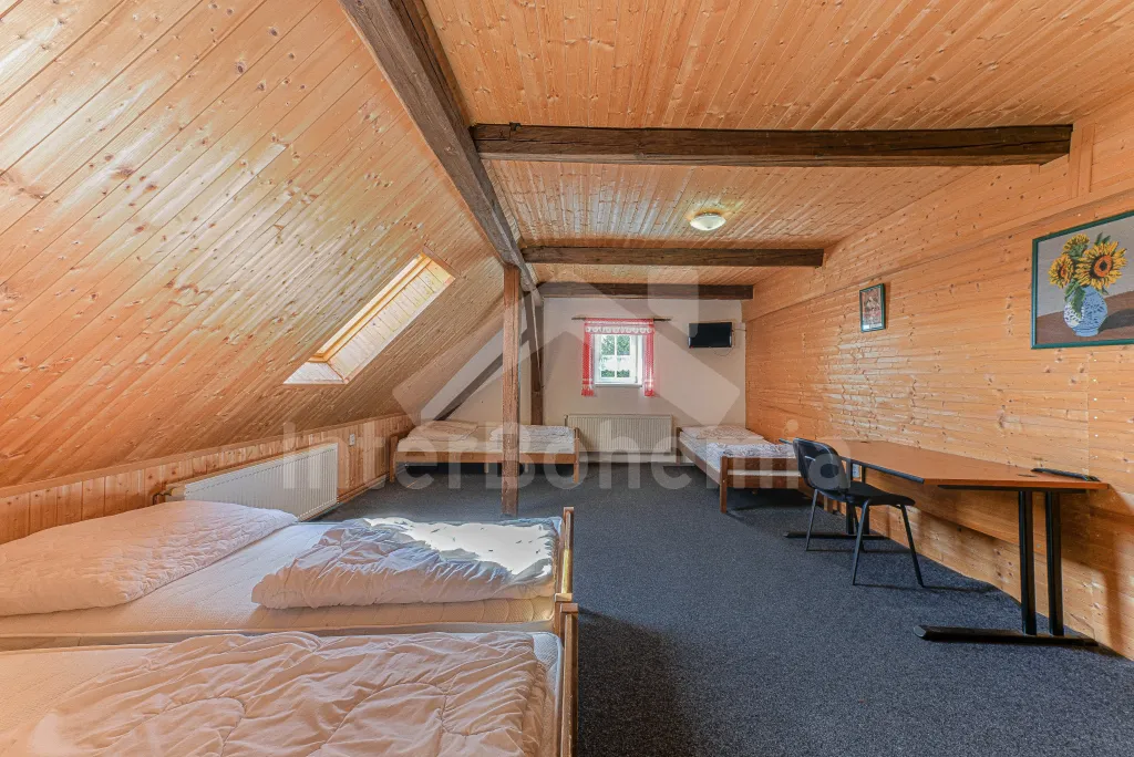 Z centrální chodby po schodech nahoru vstup do podkroví se 4-mi samostatnými ložnicemi. První ložnice s jedním dvoulůžkem, dvěma jednolůžky, televizí a vlastní koupelnou se sprchovým koutem, umyvadlem a wc. Druhá ložnice s jedním dvoulůžkem, čtyřmi jednolůžky, televizí a samostatnou koupelnou se sprchovým koutem, umyvadlem a wc. Třetí ložnice s jedním dvoulůžkem, dvěma jednolůžky, televizí a opět samostatná koupelna se sprchovým koutem, umyvadlem a wc. Čtvrtá ložnice s dvoulůžkem, třemi jednolůžky, televizí a koupelnou se sprchovým koutem, umyvadlem a wc. Ústřední vytápění elektrokotlem, nebo kotlem na uhlí.