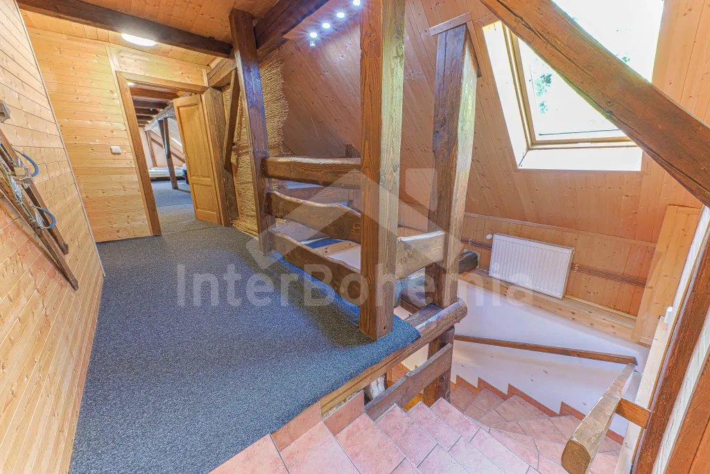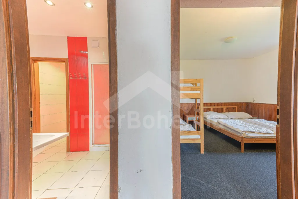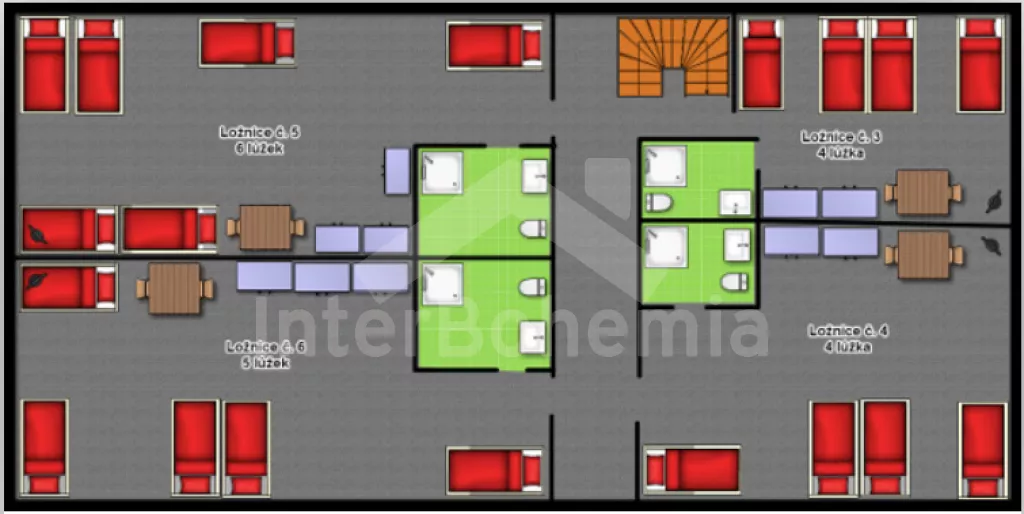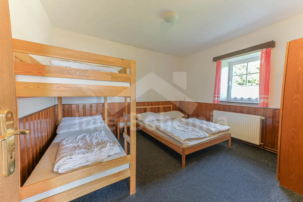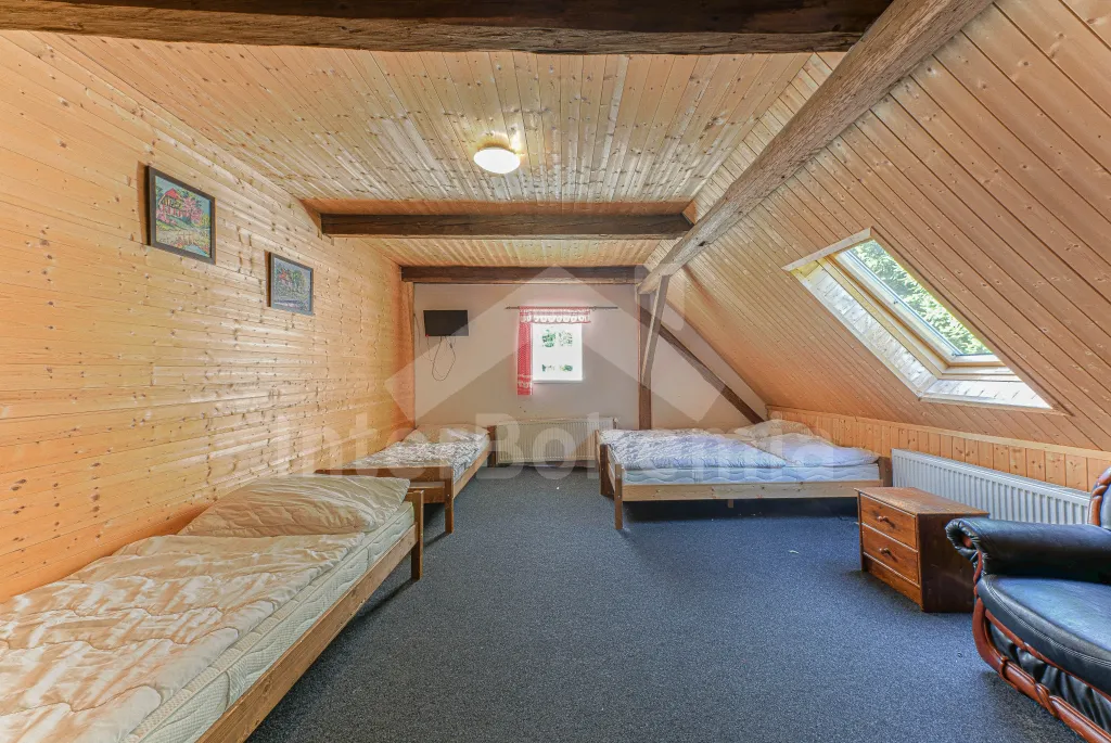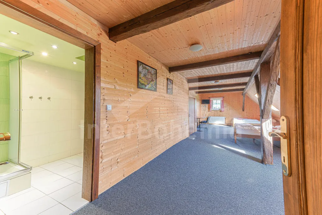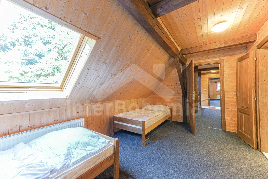 Z centrální chodby po schodech nahoru vstup do podkroví se 4-mi samostatnými ložnicemi. První ložnice s jedním dvoulůžkem, dvěma jednolůžky, televizí a vlastní koupelnou se sprchovým koutem, umyvadlem a wc. Druhá ložnice s jedním dvoulůžkem, čtyřmi jednolůžky, televizí a samostatnou koupelnou se sprchovým koutem, umyvadlem a wc. Třetí ložnice s jedním dvoulůžkem, dvěma jednolůžky, televizí a opět samostatná koupelna se sprchovým koutem, umyvadlem a wc. Čtvrtá ložnice s dvoulůžkem, třemi jednolůžky, televizí a koupelnou se sprchovým koutem, umyvadlem a wc. Ústřední vytápění elektrokotlem, nebo kotlem na uhlí.