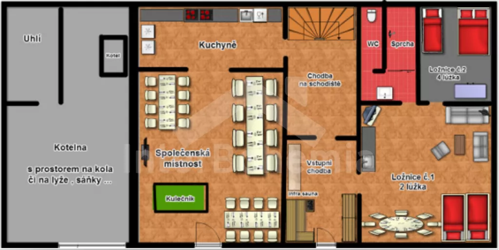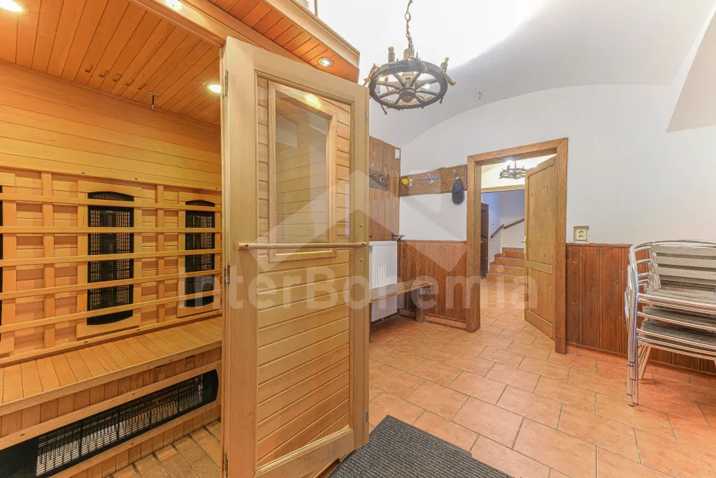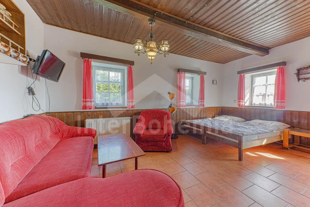 Samostatně stojící horská chalupa, prostorná, s bohatě zařízenou velkou kuchyní, 5-ti koupelnami a velkou společenskou místností s kulečníkem. Za hlavním vstupem se nachází centrální chodba s infrasaunou. V pravém křídle chalupy je situována obývací místnost s posezením, LCD televizí, jídelním stolem pro 8 osob, kuchyňským pultem a manželským dvoulůžkem. Z obývací místnosti vstup do první ložnice s dvoulůžkem a palandou. V samostatné koupelně sprchový kout, umyvadlo a toaleta.