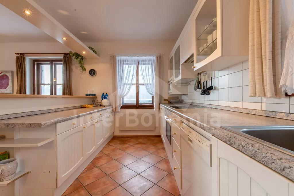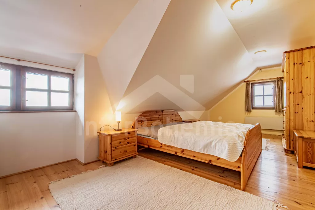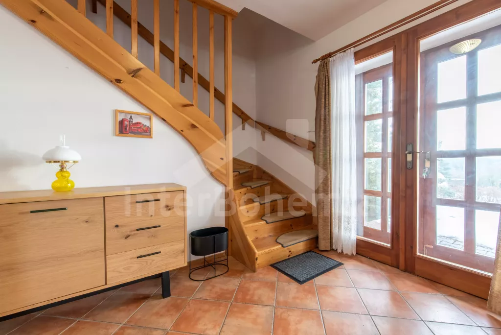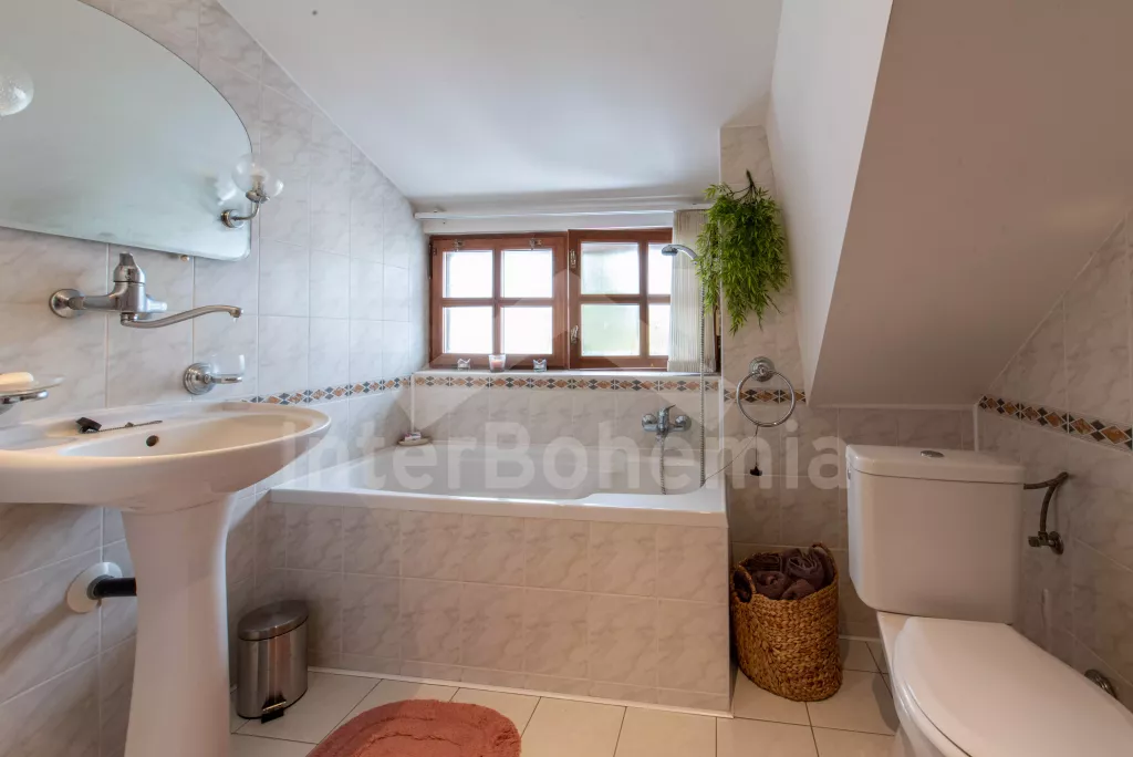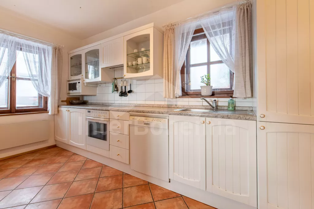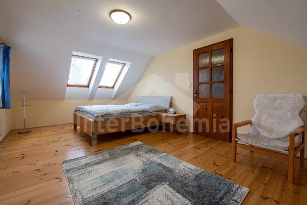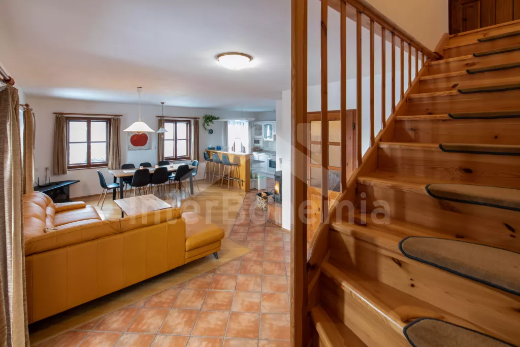 Prostorná a stylově vybavená chalupa s velkým bazénem a zastřešenou pergolou. Chodba, vstup do obytné místnosti s kuchyňským koutem. Obývací místnost disponuje rozkládací koženou pohovkou (extra dvojlůžko), konferenčním stolkem, jídelním stolem pro 8 osob, krbem, rádiem a TV. Vkusně zařízená kuchyňská linka s lednicí a mrazákem, sklokeramickou deskou, troubou, mikrovlnnou troubou, rychlovarnou konvicí, nádobím a myčkou na nádobí. Tradiční sporák na tuhá paliva. Koupelna se sprchou, umyvadlem, WC a moderní pračkou. V prvním patře celkem 3 ložnice. První ložnice s dvoulůžkem a křeslem. Druhá ložnice s dvoulůžkem, úložným prostorem a dětskou postýlkou. Třetí ložnice s jednolůžkem a rozkládací sedačkou. Koupelna s vanou, umyvadlem a toaletou. Objekt je vytápěn krbem s vyvedenými průduchy a vestavěnými přímotopy. Oplocená a velmi prostorná zahrada se zapuštěným bazénem, posezením pod zastřešenou pergolou a ohništěm. K dispozici gril jak na tuhá paliva, tak plynový. Parkování před objektem či na pozemku až pro 4 automobily.