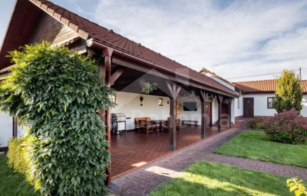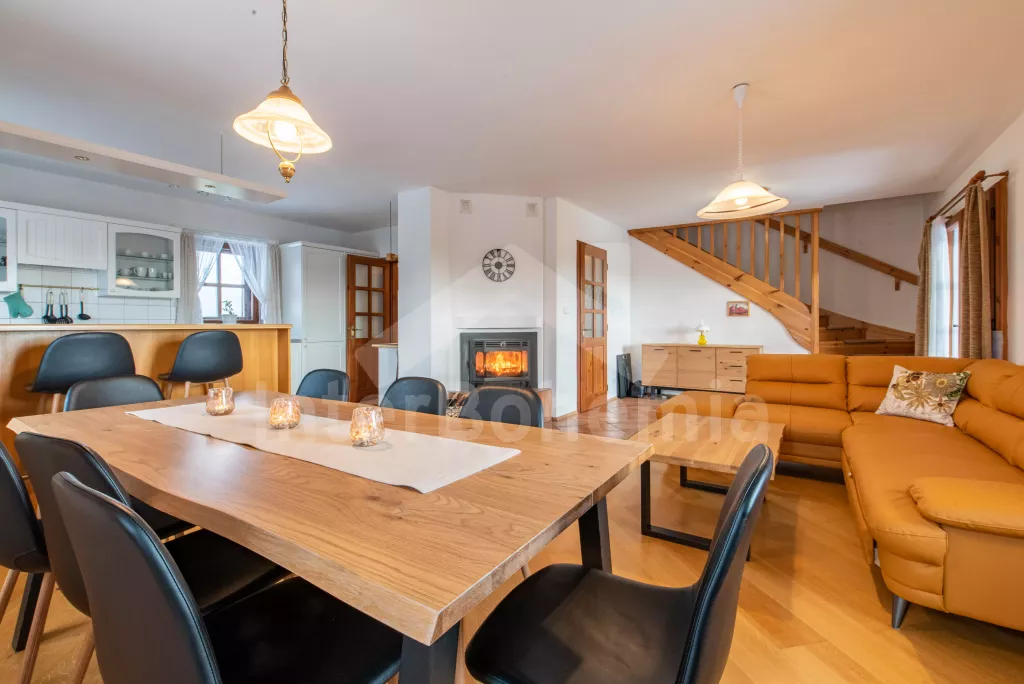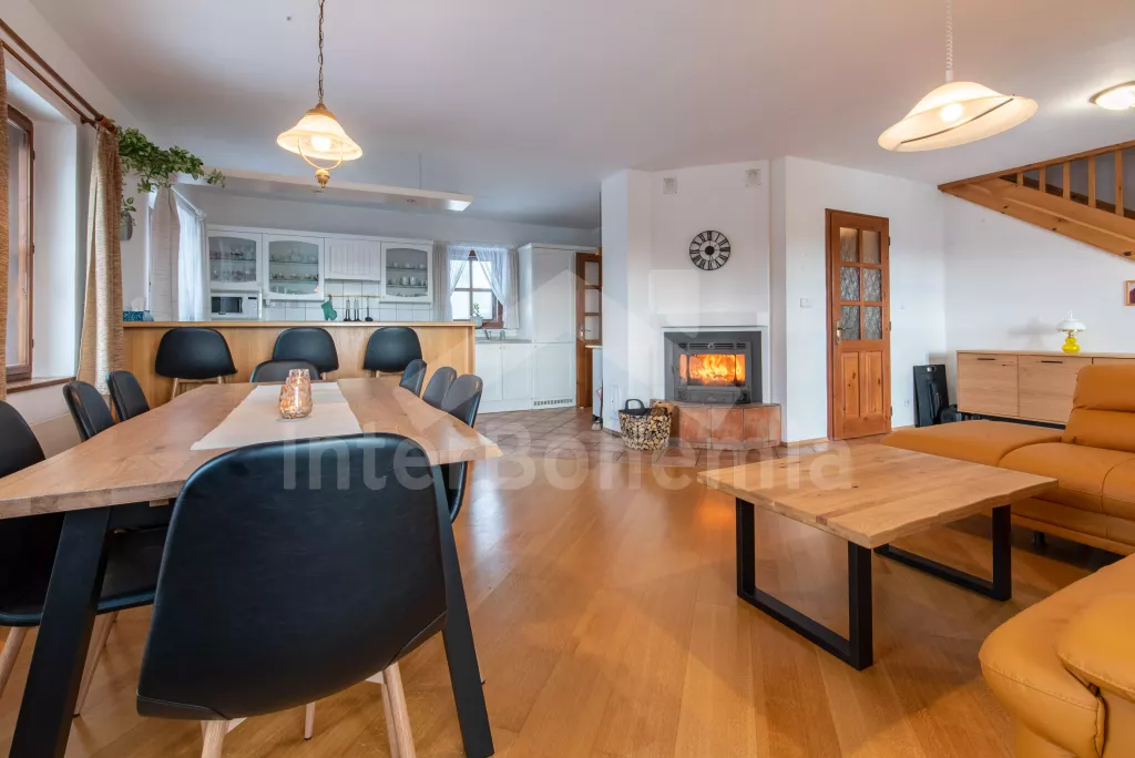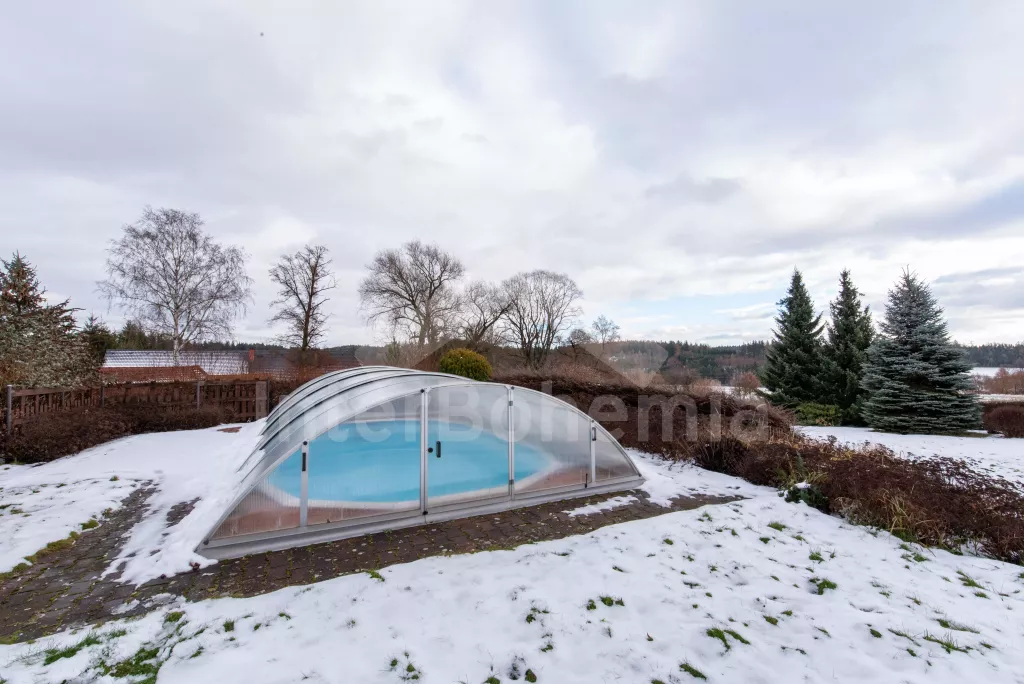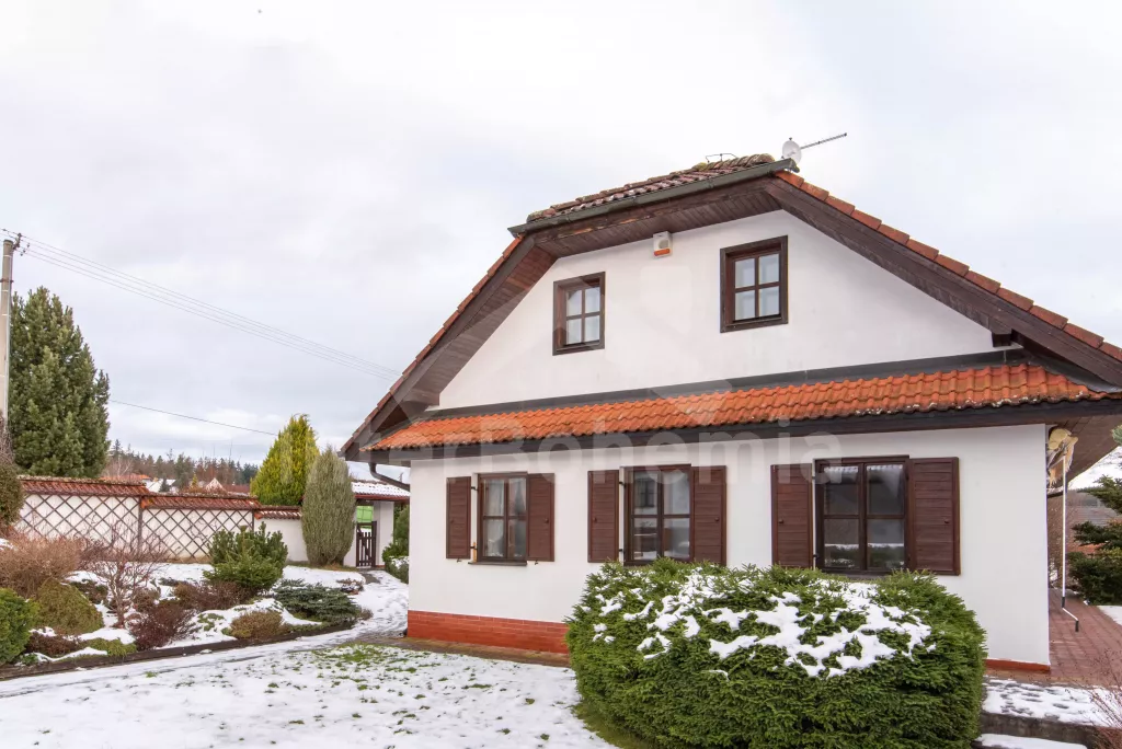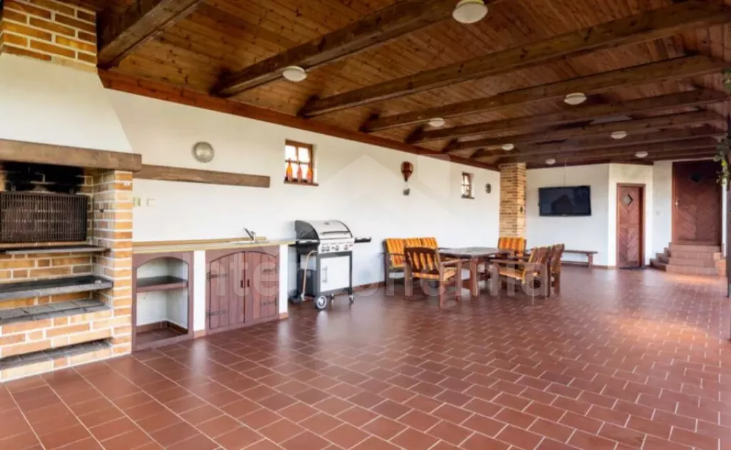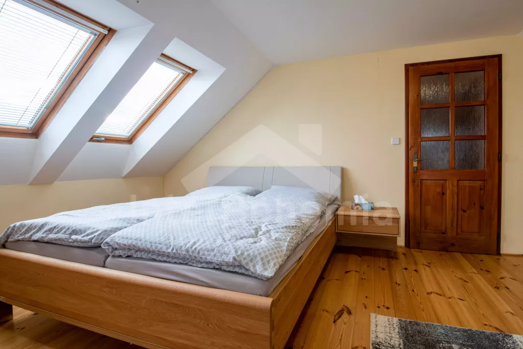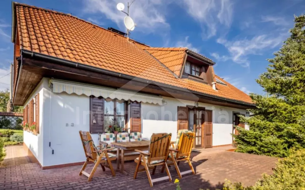 Prostorná a stylově vybavená chalupa s velkým bazénem a zastřešenou pergolou. Chodba, vstup do obytné místnosti s kuchyňským koutem. Obývací místnost disponuje rozkládací koženou pohovkou (extra dvojlůžko), konferenčním stolkem, jídelním stolem pro 8 osob, krbem, rádiem a TV. Vkusně zařízená kuchyňská linka s lednicí a mrazákem, sklokeramickou deskou, troubou, mikrovlnnou troubou, rychlovarnou konvicí, nádobím a myčkou na nádobí. Tradiční sporák na tuhá paliva. Koupelna se sprchou, umyvadlem, WC a moderní pračkou. V prvním patře celkem 3 ložnice. První ložnice s dvoulůžkem a křeslem. Druhá ložnice s dvoulůžkem, úložným prostorem a dětskou postýlkou. Třetí ložnice s jednolůžkem a rozkládací sedačkou. Koupelna s vanou, umyvadlem a toaletou. Objekt je vytápěn krbem s vyvedenými průduchy a vestavěnými přímotopy. Oplocená a velmi prostorná zahrada se zapuštěným bazénem, posezením pod zastřešenou pergolou a ohništěm. K dispozici gril jak na tuhá paliva, tak plynový. Parkování před objektem či na pozemku až pro 4 automobily.