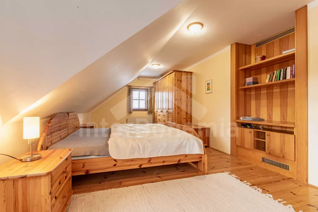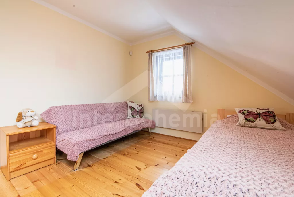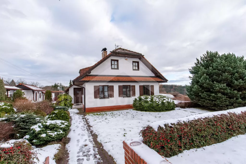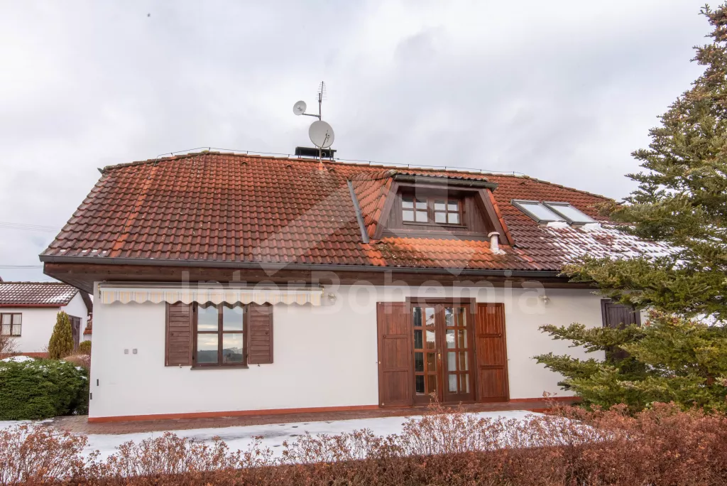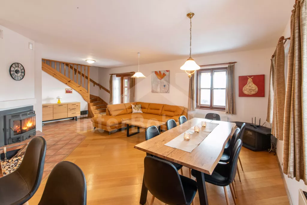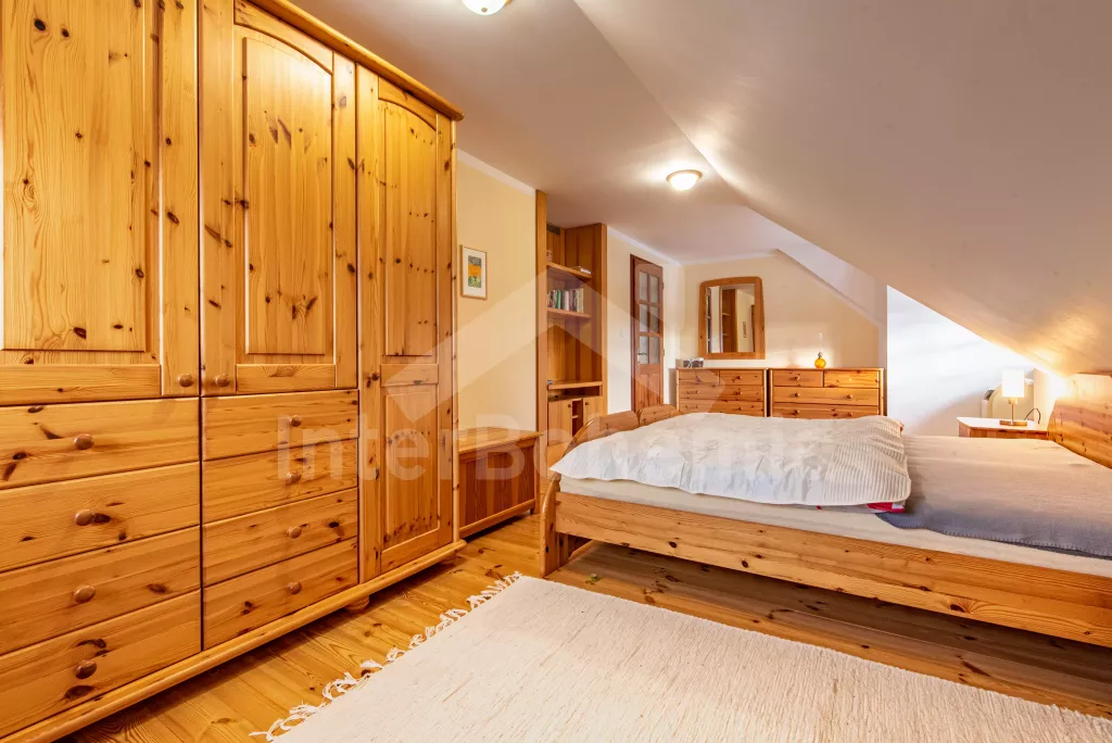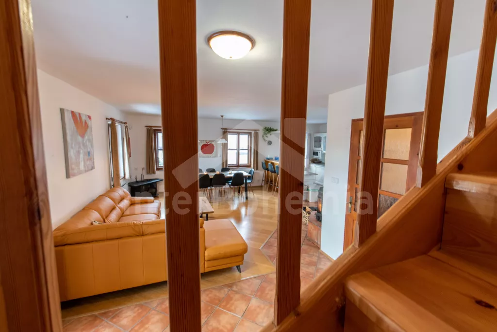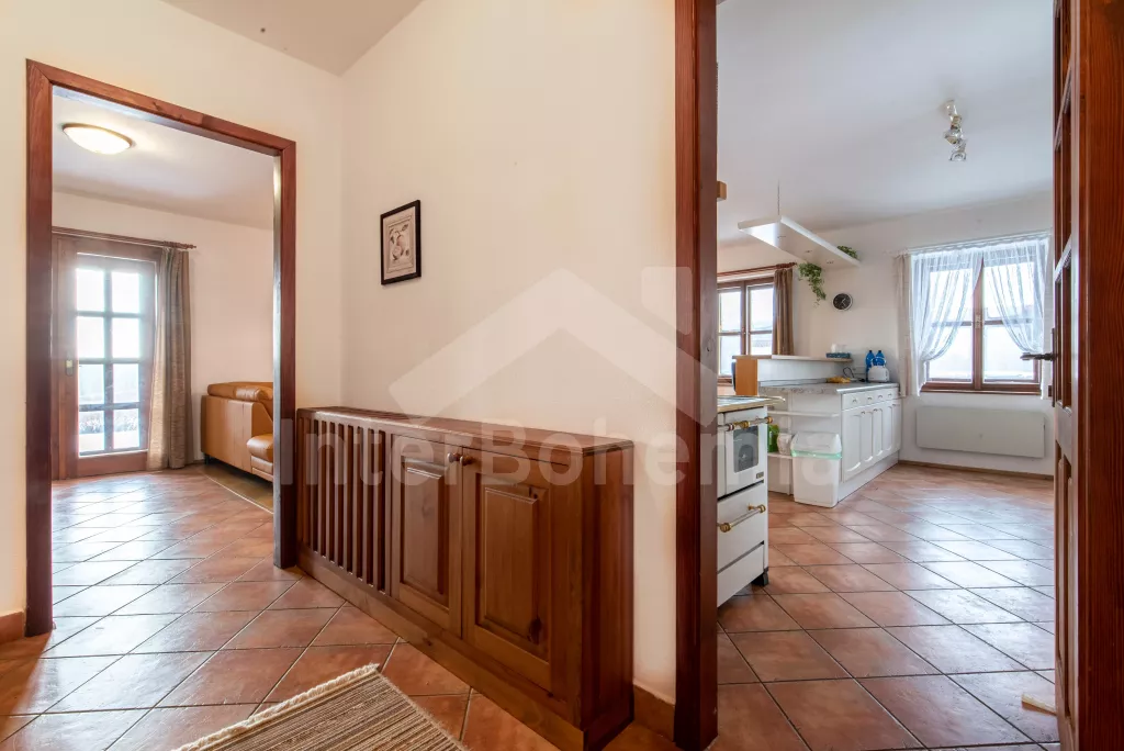 Prostorná a stylově vybavená chalupa s velkým bazénem a zastřešenou pergolou. Chodba, vstup do obytné místnosti s kuchyňským koutem. Obývací místnost disponuje rozkládací koženou pohovkou (extra dvojlůžko), konferenčním stolkem, jídelním stolem pro 8 osob, krbem, rádiem a TV. Vkusně zařízená kuchyňská linka s lednicí a mrazákem, sklokeramickou deskou, troubou, mikrovlnnou troubou, rychlovarnou konvicí, nádobím a myčkou na nádobí. Tradiční sporák na tuhá paliva. Koupelna se sprchou, umyvadlem, WC a moderní pračkou. V prvním patře celkem 3 ložnice. První ložnice s dvoulůžkem a křeslem. Druhá ložnice s dvoulůžkem, úložným prostorem a dětskou postýlkou. Třetí ložnice s jednolůžkem a rozkládací sedačkou. Koupelna s vanou, umyvadlem a toaletou. Objekt je vytápěn krbem s vyvedenými průduchy a vestavěnými přímotopy. Oplocená a velmi prostorná zahrada se zapuštěným bazénem, posezením pod zastřešenou pergolou a ohništěm. K dispozici gril jak na tuhá paliva, tak plynový. Parkování před objektem či na pozemku až pro 4 automobily.
