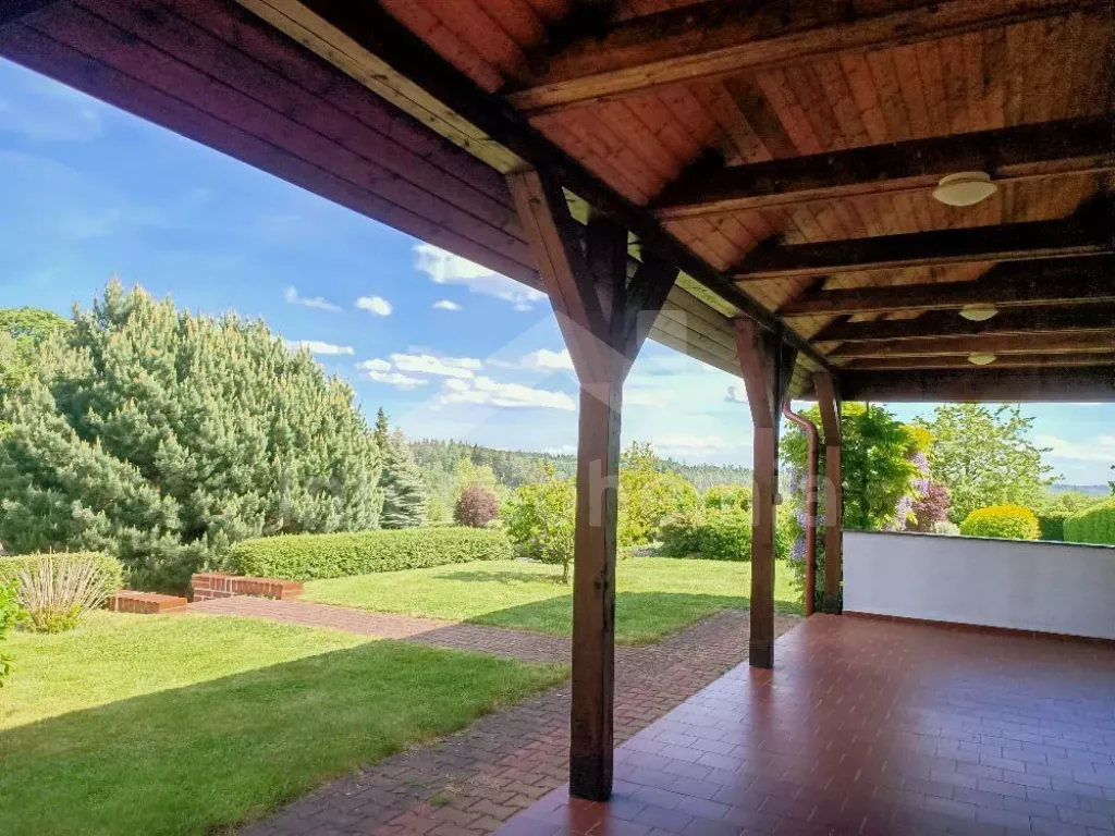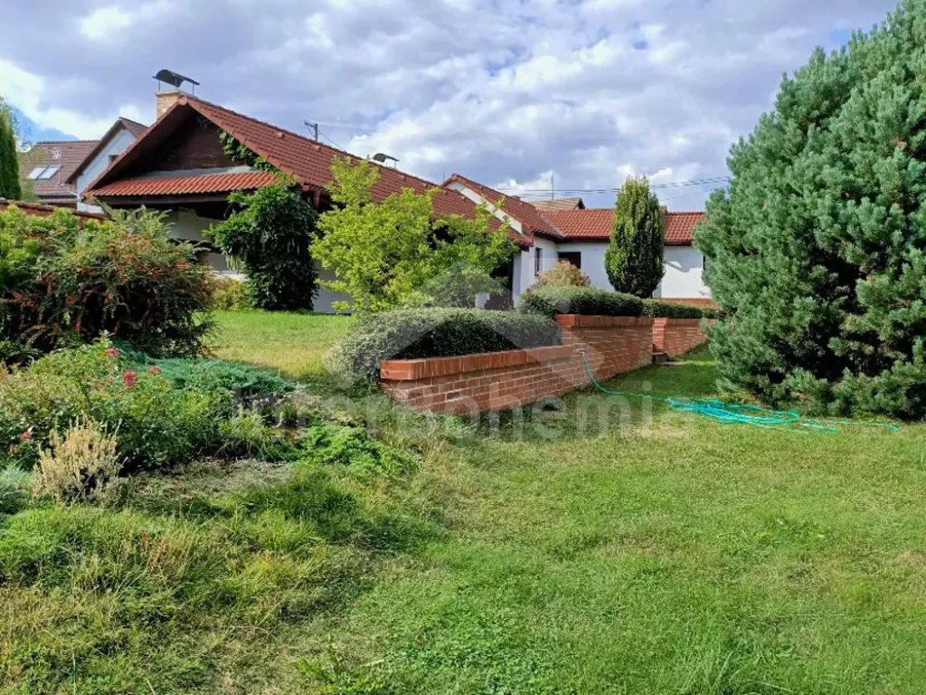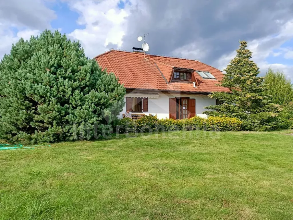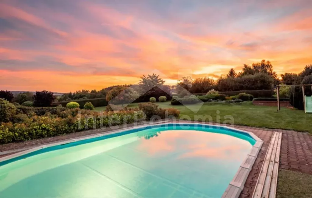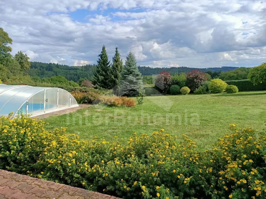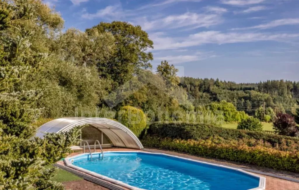 Chalupa s prostornou zahradou, zapuštěným bazénem a pergolou.