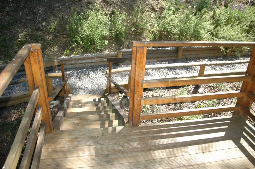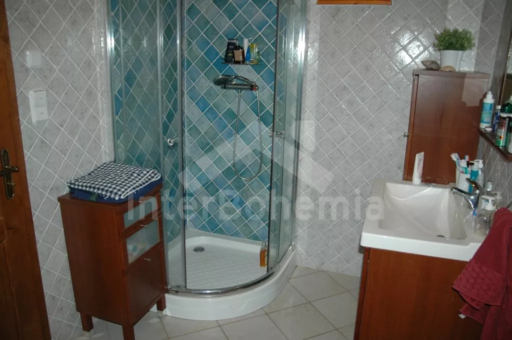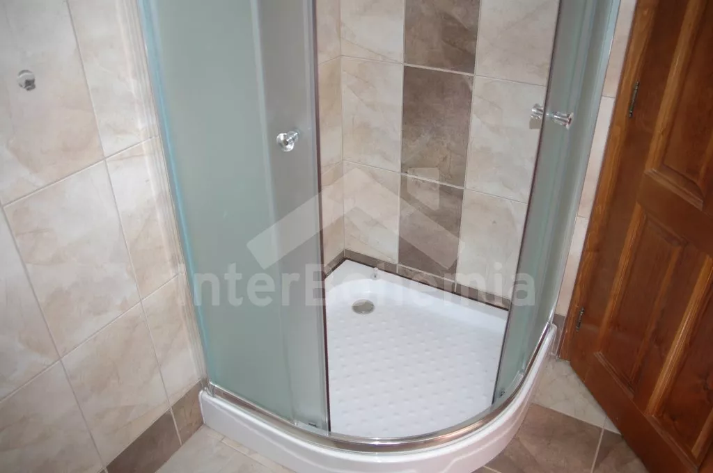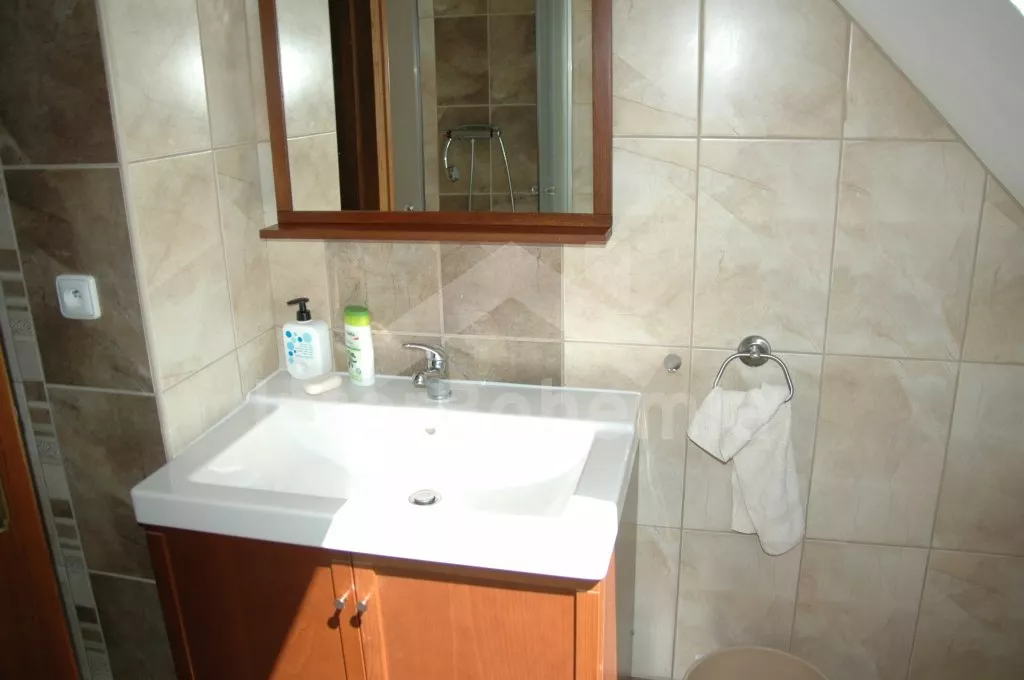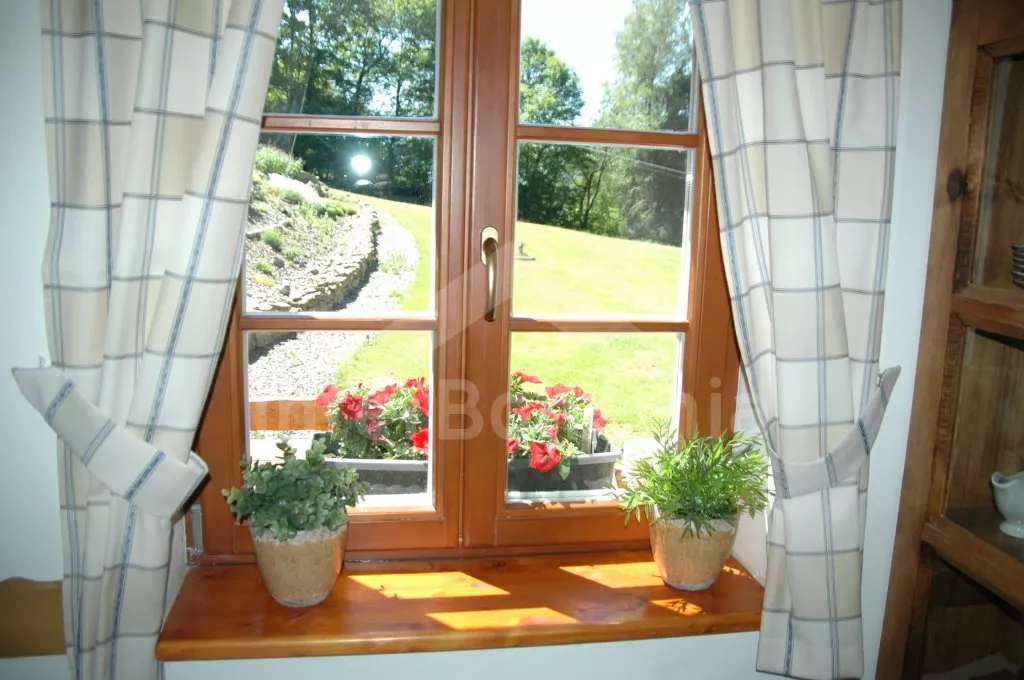 Nahoře jsou dva apartmány s vlastním vstupem. Každý je vybaven jednou velkou obytnou místností s kuchyňským koutem s varnou deskou, chladničkou, kávovarem a varnou konvicí, jídelním stolem pro 4 osoby, TV se satelitem a jedním dvojlůžkem, dále pak jednou ložnicí s jedním dvojlůžkem a koupelnou se sprchou, umyvadlem a toaletou. Dům je centrálně vytápěn na tuhá paliva. K dispozici je neoplocená zahrada s dřevěným masivním posezením, sestavou pro děti (houpačka, pískoviště, prolézačka), ohništěm a lavičkou s překrásným výhledem do údolí.