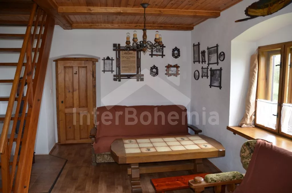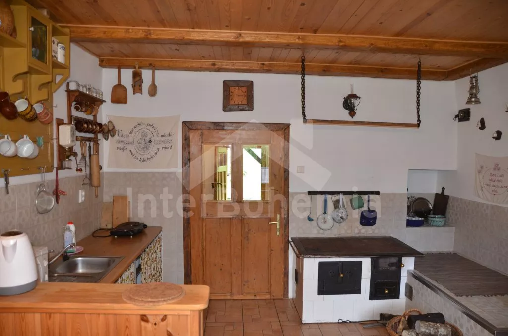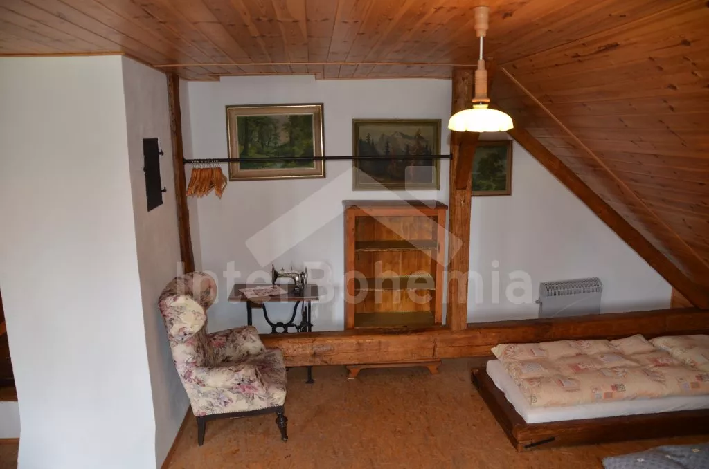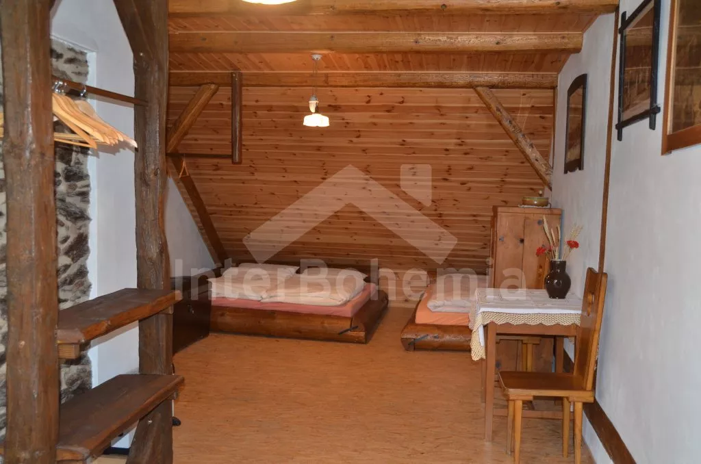 Chalupa na jedné polovině pozemku, ležící v nádherném koutu Šumavy, hezky zrekonstruovaná a zařízená ve starém stylu. Vstupní hala s lednicí a mrazákem. Obývací pokoj se sedací soupravou, televizí a kamny na dřevo. Kuchyně s jídelním stolem s lavicemi, elektrickým dvouplotýnkovým vařičem, mikrovlnnou troubou a rychlovarnou konvicí. Kuchyňská kamna na dřevo s pecí. Koupelna se sprchovým koutem a WC. Do patra, kde se nachází dvě prostorné ložnice, vedou příkré dřevěné schody uzavíratelné poklopem. První ložnice je vybavena jedním dvojlůžkem a třemi samostatnými lůžky a druhá pak dvěma dvojlůžky a jedním samostatným lůžkem. Vytápění kamny na dřevo, případně elektrickými přímotopy. K dispozici je krytá terasa s posezením, velká oplocená zahrada s ohništěm, pískovištěm a houpačkou a přenosný gril. Na zahradě se nachází romantické zákoutí s malým rybníčkem a lavičkou. Parkování na pozemku.