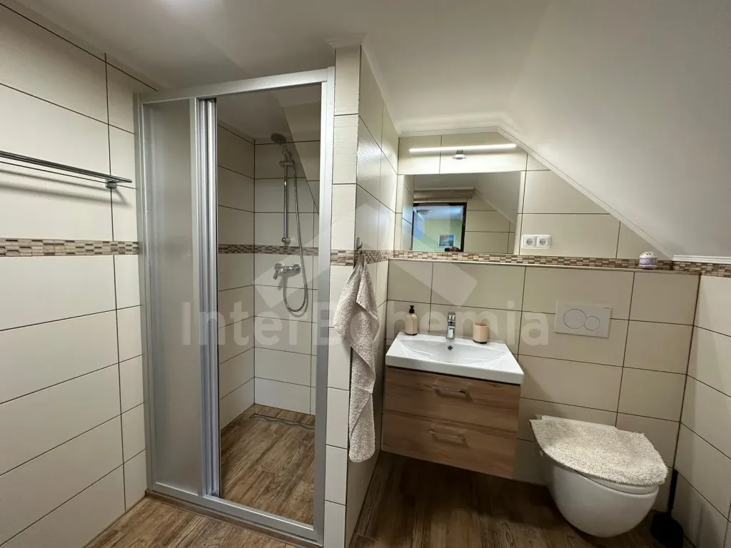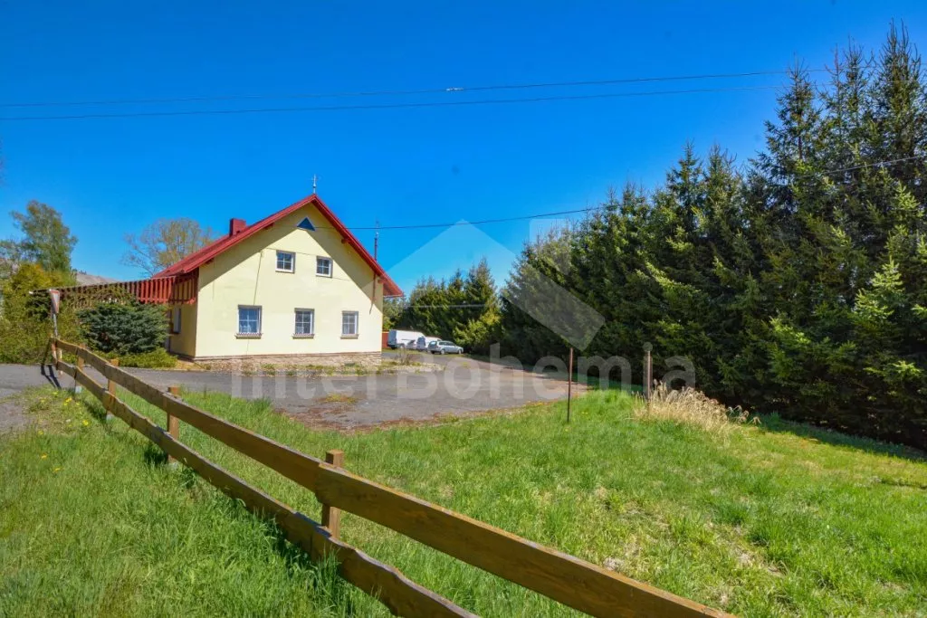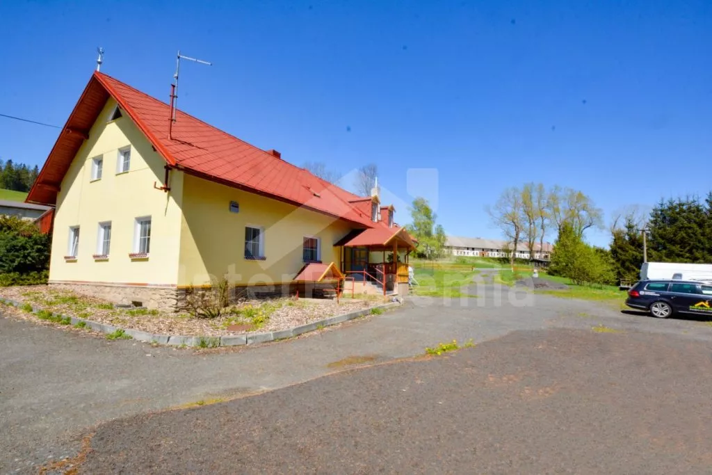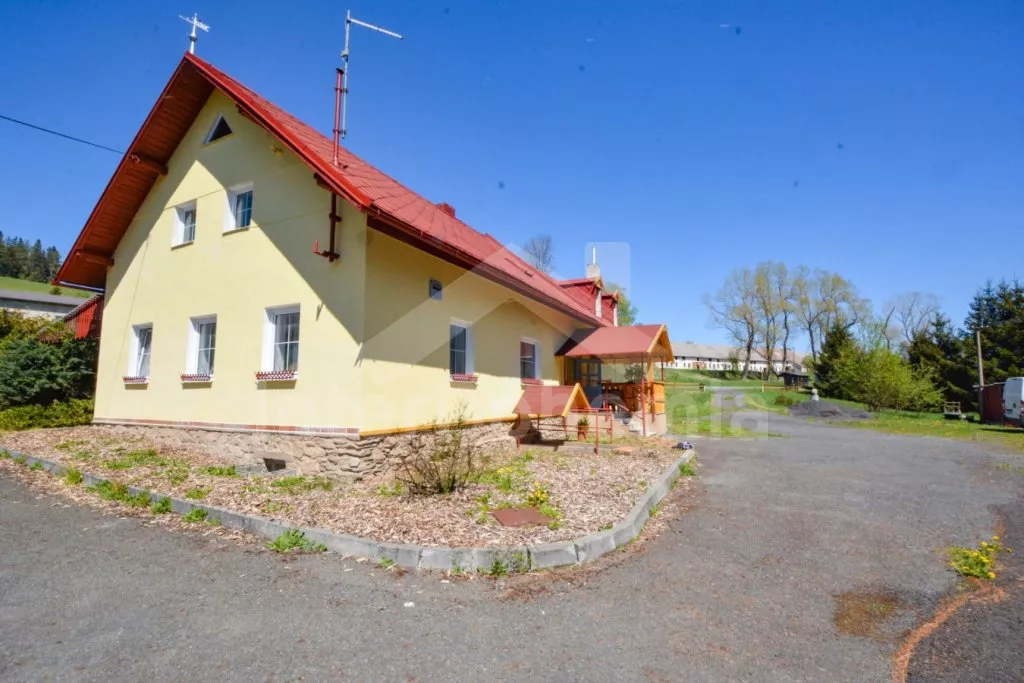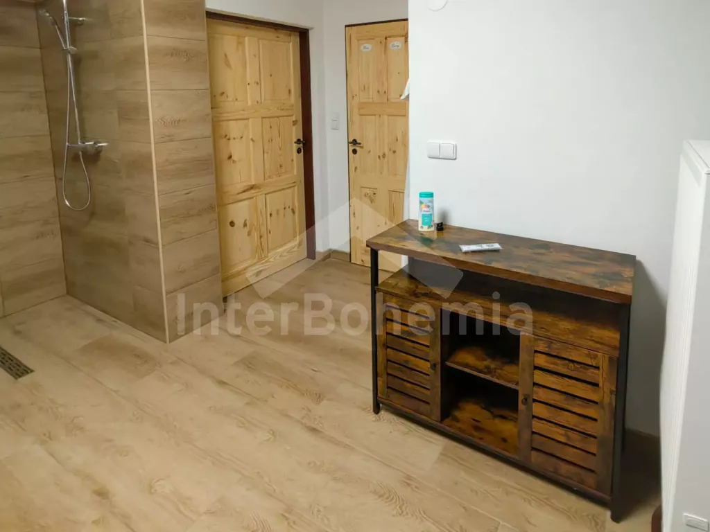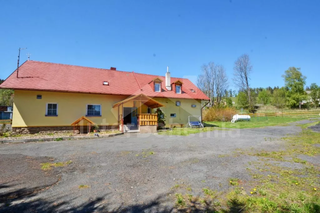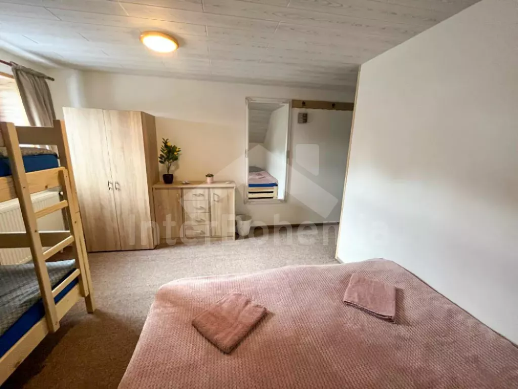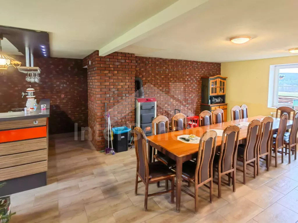 Volně stojící chalupa (bývalý penzion) na vlastním oploceném pozemku, velmi prostorná a komfortně zařízená, ideální pro větší skupinu přátel. Vstup, hala, centrální společenská místnost/jídelna s barovým pultem, jídelními stoly pro 15 osob a LCD televizí. Samostatná velká kuchyně, sporák se sklokeramickou deskou, troubou, mikrovlnnou troubou, lednicí s mrazákem, rychlovarnou konvicí, nádobím a myčkou na nádobí. Samostatné WC.