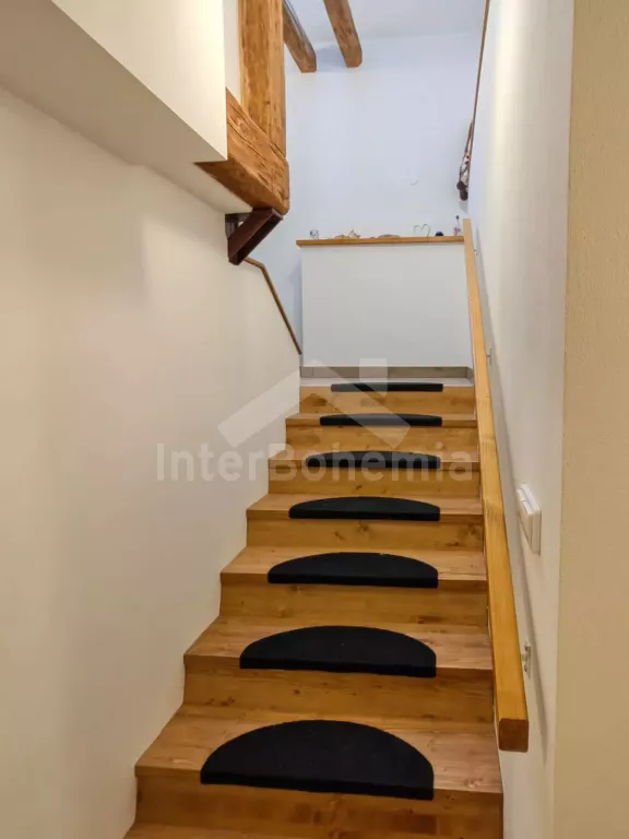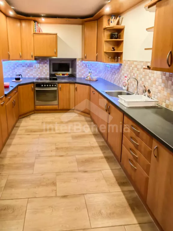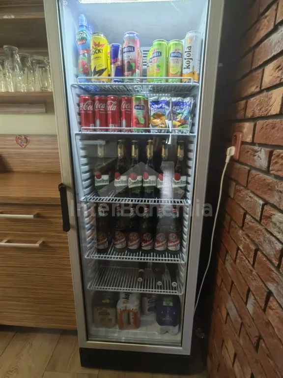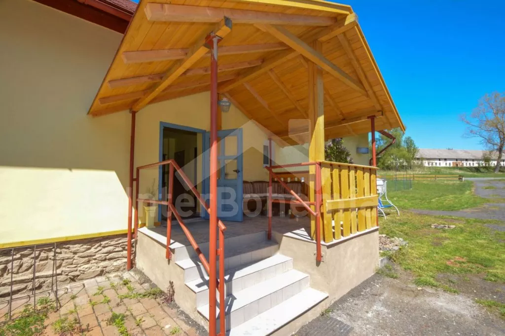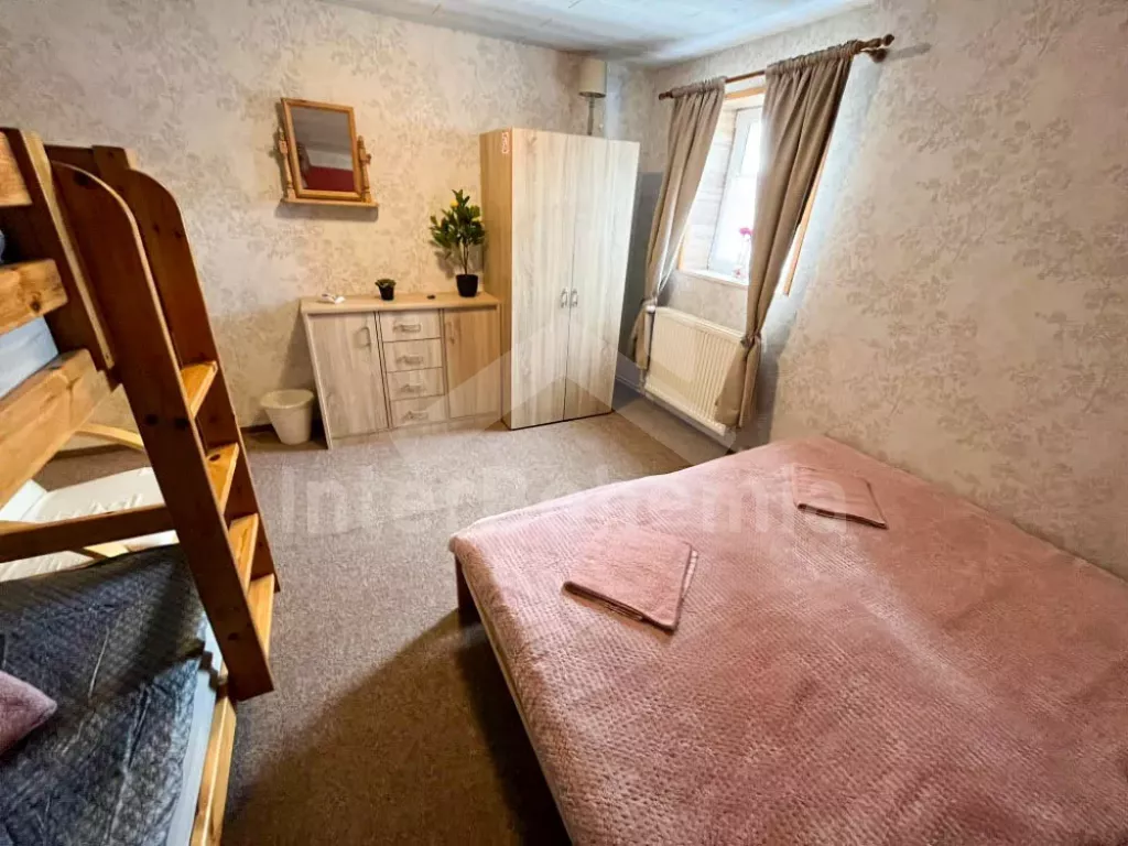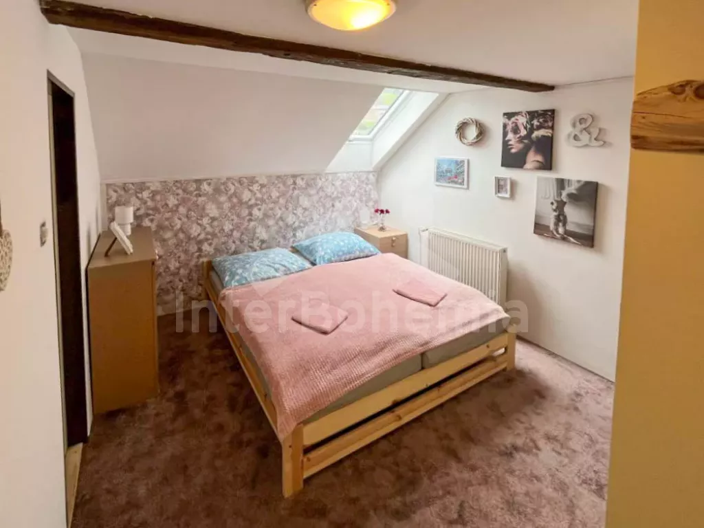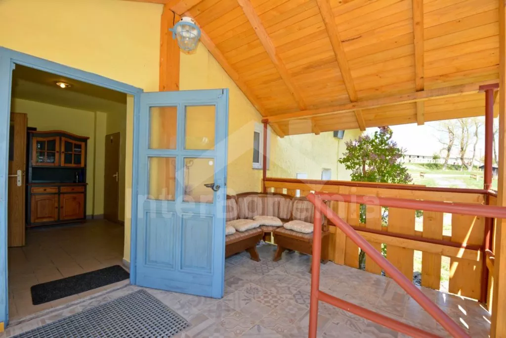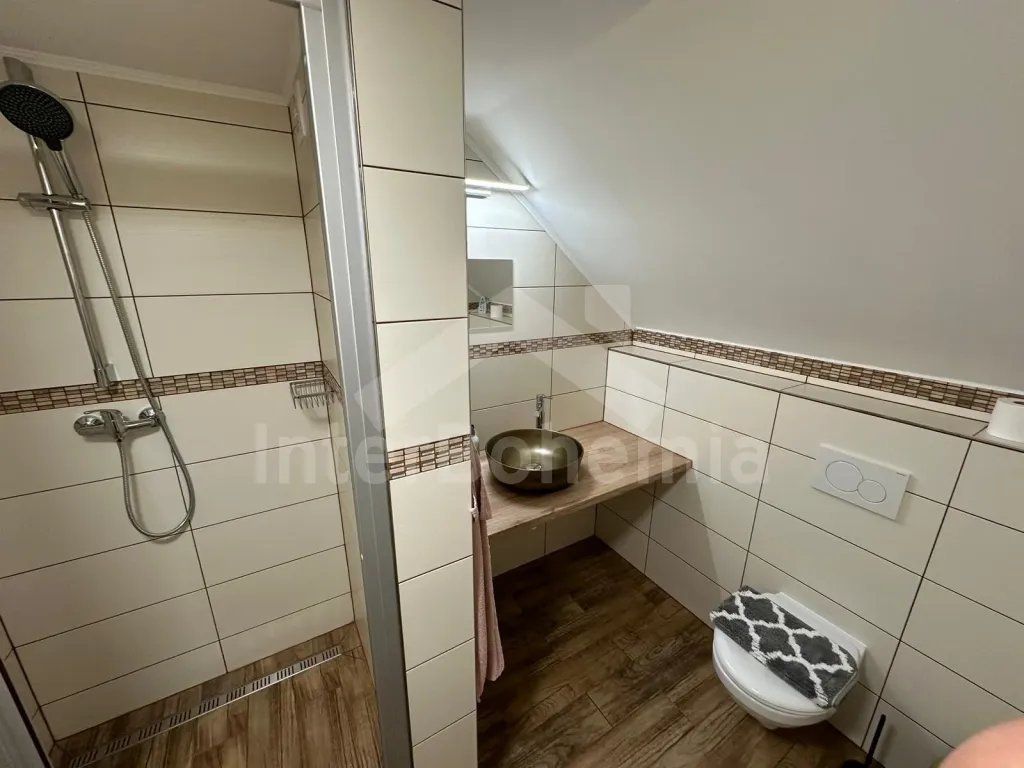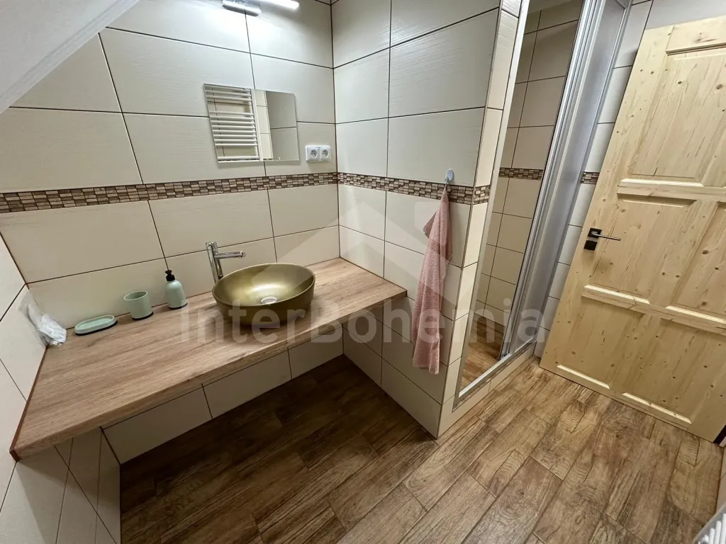 Volně stojící chalupa (bývalý penzion) na vlastním oploceném pozemku, velmi prostorná a komfortně zařízená, ideální pro větší skupinu přátel. Vstup, hala, centrální společenská místnost/jídelna s barovým pultem, jídelními stoly pro 15 osob a LCD televizí. Samostatná velká kuchyně, sporák se sklokeramickou deskou, troubou, mikrovlnnou troubou, lednicí s mrazákem, rychlovarnou konvicí, nádobím a myčkou na nádobí. Samostatné WC.