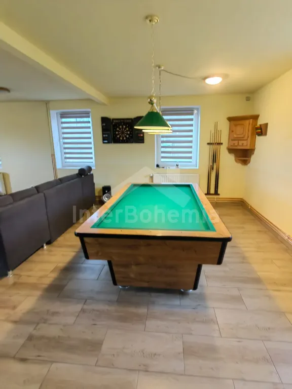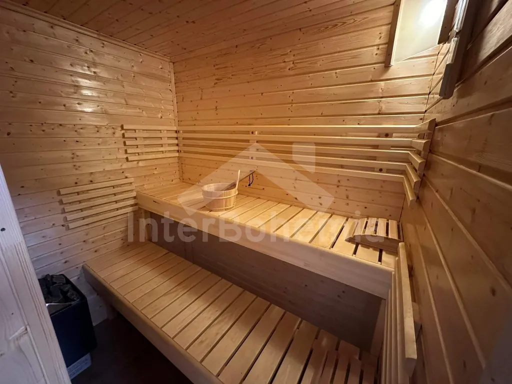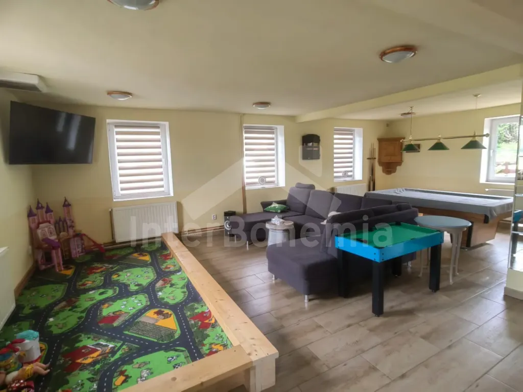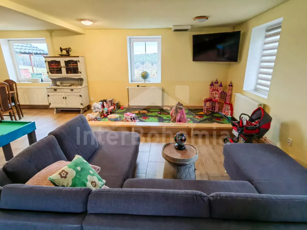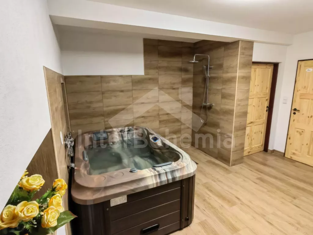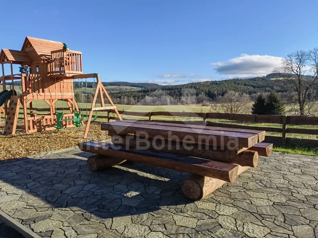 Prostorná chalupa s velkou společenskou místností, vnitřní vířivkou, saunou a dětským hřištěm.