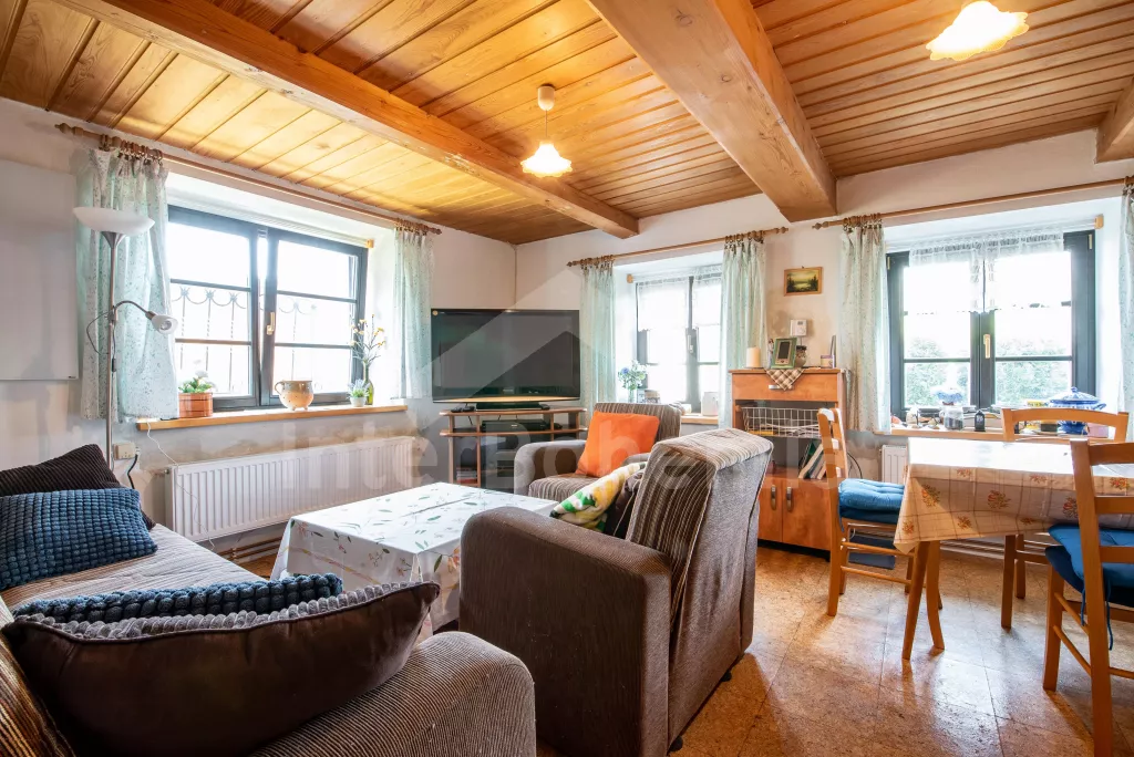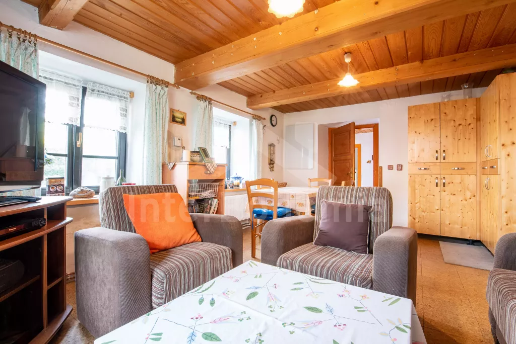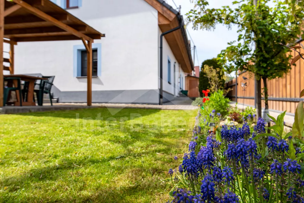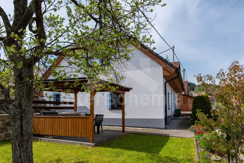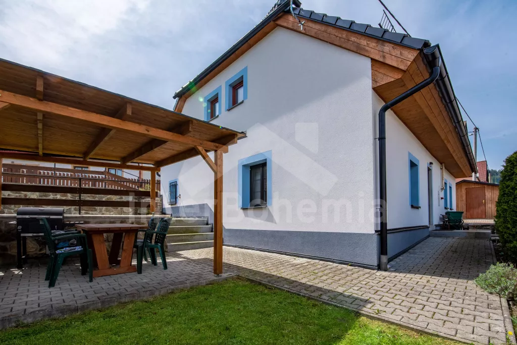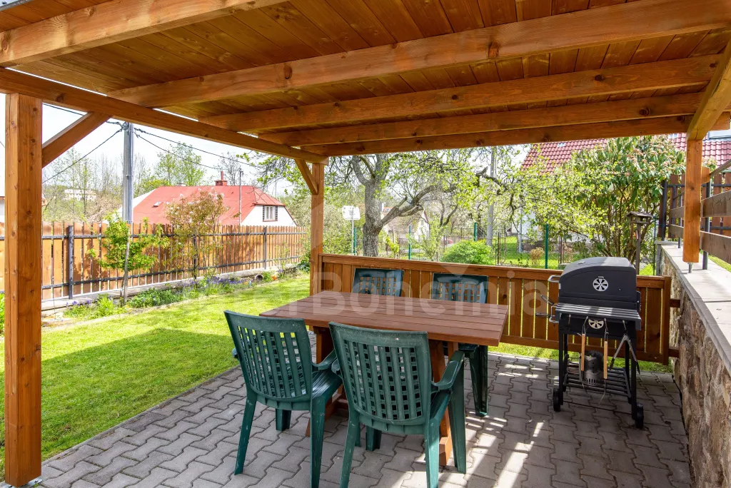 Chalupa s vlastní oplocenou zahradou a krytou pergolou s grilem. Kuchyně se sklokeramickou varnou deskou, troubou, mikrovlnnou troubou, varnou konvicí a myčkou. Lednice s mrazákem v chodbě. Obývací pokoj s jídelním stolem, sedací soupravou a TV. Vedle obývacího pokoje první ložnice s dvoulůžkem. Druhá ložnice přes chodbu se dvěma jednolůžky a posezením. Koupelna se sprchou ve vaně, umyvadlem, pračkou a WC. V podkroví 3 jednolůžka s možností jedné přistýlky. Vytápění pomocí kamen s výměníkem a topných, nástěnných panelů. K dispozici kompletně oplocená zahrada s pergolou, zahradním posezením a grilem. Parkování ve dvoře (pro 2 menší auta), další vozidla na návsi 300 m od objektu.