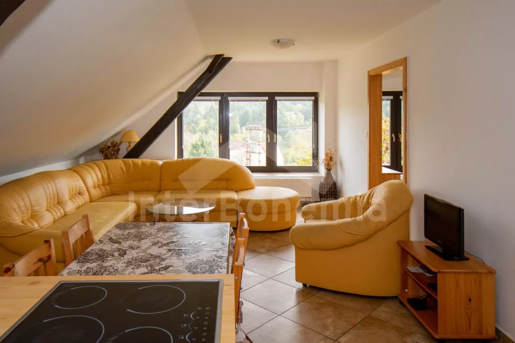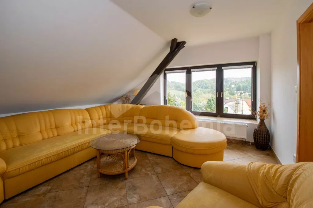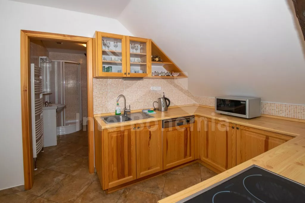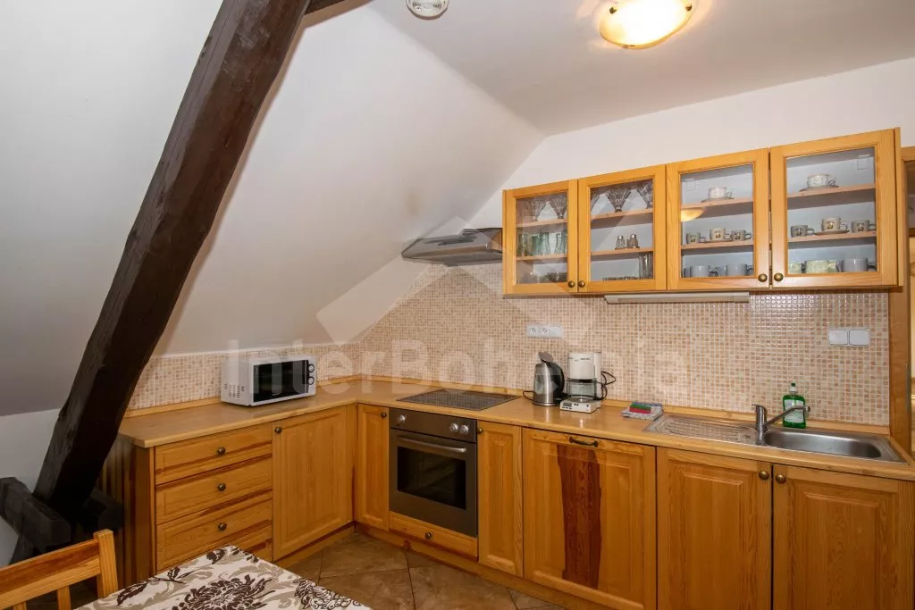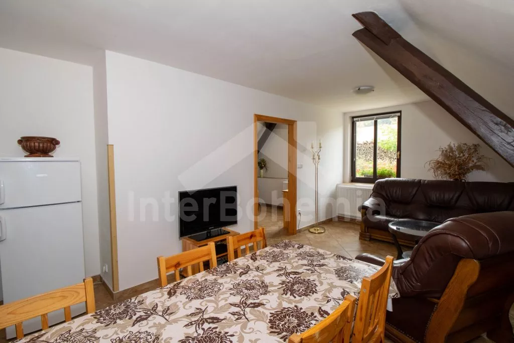 Druhý apartmán: Kuchyně spojena s obývacím pokojem. Kuchyňský kout se sklokeramickou varnou deskou, troubou, mikrovlnnou troubou, lednicí, rychlovarnou konvicí, nádobím a myčkou na nádobí. Jídelní stůl pro 4 osoby, sedací souprava a LCD televize. Ložnice s dvoulůžkem a krásným výhledem do zahrady a na okolní lesy.