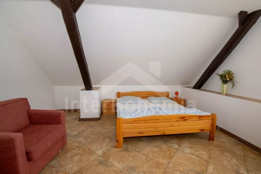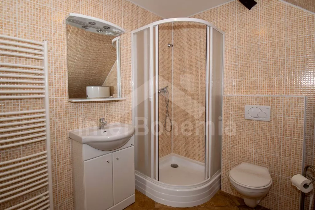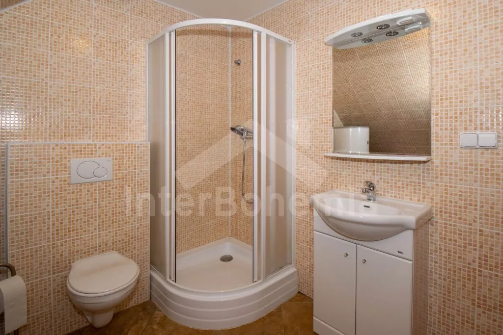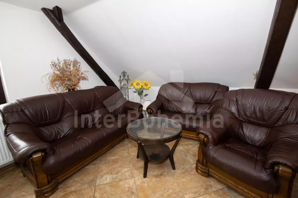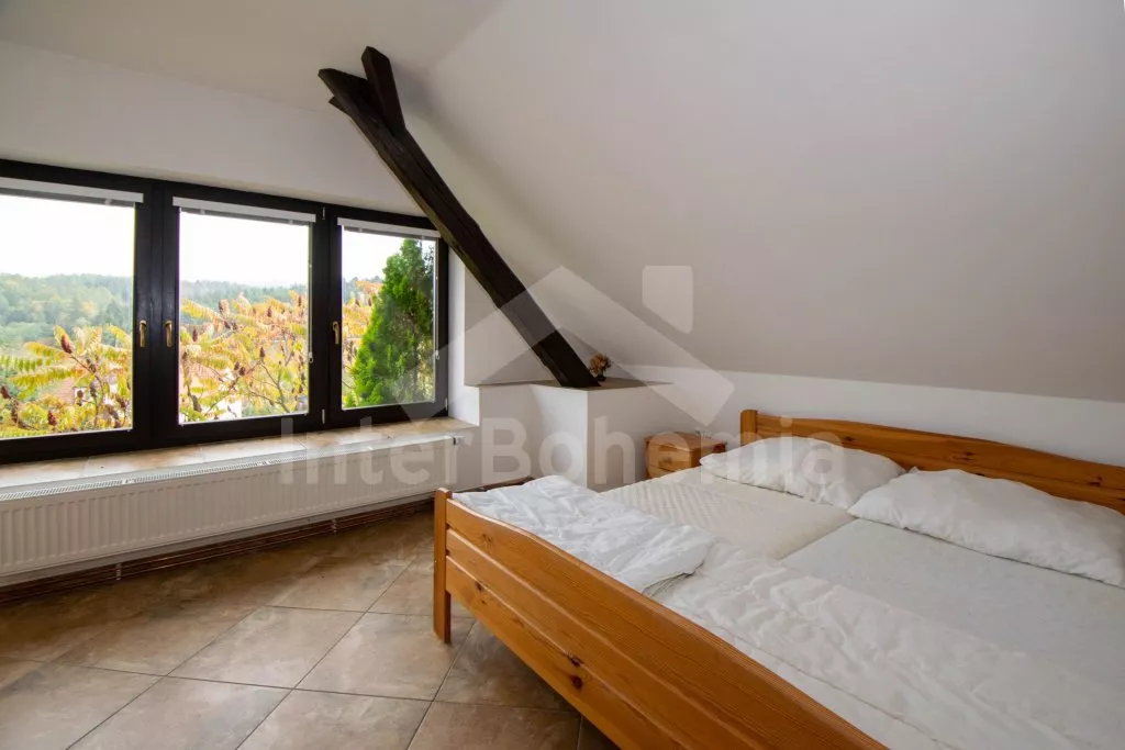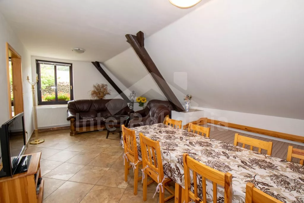 Druhý apartmán: Kuchyně spojena s obývacím pokojem. Kuchyňský kout se sklokeramickou varnou deskou, troubou, mikrovlnnou troubou, lednicí, rychlovarnou konvicí, nádobím a myčkou na nádobí. Jídelní stůl pro 4 osoby, sedací souprava a LCD televize. Ložnice s dvoulůžkem a krásným výhledem do zahrady a na okolní lesy.