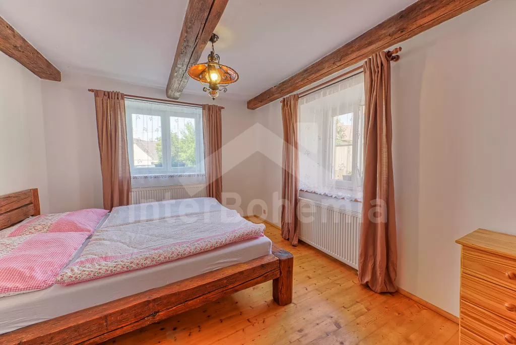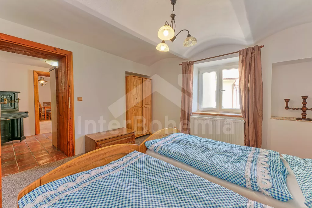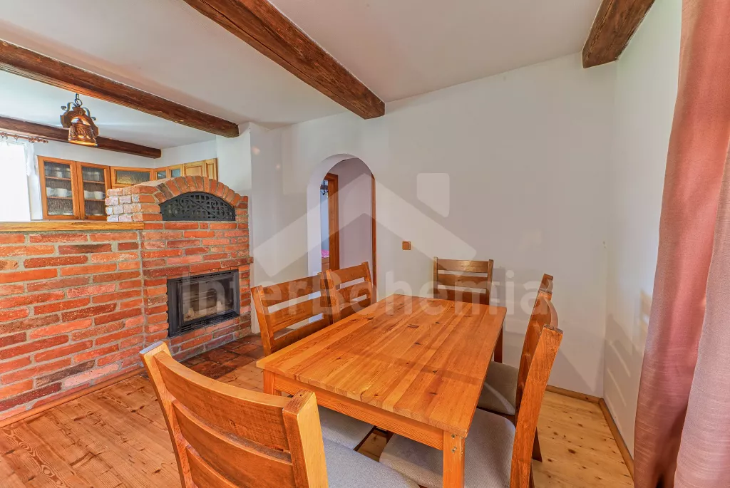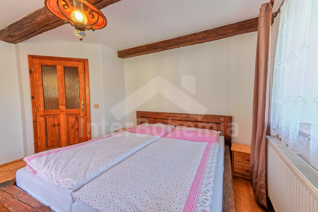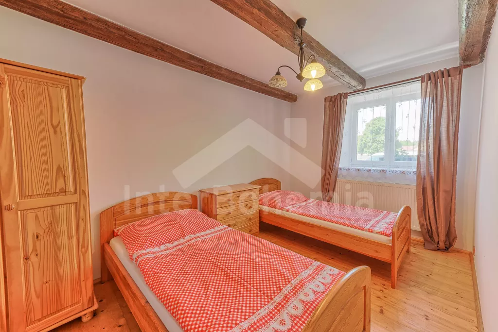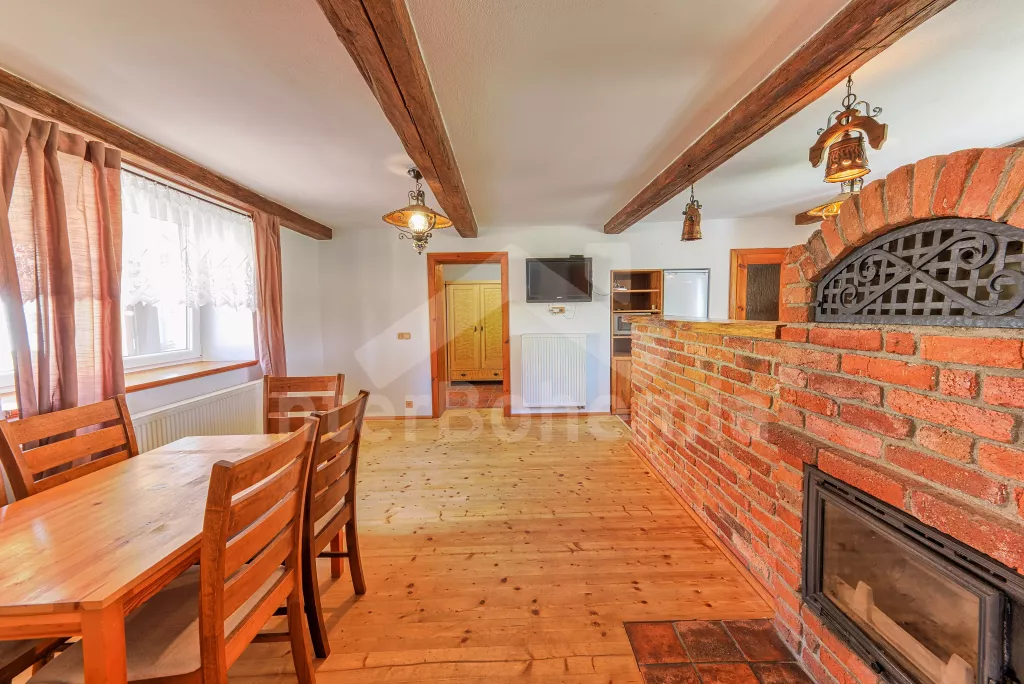 Samostatně stojící chalupa, nově zrekonstruovaná v roce 2022. Vstup, hala, prostorná obývací místnost spojená s kuchyní. Kuchyňská linka vybavená plynovým sporákem, elektrickou troubou, mikrovlnnou troubou, lednicí s integrovaným mrazákem, rychlovarnou konvicí, nádobím a myčkou na nádobí. Jídelní stůl pro 6 osob, k dispozici LCD TV a krb. První ložnice s dvoulůžkem. Druhá ložnice s dvěma jednolůžky. Třetí ložnice s dvoulůžkem. Koupelna se sprchovým koutem, umyvadlem a vanou. Samostatné WC. Vytápění chalupy ústřední + krbovými kamny na tuhá palivy. Hosté mají k dispozici oplocenou předzahrádku se zahradním posezením a přenosný gril. Parkování před objektem pro 2 automobily.