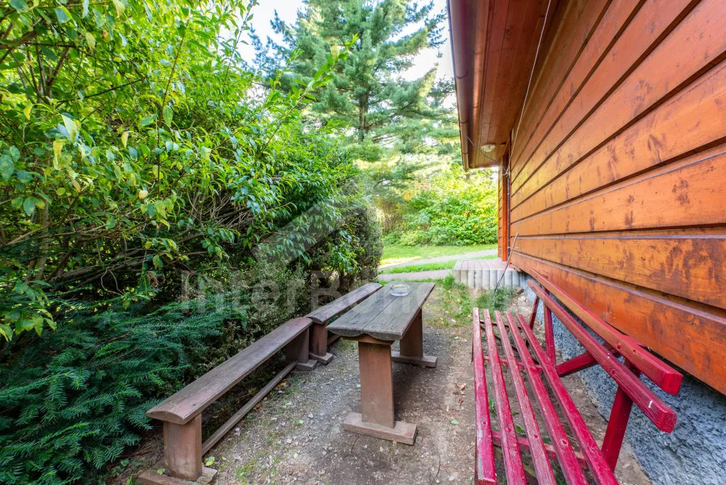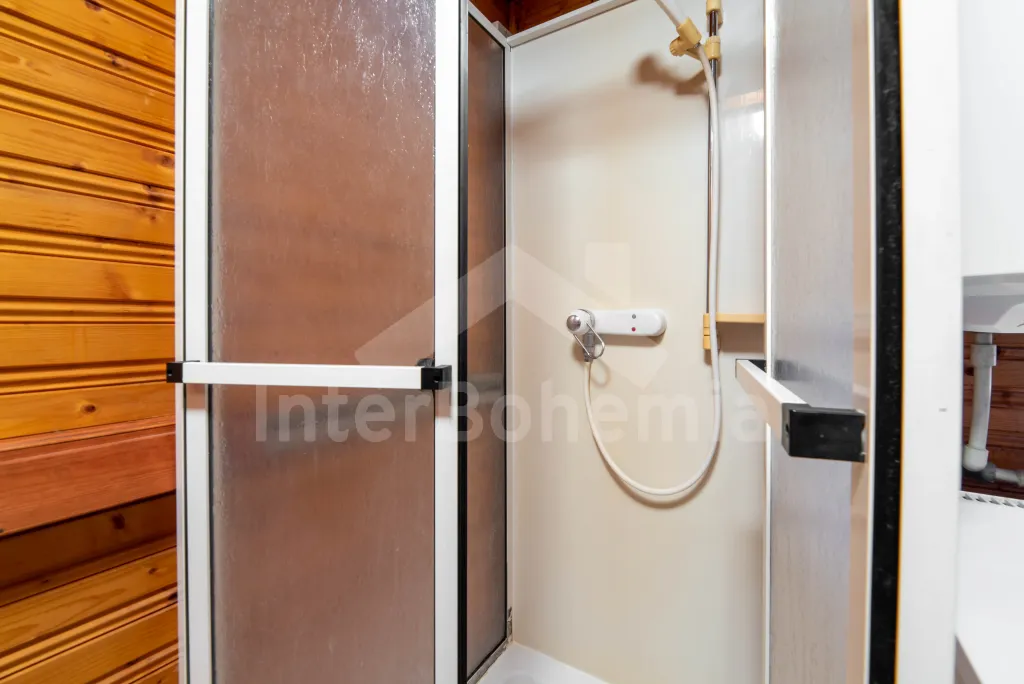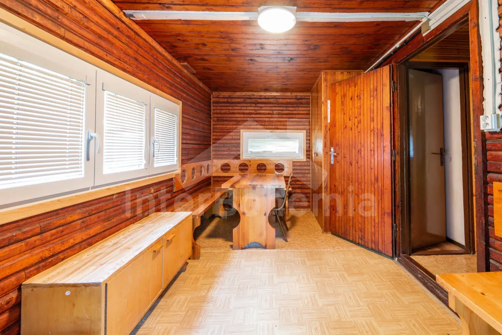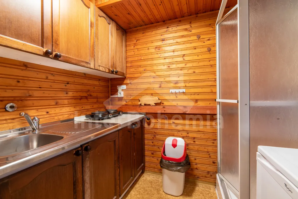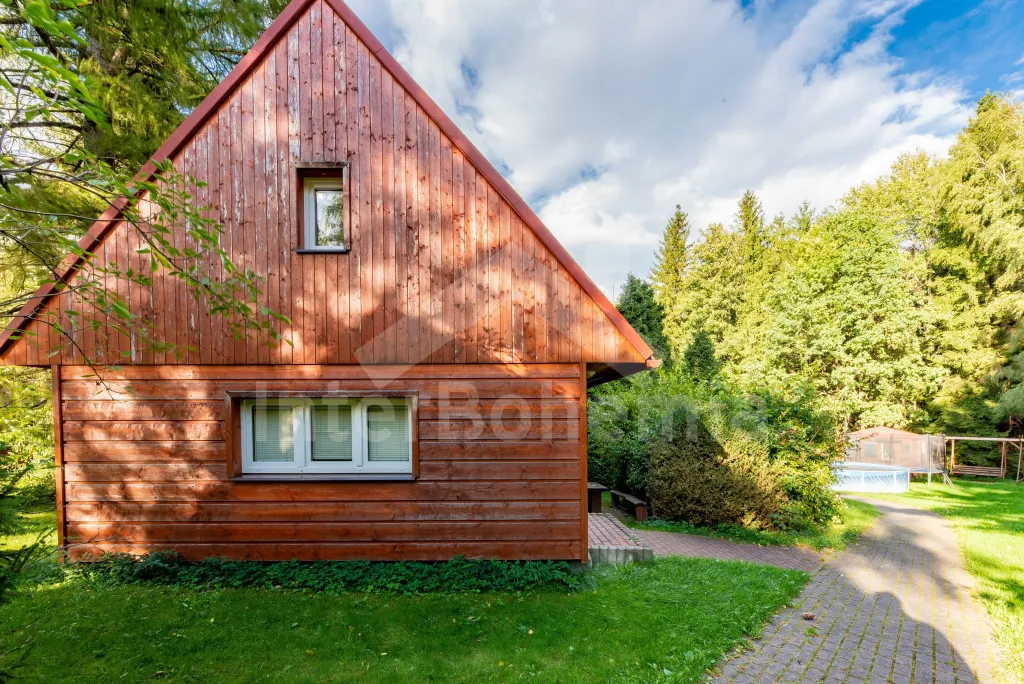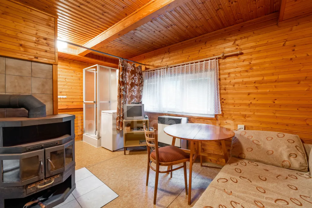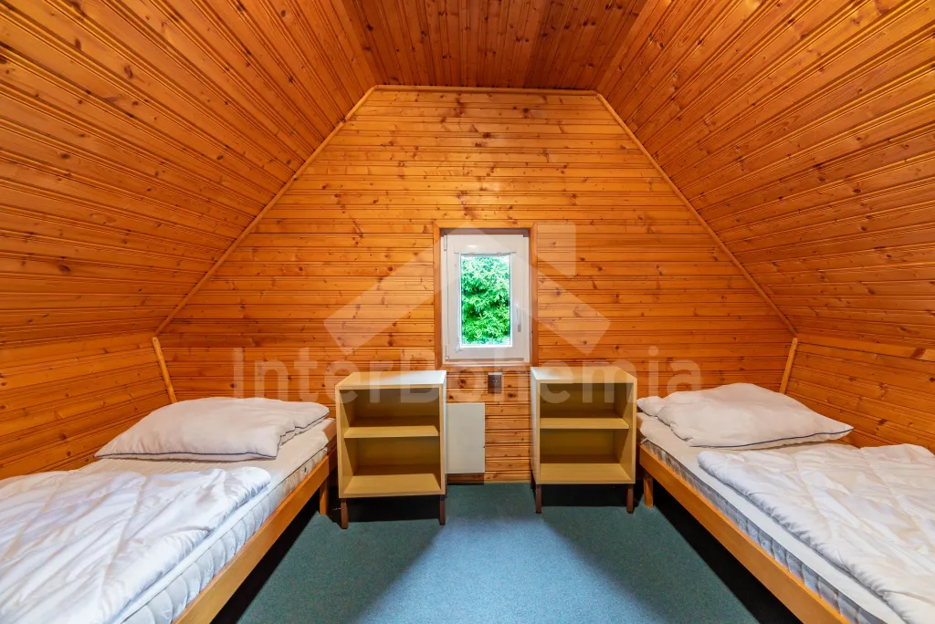 Volně stojící dřevěná chata s kapacitou pro 5 osob, nacházející se v rekreačním areálu. Kuchyně s dvou plotýnkovým vařičem, lednicí a varnou konvic. Na ni volně navazuje obývací pokoj s posezením, krbovými kamny a TV. Samostatné WC. K dispozici sprchový kout. V podkroví 2 ložnice (první se 3 lůžky, druhá se 2 lůžky). Vytápění objektu plynové a elektrické. Venkovní posezení před chatou. Parkování pro jedno vozidlo na parkovišti cca 30 m od chaty. (Další vozidla možná za poplatek).