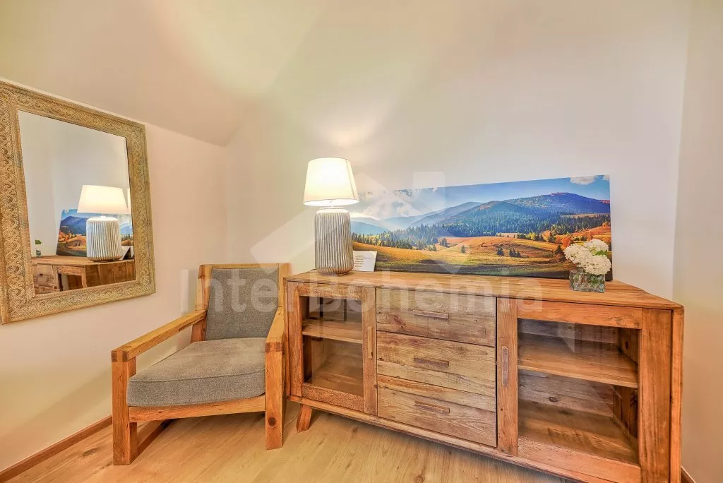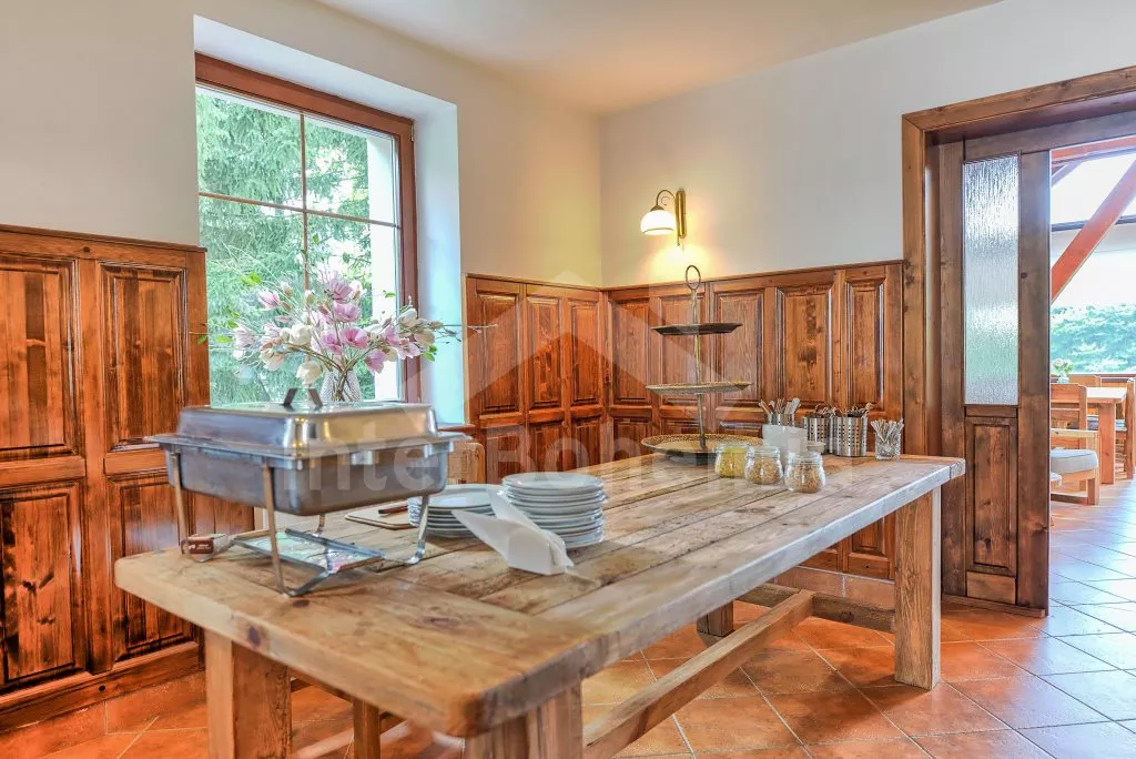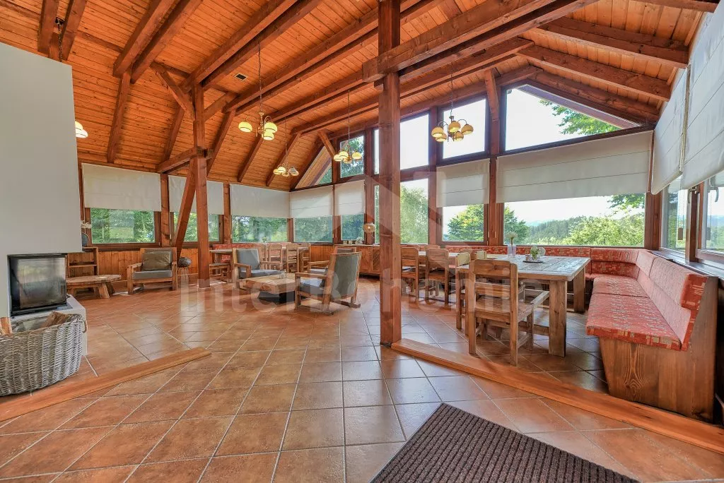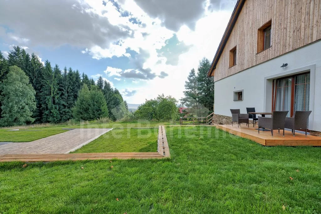 V roce 2021 zrekonstruovaná moderní chata s wellness, zapuštěným bazénem, barem a prostornou společenskou místností. Celkem 6 apartmánů s vlastními koupelnami, finská sauna, vířivka či atraktivní společenské prostory jsou zárukou jedinečné dovolené s partou vašich blízkých. Vstup přes společenskou místnost, či centrální halou. Společenská místnost nabídne posezení pro všech 20 ubytovaných, celé místnosti dominuje krb. Na průchozí místnost s barem navazuje kuchyně s veškerým vybavením - plynový sporák s 5 plotýnkami, trouba, lednice s mrazákem, kávovar, rychlovarná konvice a myčka na nádobí. Při pronájmu celého objektu si hosté pronajímají veškeré níže uvedené apartmány společně s celkovým zázemím chaty. Jednotlivé apartmány je možné si pronajmout i pod vlastním označením.