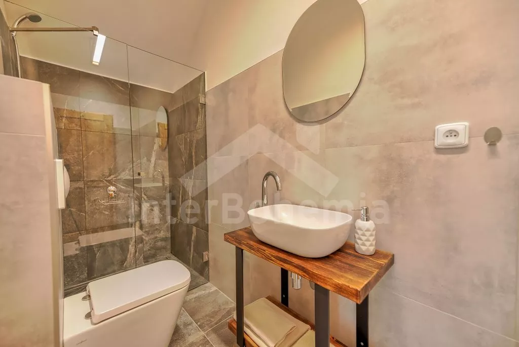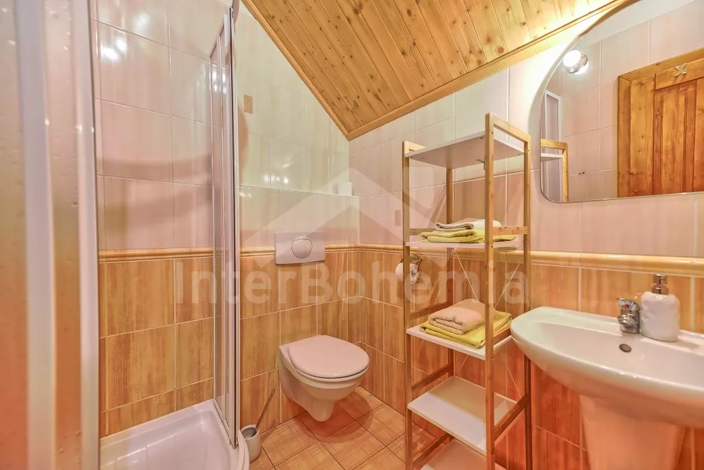 Apartmán v 1. patře s jednou ložnicí (manželské dvoulůžko) a koupelnou se sprchovým koutem, umyvadlem a WC.
