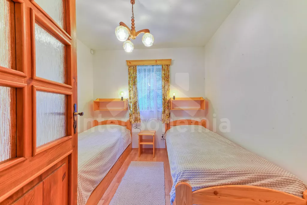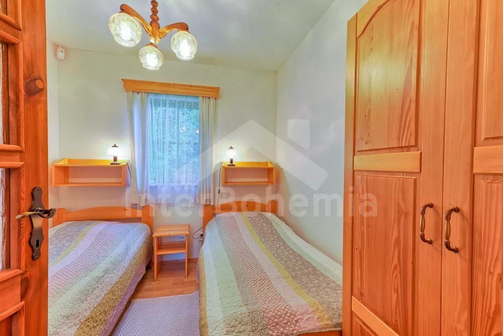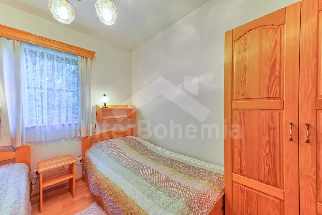 Samostatný bungalov. Malý, ale velmi pěkný víkendový dům, komfortně zařízený. Vstup, hala, obývací pokoj s pohovkou, jídelním stolem, satelitní TV a rádiem. Moderní otevřená kuchyně se 4 elektrickými plotýnkami, lednicí, kávovarem a mikrovlnnou troubou. Koupelna se sprchovým koutem, samostatné WC. Ložnice s manželskou postelí a druhá ložnice se 2 samostatnými postelemi a extra skládací postelí. Bungalov je na neoploceném pozemku, jeho součástí je terasa se zahradním nábytkem a slunečníkem a přenosný gril. Vlastní parkovací místo u bungalovu pro 1 auto bez přívěsu zdarma, druhé za poplatek 125 Kč/den.