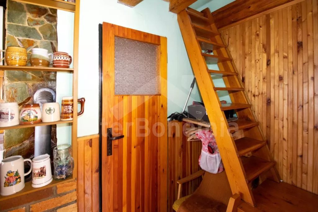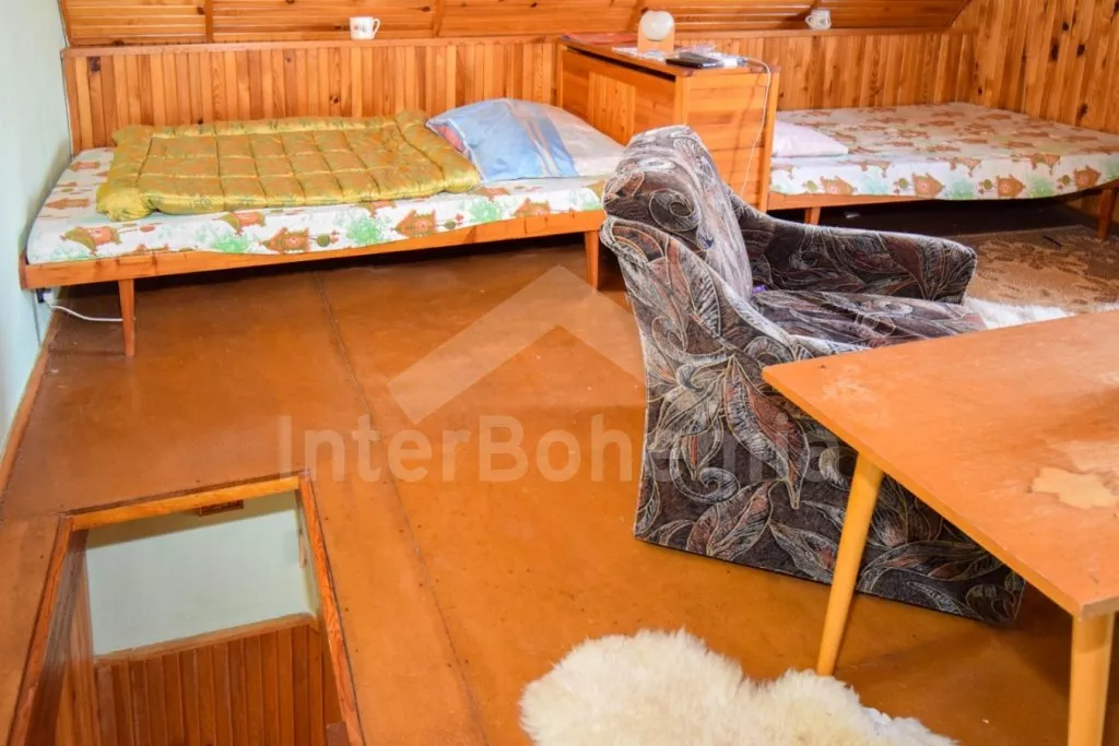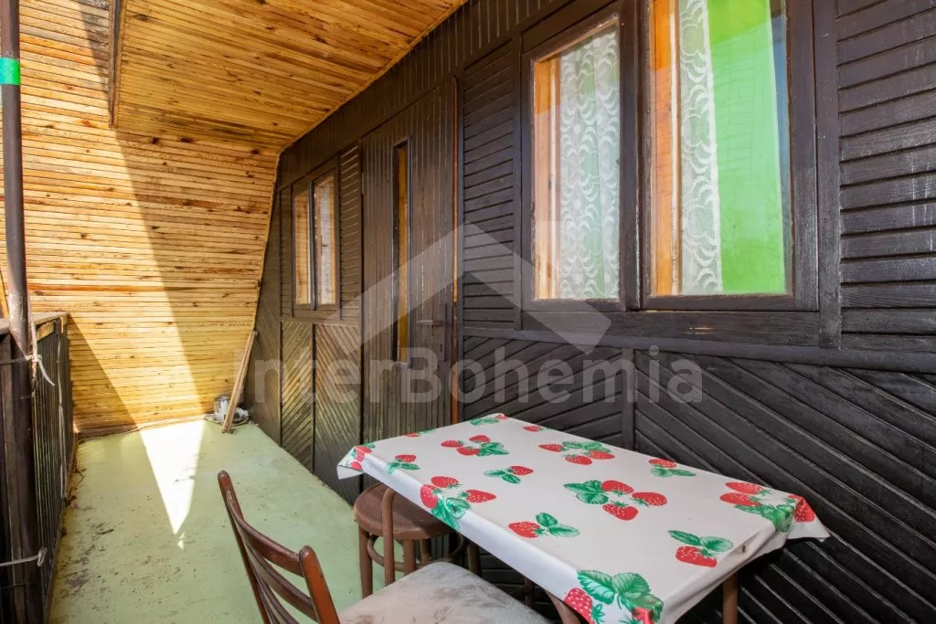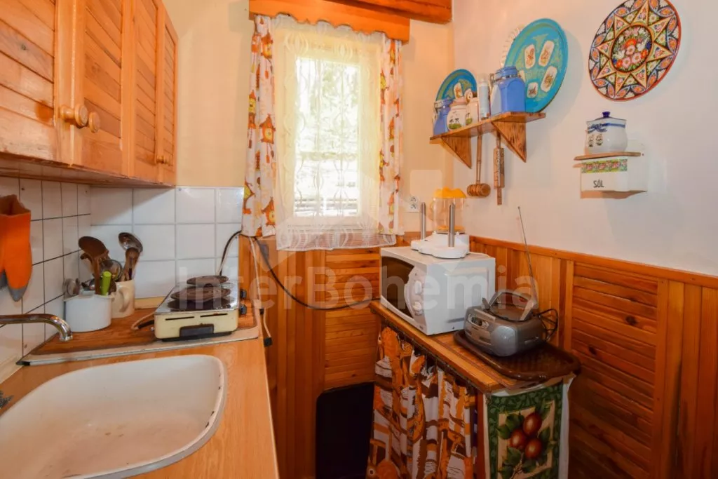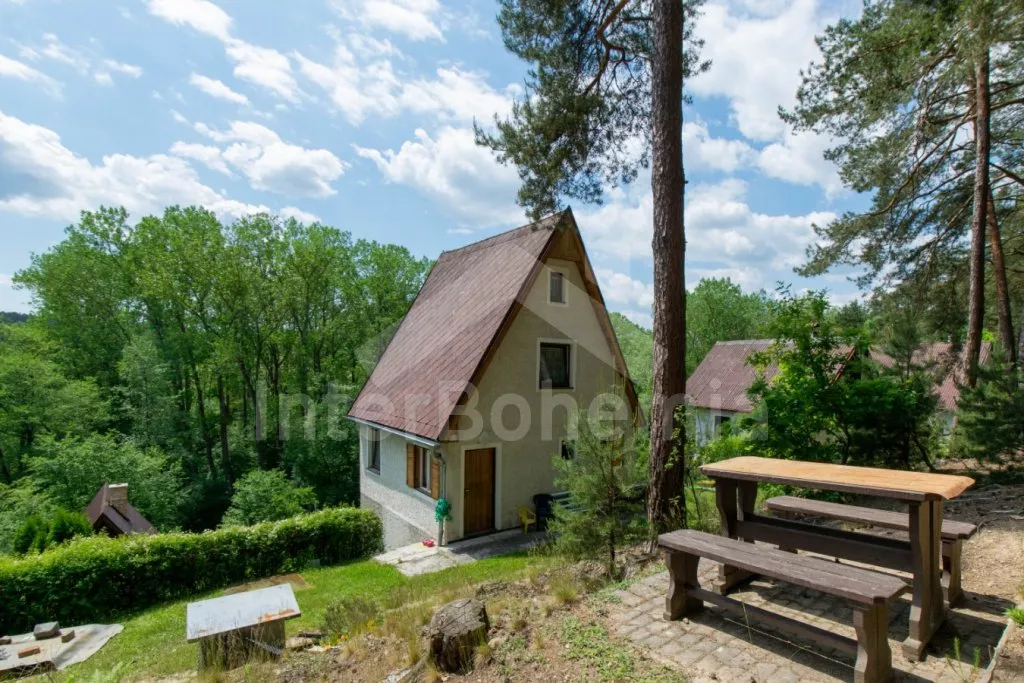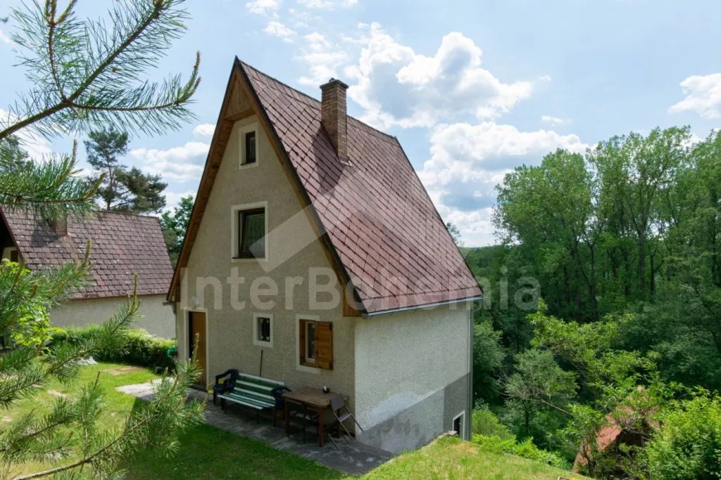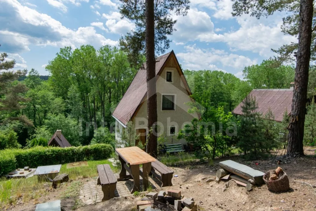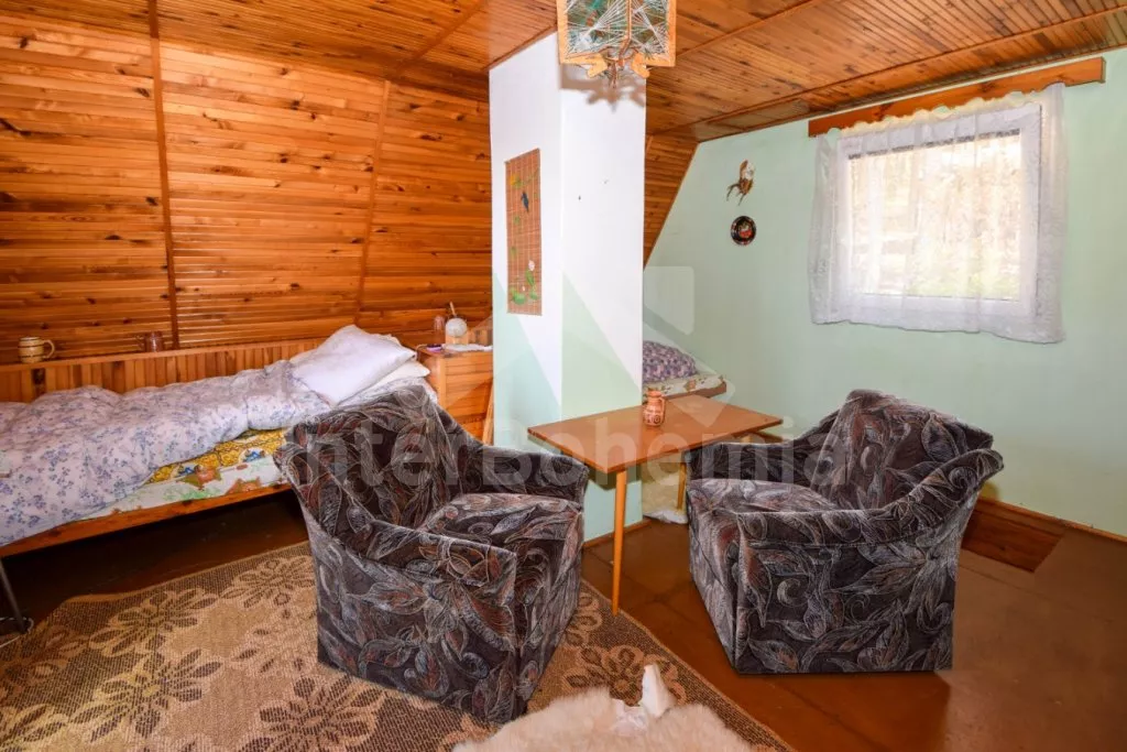 Útulná chatka ve svahu, s výhledem na okolní zeleň a blízký rybník. Obývací pokoj s jídelním stolem a pohovkou (extra dvoulůžko), na který přímo navazuje kuchyňka s dvou plotýnkovým vařičem, troubou, mikrovlnnou troubou, rychlovarnou konvicí, nádobím a dřezem (studená voda). Samostatné WC a sprchový kout (s teplou vodou z boileru). V podkroví (přístupné po příkrých schodech + průlez v podlaze) ložnice se 4 samostatnými lůžky, televizí a balkonem. Objekt není vytápěn. Hosté mají k dispozici posezení s ohništěm nad chatou. Parkování pro 1 - 2 vozidla u chaty.