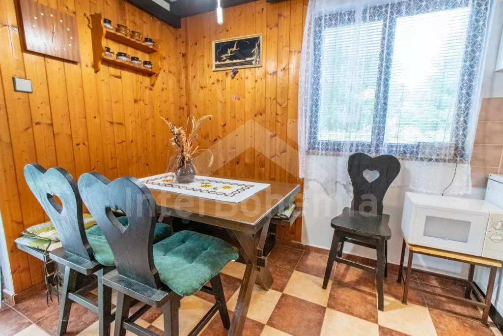 Volně stojící chata, hezky a pohodlně zařízená. Vchod, chodba, prostorný obývací pokoj se sedací soupravou, krbem, jídelním stolem, televizí se satelitním příjmem, rádiem a vstupem na terasu. Kuchyně… Více informací