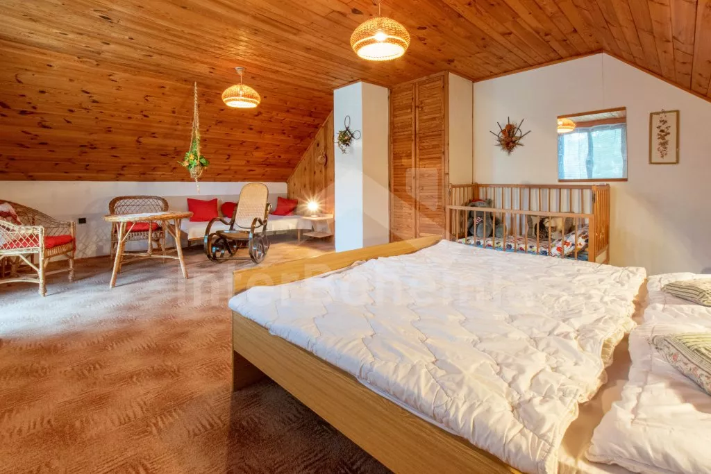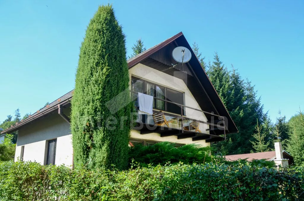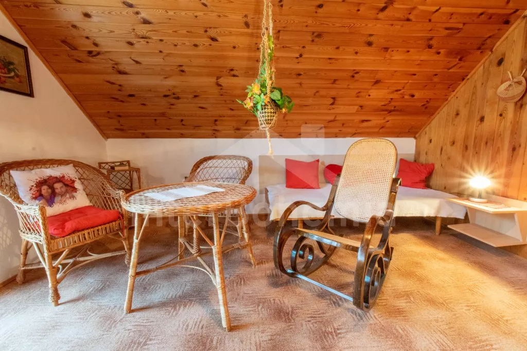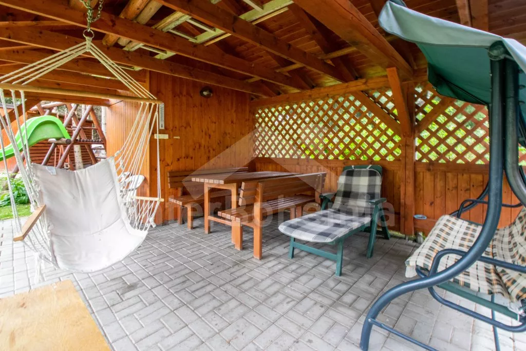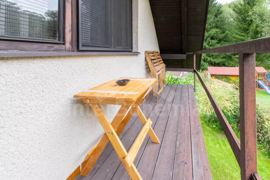 Volně stojící chata, hezky a pohodlně zařízená. Vchod, chodba, prostorný obývací pokoj se sedací soupravou, krbem, jídelním stolem, televizí se satelitním příjmem, rádiem a vstupem na terasu. Kuchyně s elektrickým sporákem, lednicí, kávovarem, varnou konvicí a mikrovlnnou troubou. Koupelna se sprchou a toaletou. V podkroví se nachází dvě ložnice – první s dvojlůžkem a jedním samostatným lůžkem a druhá se třemi samostatnými lůžky. K dispozici je zahrada oplocená živým plotem, zastřešená pergola s posezením pro 6 osob, zahradním krbem a houpací lavicí, dále zahradní nábytek se slunečníkem a přenosný gril a pro děti pískoviště.