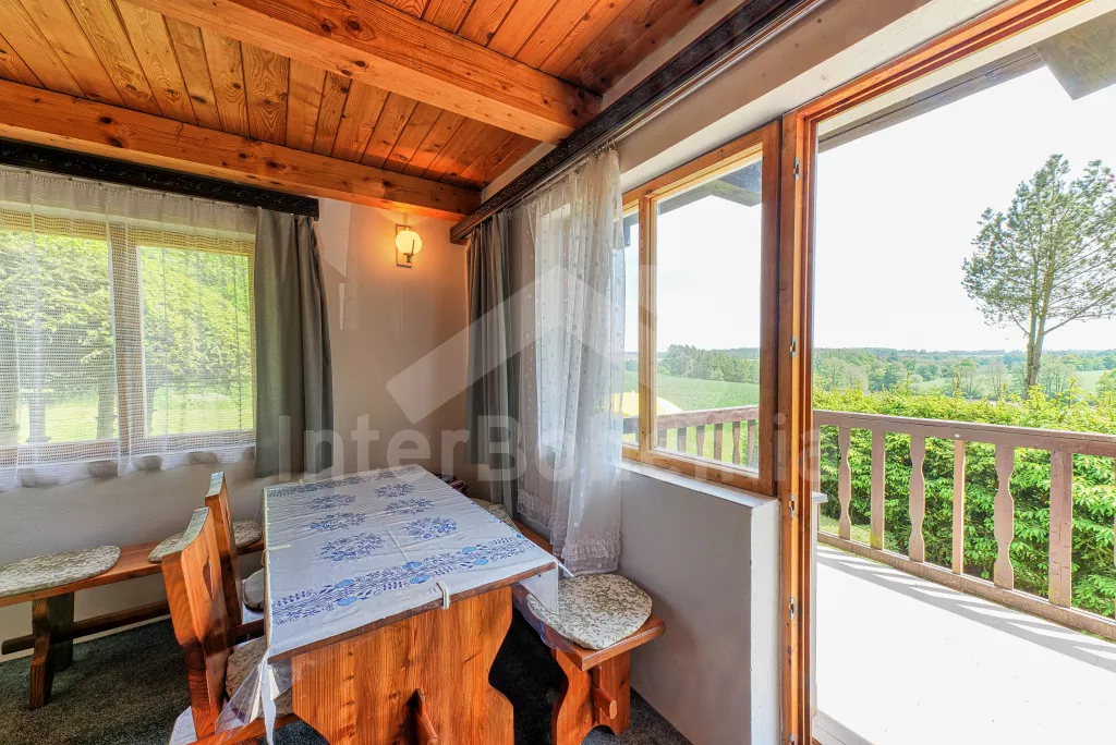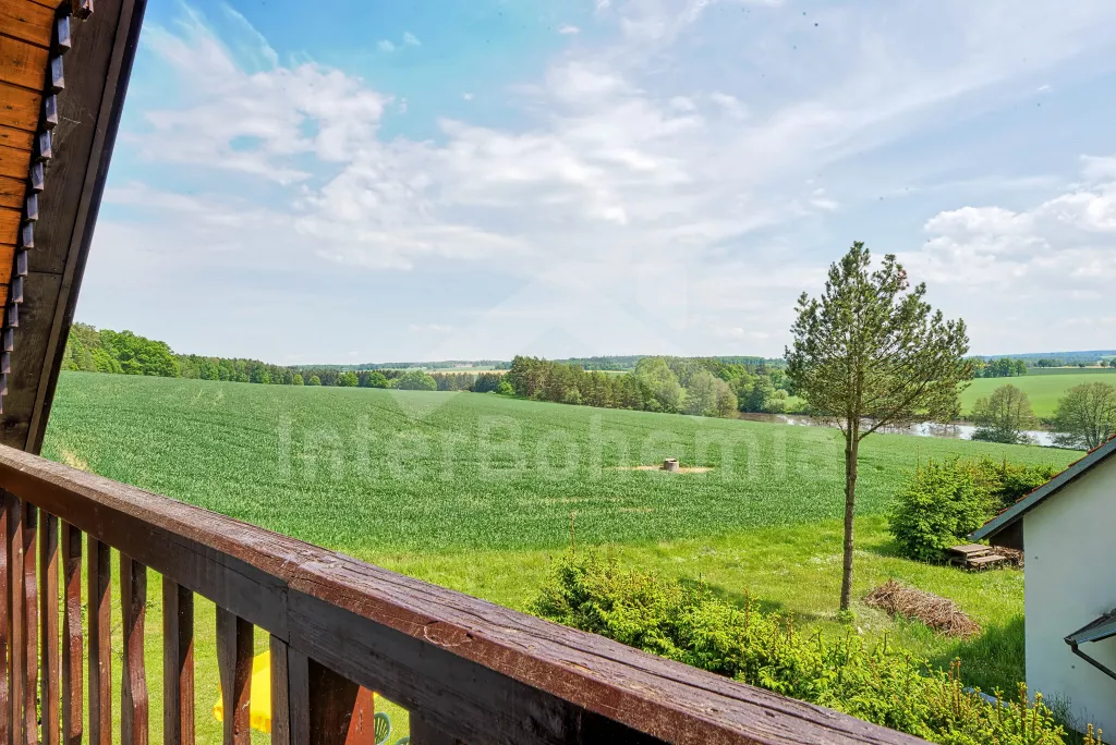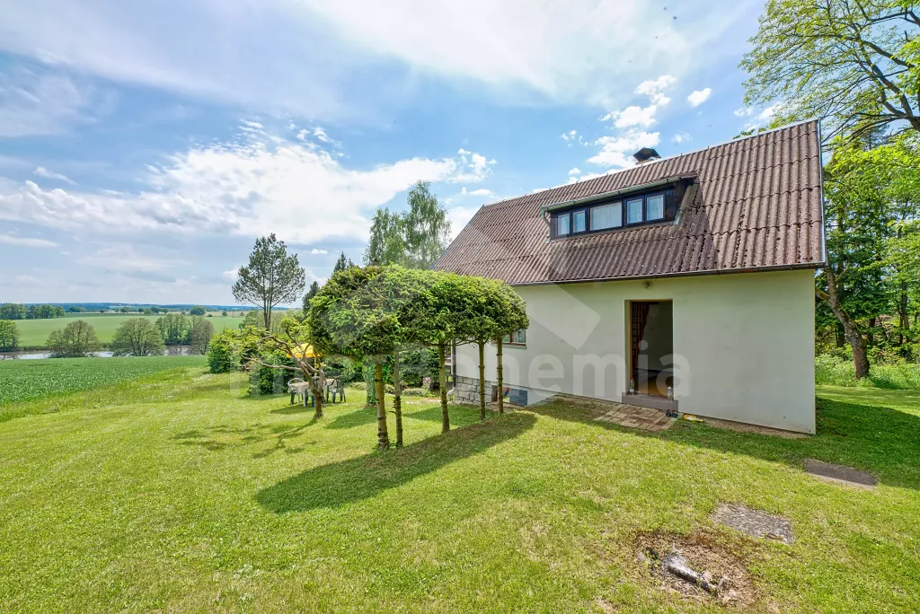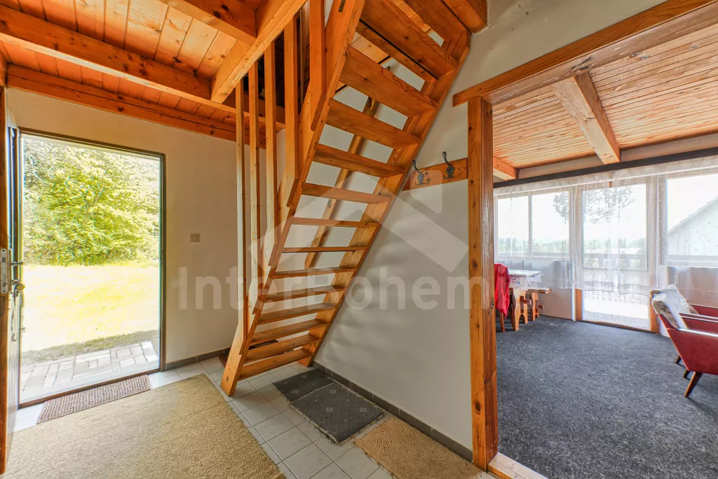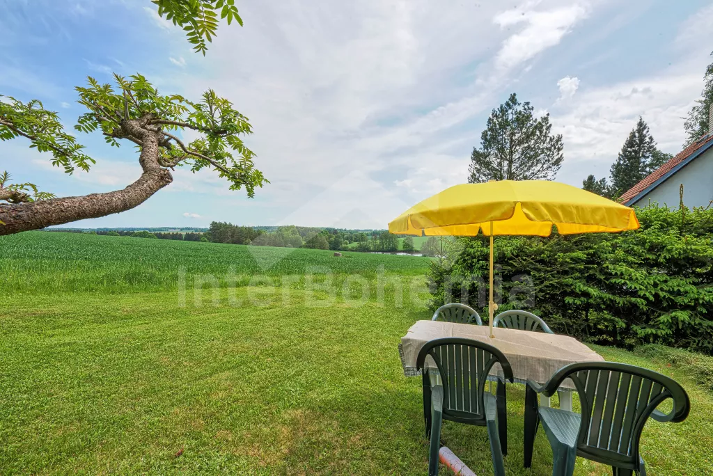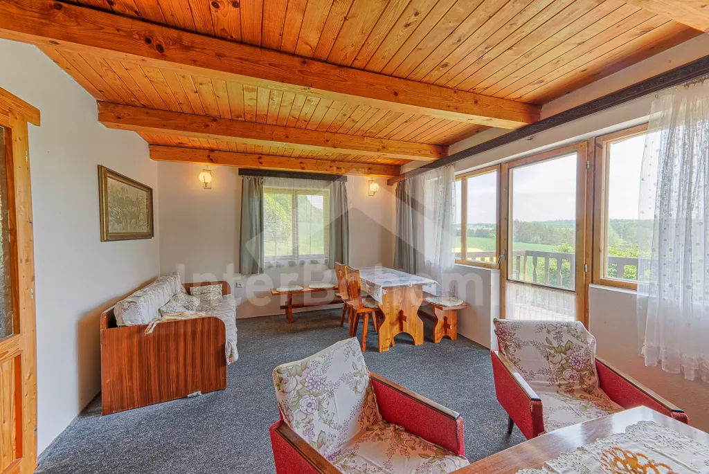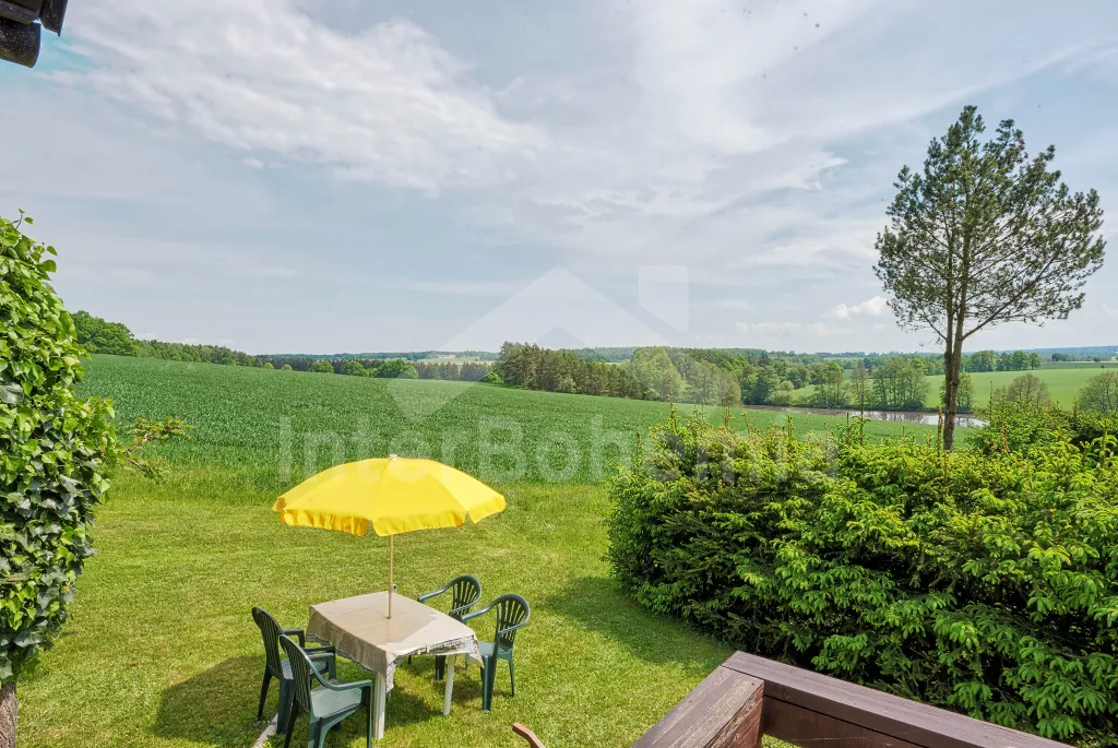 Volně stojící chata, na polosamotě u lesa s pěkným výhledem na louky, les a rybník. Obývací místnost se sedací soupravou a jídelním koutem, balkonem, televizí, rádiem, kuchyní s lednicí, plynovým sporákem se 4 plotýnkami a elektrickou troubou, kávovarem a mikrovlnou troubou. Koupelna se sprchou a toaletou. Nahoře je ložnice s dvojlůžkem a druhá ložnice se třemi jednolůžky a balkon. Zahrada se zahradním nábytkem a ohništěm. Vlastní parkoviště a garáž.