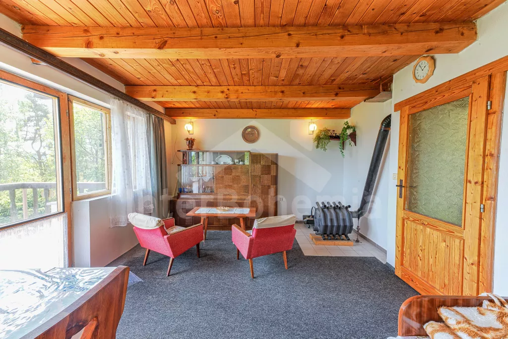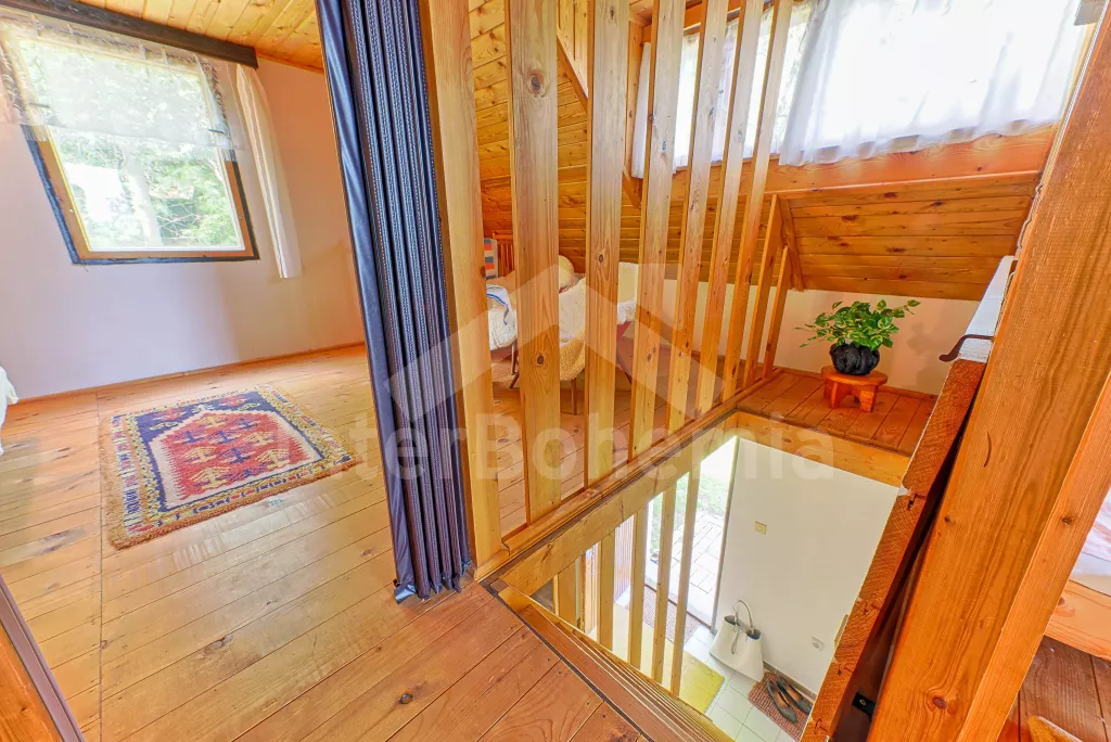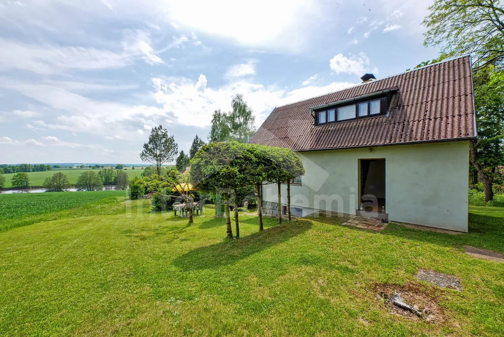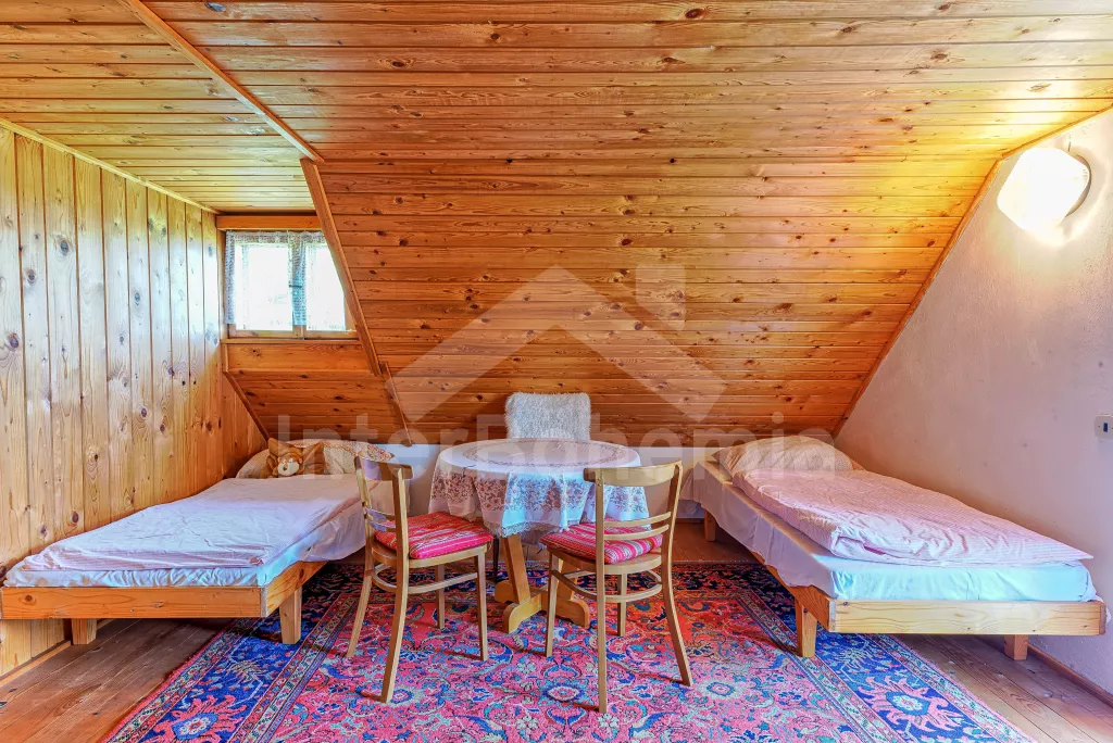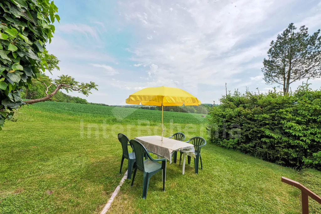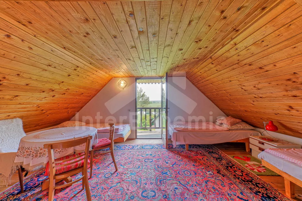 Volně stojící chata, na polosamotě u lesa s pěkným výhledem na louky, les a rybník. Obývací místnost se sedací soupravou a jídelním koutem, balkonem, televizí, rádiem, kuchyní s lednicí, plynovým sporákem se 4 plotýnkami a elektrickou troubou, kávovarem a mikrovlnou troubou. Koupelna se sprchou a toaletou. Nahoře je ložnice s dvojlůžkem a druhá ložnice se třemi jednolůžky a balkon. Zahrada se zahradním nábytkem a ohništěm. Vlastní parkoviště a garáž.