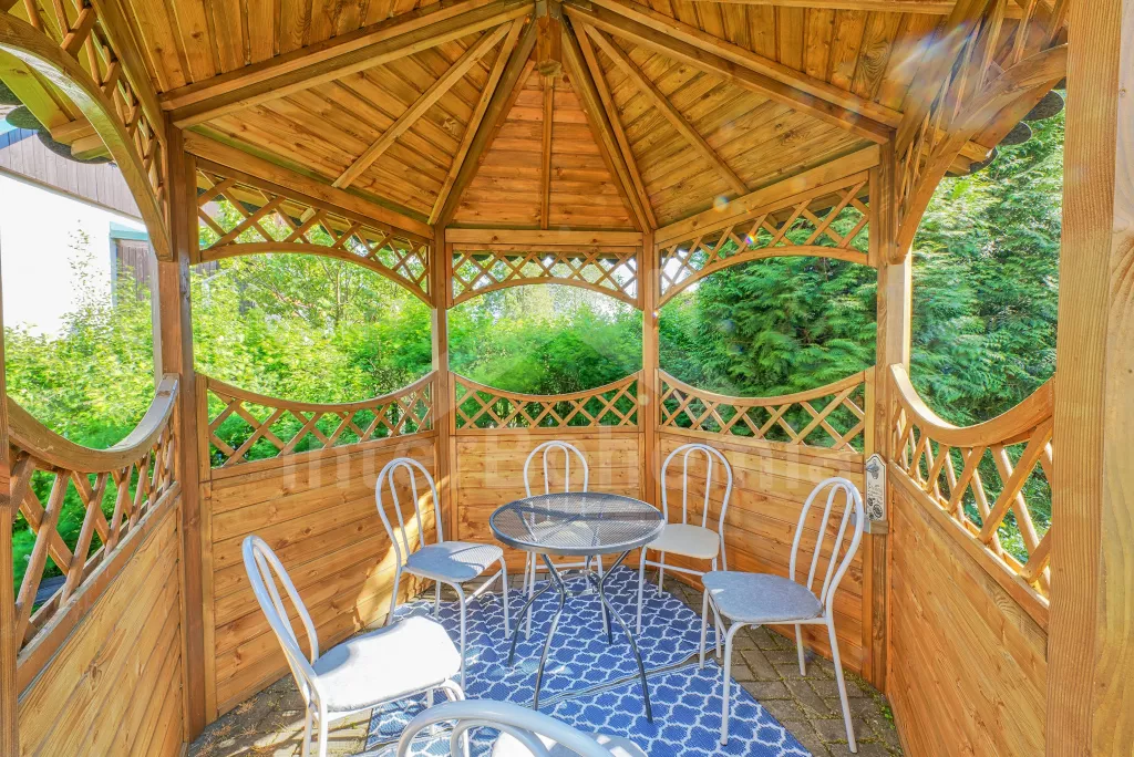 Volně stojící chata, z venku skromně vypadající ale uvnitř hezky, čistě a útulně zařízená. Vstup přes verandu s posezením, chodba. Obývací pokoj se sedací soupravou, televizí se satelitním příjmem a DVD, krbem a vstupem na balkón. Otevřená kuchyňka s jídelním koutem, elektrickým sporákem s keramickou varnou deskou, lednicí, kávovarem, varnou konvicí a mikrovlnnou troubou. Ložnice s dvojlůžkem. Koupelna se sprchou a samostatná toaleta. Po schodech se dostanete do druhé, průchozí ložnice se dvěma přistýlkami (matrace na dřevěném rámu) a vstupem do třetí ložnice se dvěma samostatnými lůžky. V suterénu se nachází prostor pro ukládání jízdních kol. Elektrické vytápění. Chata stojí na vlastním neoploceném pozemku, k dispozici je kovový zahradní nábytek, houpací lavice, přenosný gril a ohniště. Vlastní parkoviště.