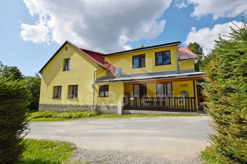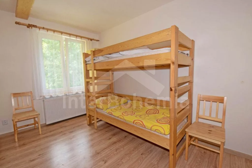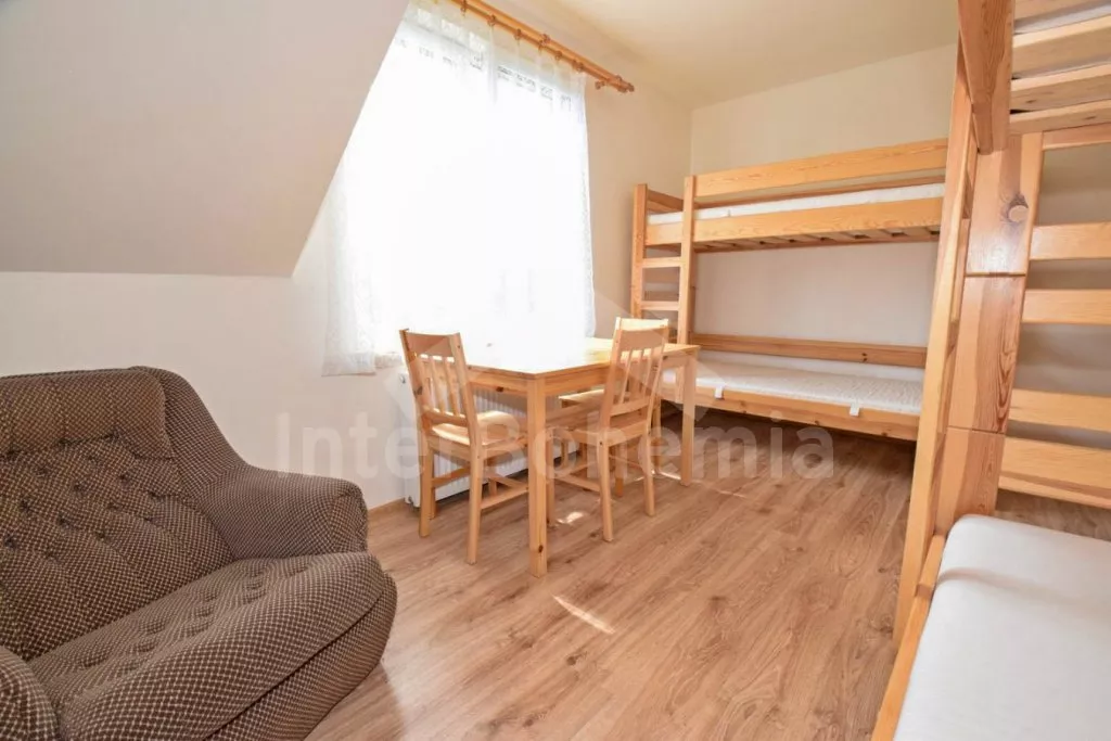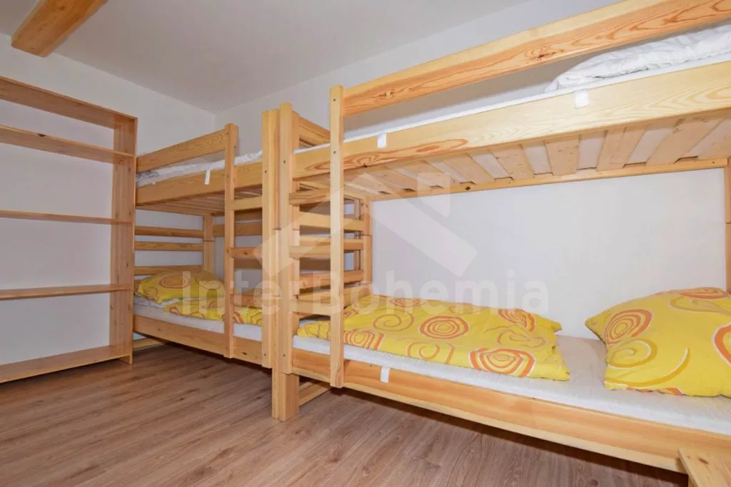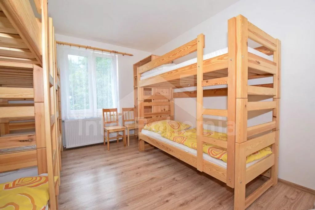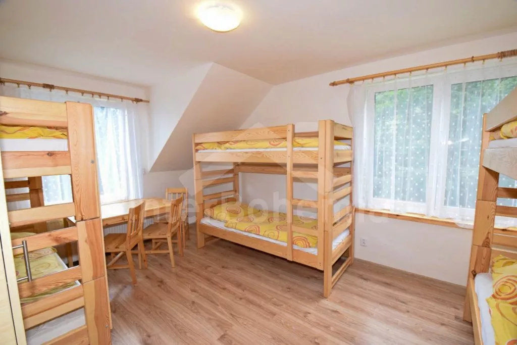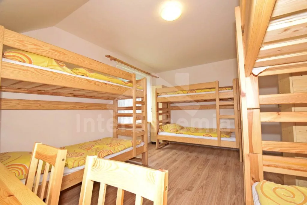 Volně stojící prostorný dům, účelně a nově vybavený, po částečné rekonstrukci v roce 2019. Dům je ideální pro velkou skupinu osob nebo několik rodin. V přízemí se nachází velká společenská místnost s barem, výčepem, lednicí a mrazákem, LED televizí, šipkami a jídelními stoly. Samostatná prostorná kuchyně s lednicí, mrazákem, indukční varnou deskou, troubou, mikrovlnnou troubou, rychlovarnou konvicí a nádobím. Tři toalety, tři umyvadla a sprcha. V podkroví 9 ložnic s jednolůžky a palandami s kapacitou od 2 do 6 lůžek. Postele je možné po předchozí domluvě přestavit na plnohodnotná dvoulůžka. Dvě koupelny, každá se dvěma sprchovými kouty a jedna navíc se dvěma umyvadly. Pánské a dámské toalety. Objekt je vytápěn centrálně. V suterénu je možné využít velkou úschovnu kol nebo lyží. Hosté mají k dispozici velkou zahradu a posezení před domem. Parkování u objektu až pro 10 vozidel.