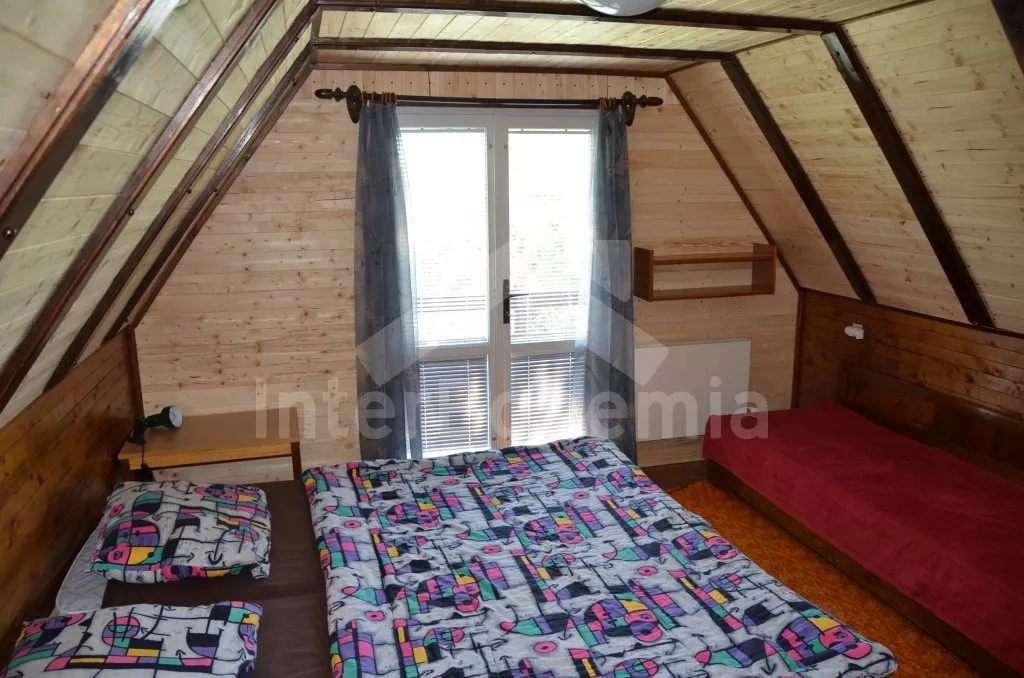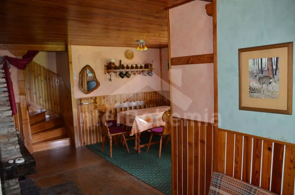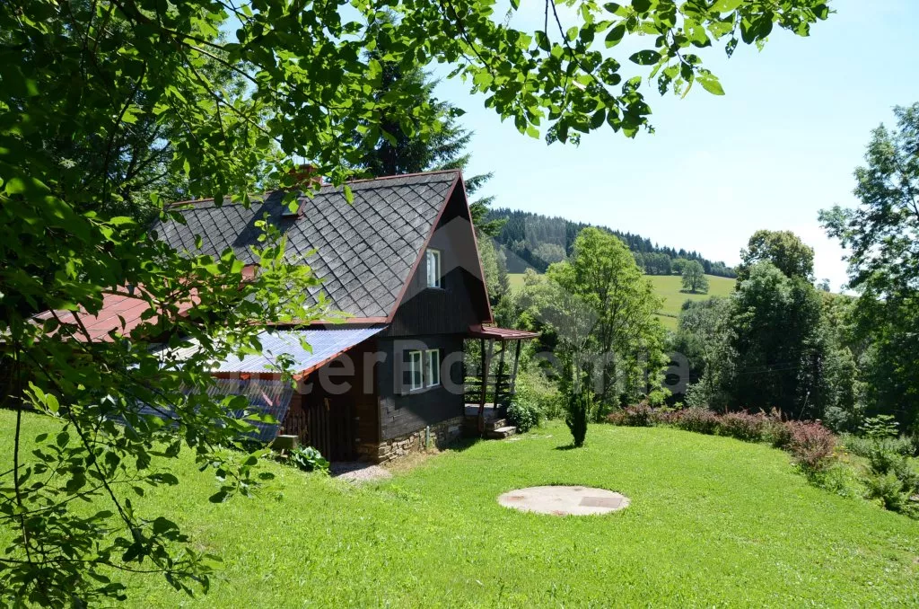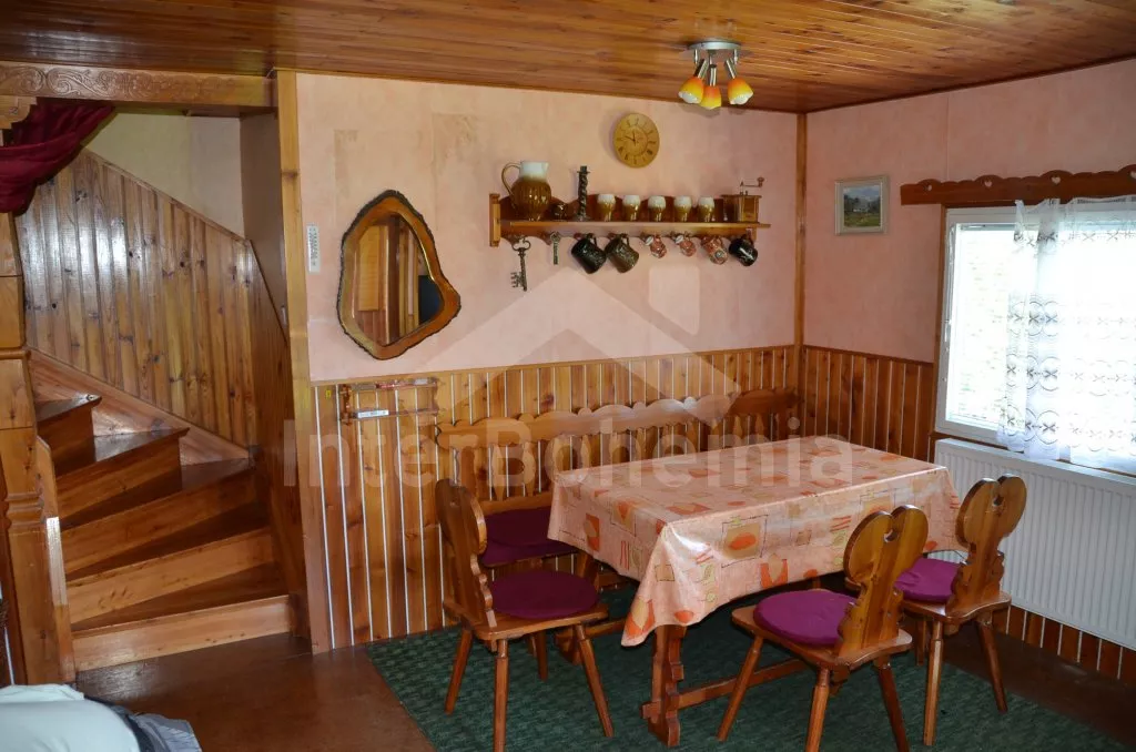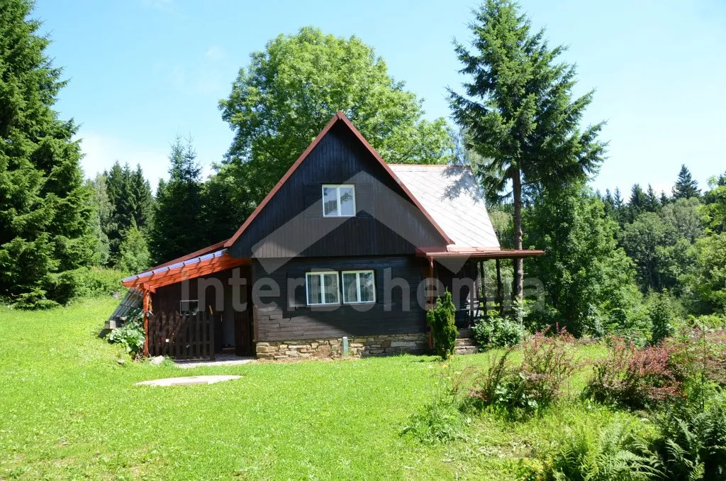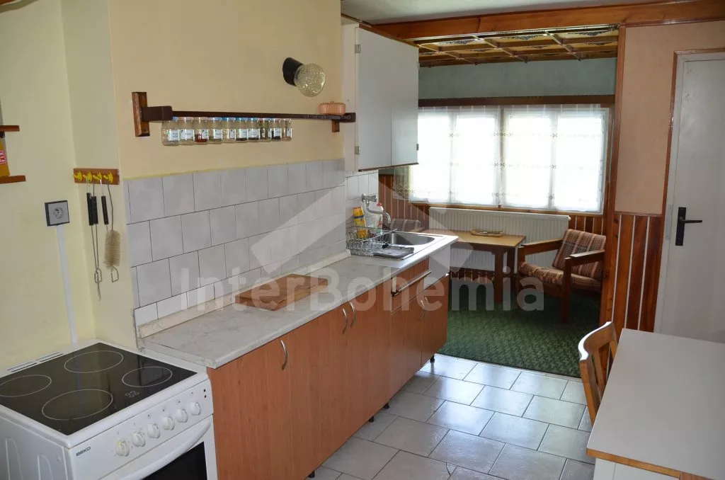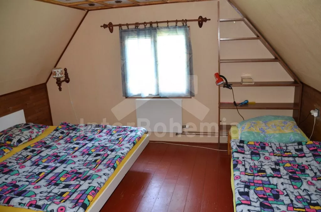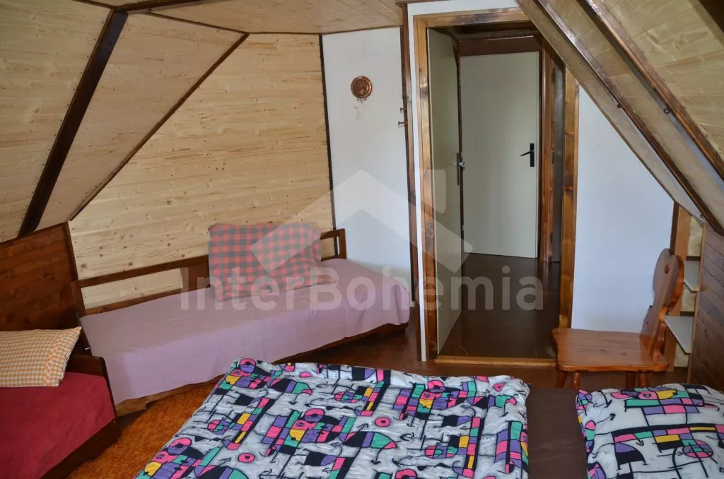 Volně stojící chalupa, účelně a jednoduše zařízená. Vstup, obývací místnost s jídelním stolem pro 7 osob, barevnou televizí se satelitem, krbem a kuchyňským koutem s lednicí a mrazákem, elektrickým vařičem se dvěma plotýnkami, mikrovlnou troubou a varnou konvicí. Koupelna se sprchovým koutem, umyvadlem a toaletou. V patře se nachází dvě ložnice – první s jedním dvojlůžkem a dvěma samostatnými lůžky, druhá s jedním dvojlůžkem(možné rozdělit na samostatná lůžka), jedním samostatným lůžkem a vstupem na bakónek. Objekt stojí na neoploceném pozemku u se zahradou hned u lesa. K dispozici je malé dřevěné posezení na terase před vchodem do chaty. Parkování u objektu.