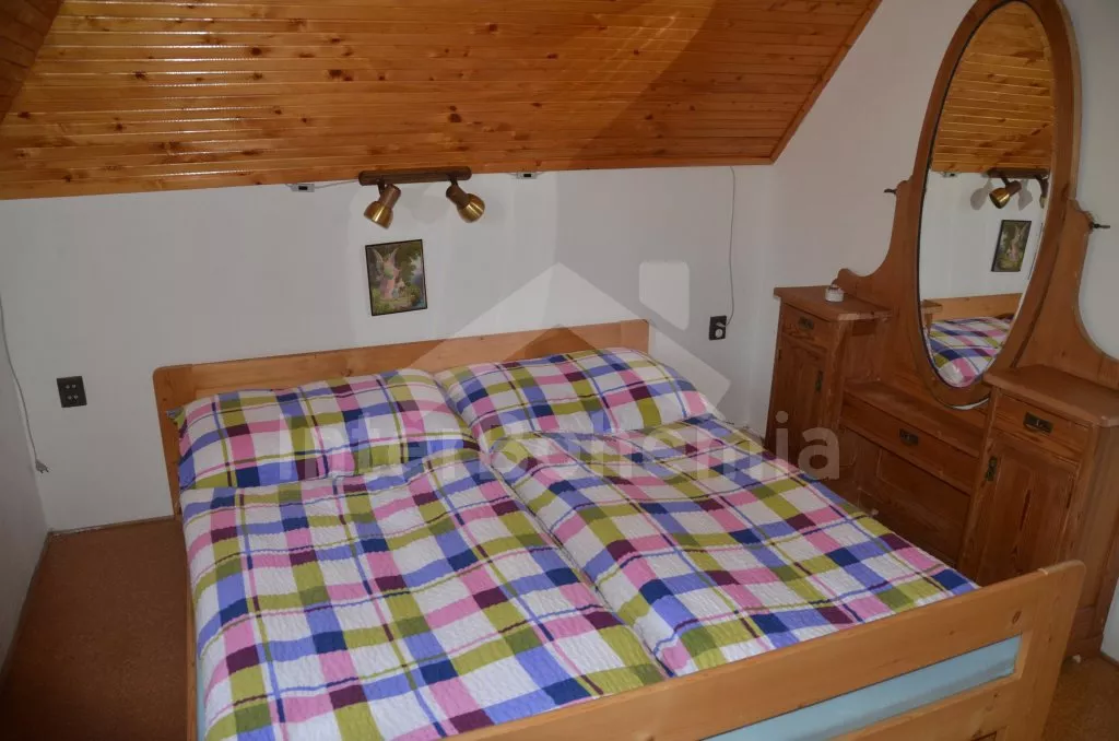 Volně stojící chata, stylově a velmi dobře vybavená. Vstup, chodba, obývací pokoj se sedací soupravou (zároveň možnost přistýlky), krbem a přístupem na terasu. Jídelna s jídelním stolem pro 4 osoby a vstupem do kuchyně s elektrickým sporákem, kombinovanou lednicí s mrazákem, varnou konvicí, kávovarem (překapávaná káva), topinkovačem a mikrovlnnou troubou. Koupelna s vanou a toaletou. V podkroví se nachází malá hala, šatna a dvě ložnice – jedna s dvojlůžkem a druhá se třemi samostatnými lůžky. Elektrické topení. K dispozici neoplocená zahrada s terasou, zahradní nábytek se slunečníkem a zahradní krb. Vlastní parkoviště pro 2 auta.