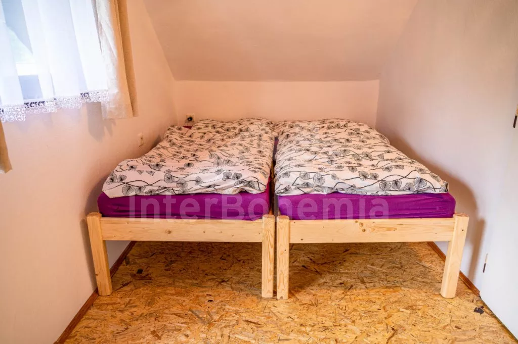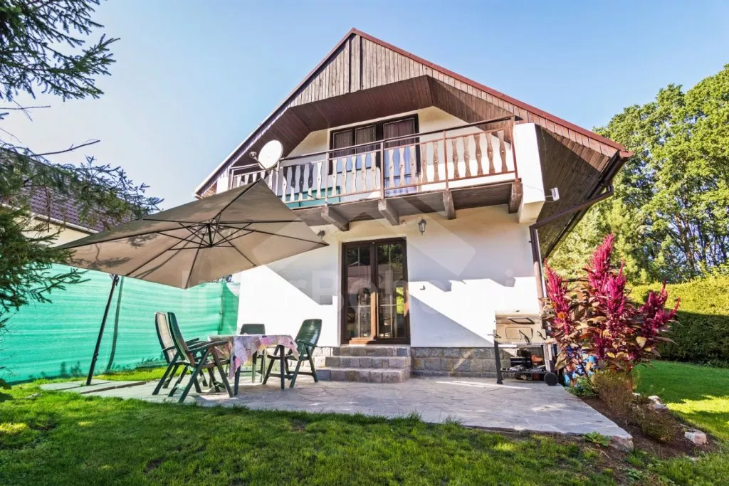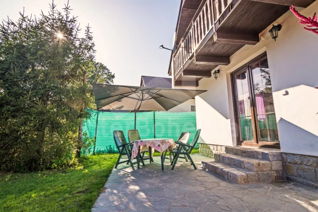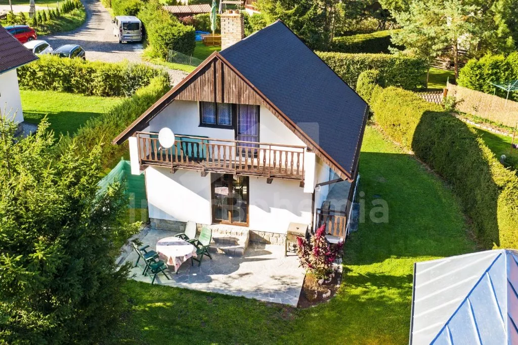 Volně stojící chata, příjemně zařízená. Vstup, chodba, malá zrenovovaná koupelna se sprchou, samostatné WC. Moderní kuchyně s lednicí, čtyřmi plynovými varnými plotýnkami, mikrovlnnou troubou, varnou konvicí, kávovarem a malým jídelním stolem. Obývací pokoj se sedací soupravou, krbem, rádiem a televizí se satelitním příjmem. Vstup na terasu. V patře se nachází 3 ložnice – první s jedním dvojlůžkem a balkónem, druhá se dvěma samostatnými lůžky a třetí s jedním samostatným lůžkem a dětskou postýlkou. K dispozici je neoplocená zahrada, velká terasa se zahradním nábytkem a slunečníkem a přenosný gril. Parkování na vlastním pozemku v blízkosti chaty.
