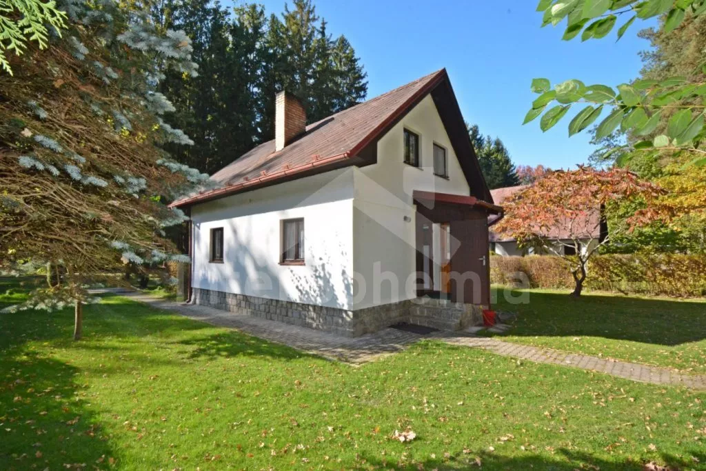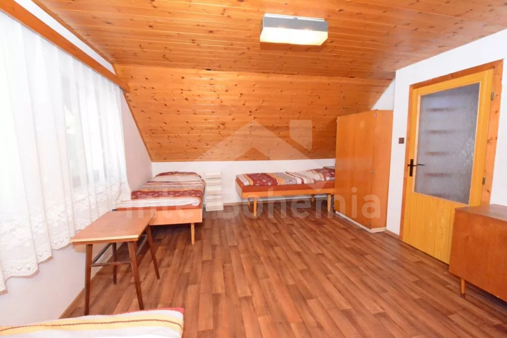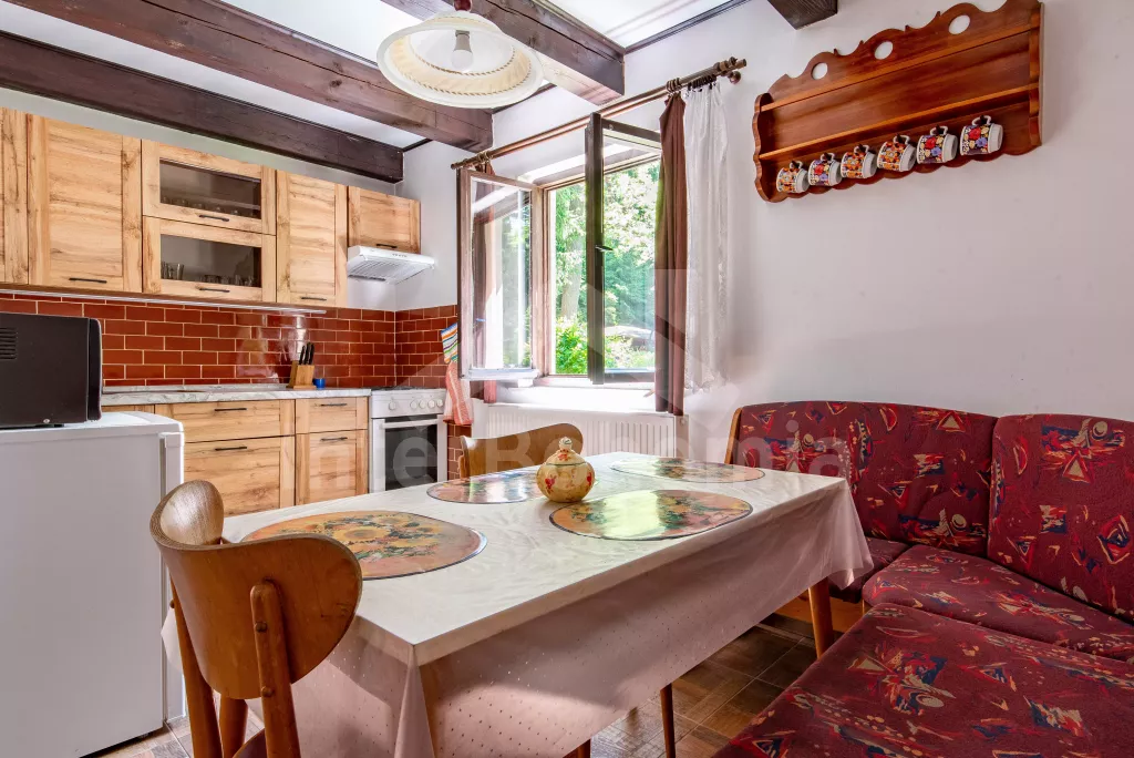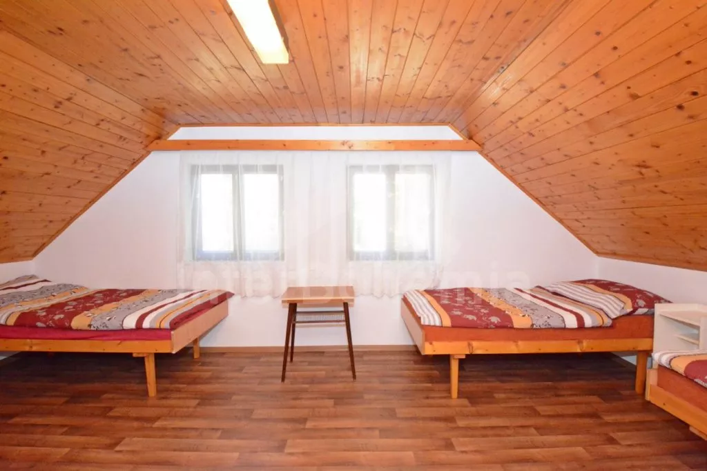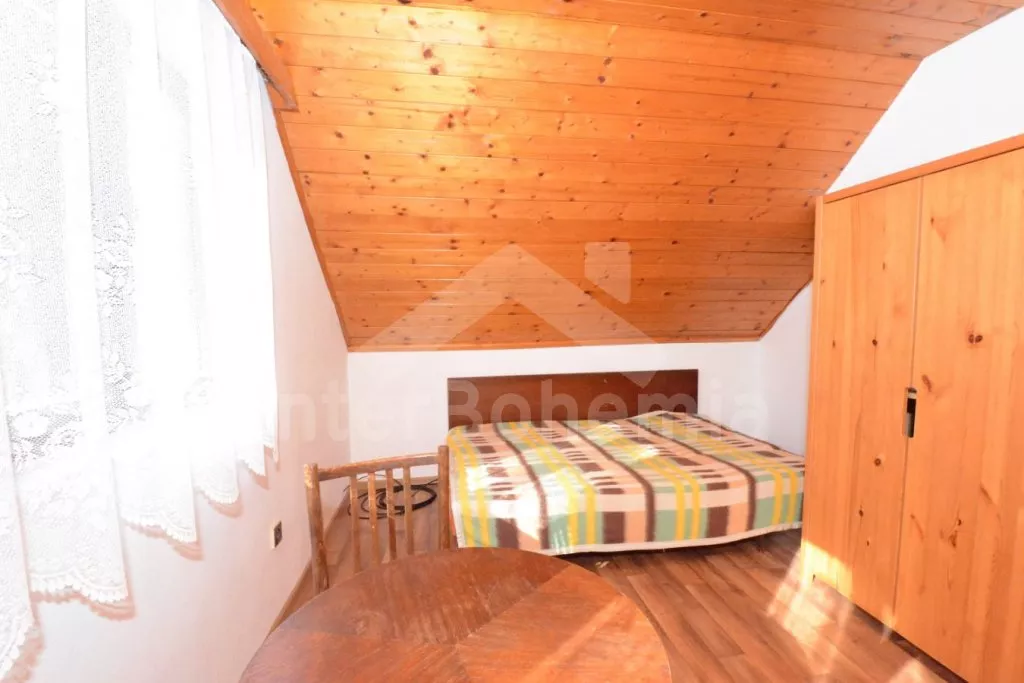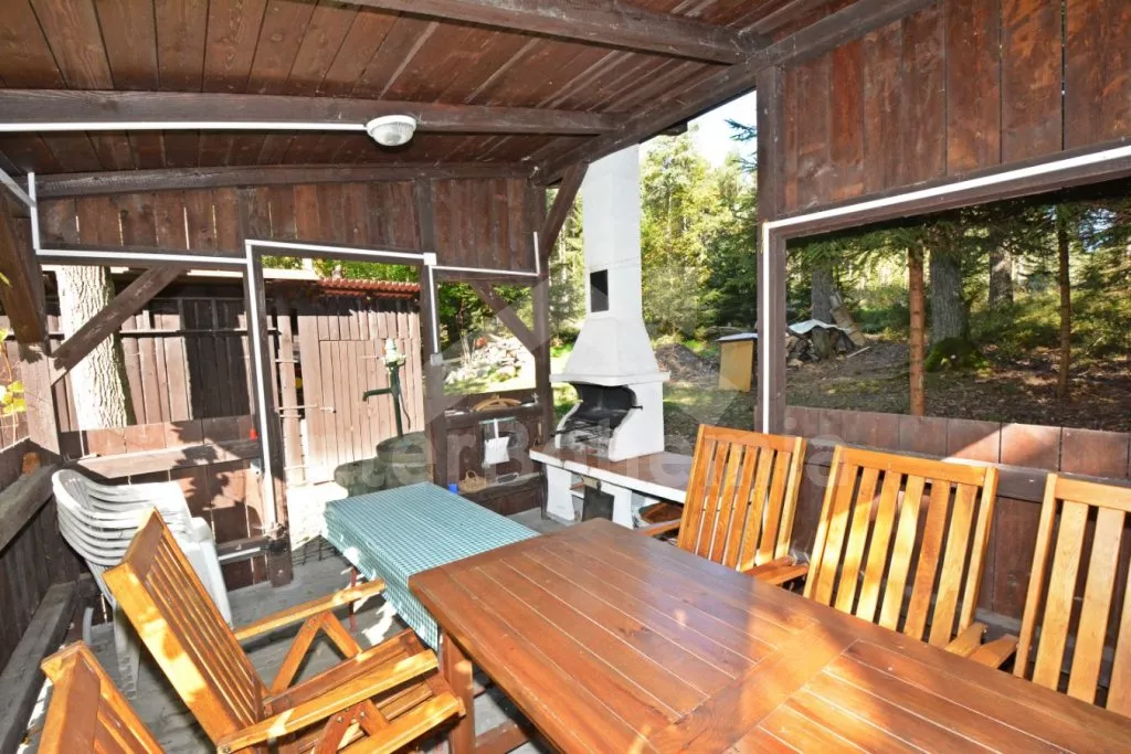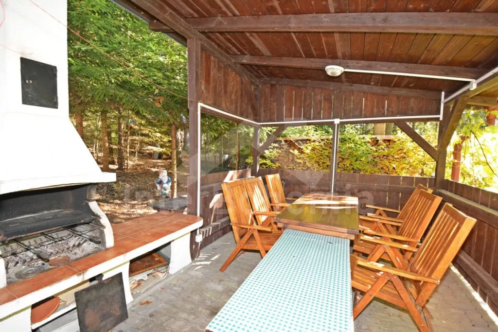 Volně stojící dvoupodlažní chata po částečné rekonstrukci v roce 2019, na vlastní téměř 1 000 m2 velké neoplocené zahradě. Vstup, hala, prostorná obývací místnost se sedací soupravou, krbem, krbovými kamny a LCD televizí se satelitem. V kuchyni jídelní stůl pro 6 osob. Kuchyňská linka se sporákem (plyn), troubou, mikrovlnnou troubou, lednicí s mrazákem, rychlovarnou konvicí a nádobím. V podkroví se nacházejí dvě ložnice, první s dvoulůžkem a jedním jednolůžkem, druhá ložnice se čtyřmi jednolůžky. Koupelna se sprchovým koutem, bidetem, umyvadlem a WC. Vytápění objektu lokální kamny. Hosté mají k dispozici zahradní posezení, dále velkou krytou pergolu s dřevěným nábytkem a grilem. Možnost vstupu do lesa přímo z pozemku chaty. Parkování u objektu pro 2 automobily.