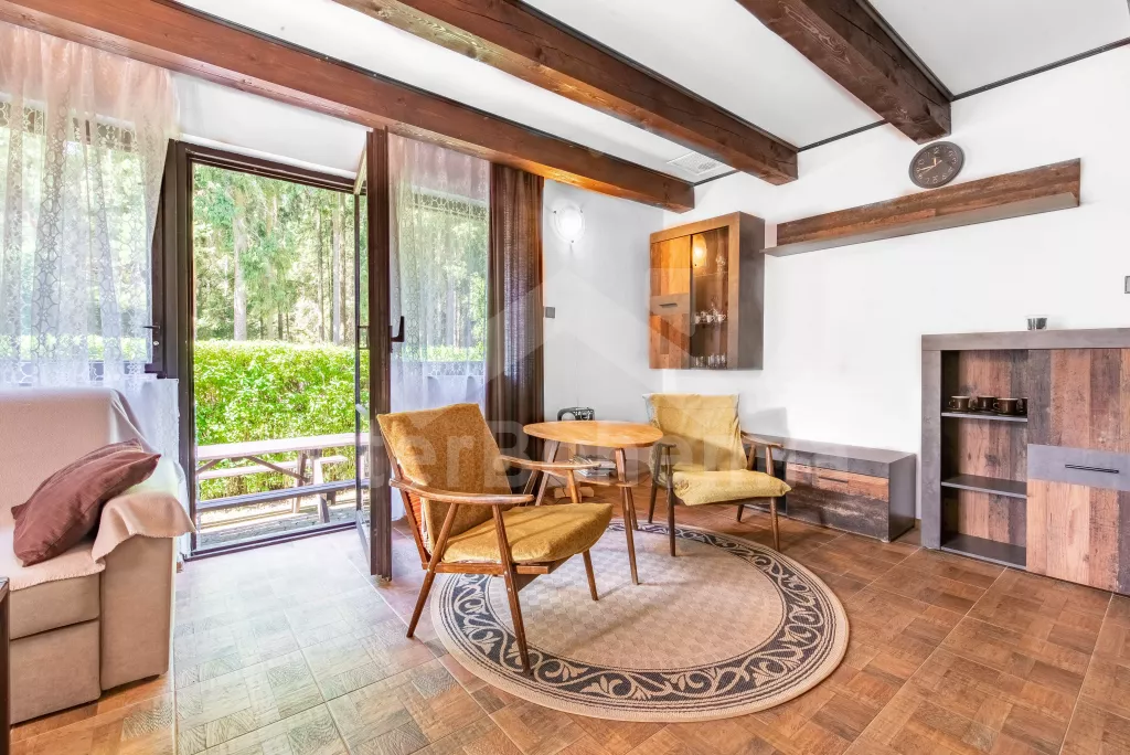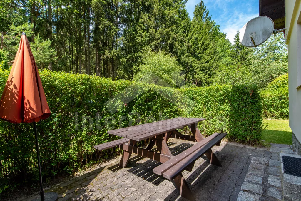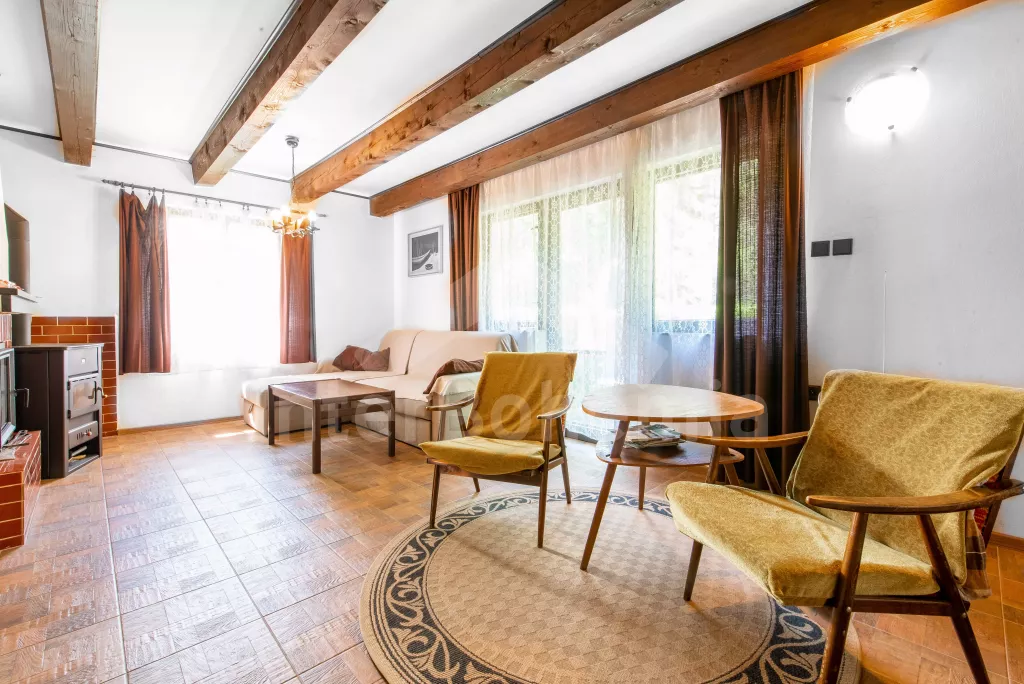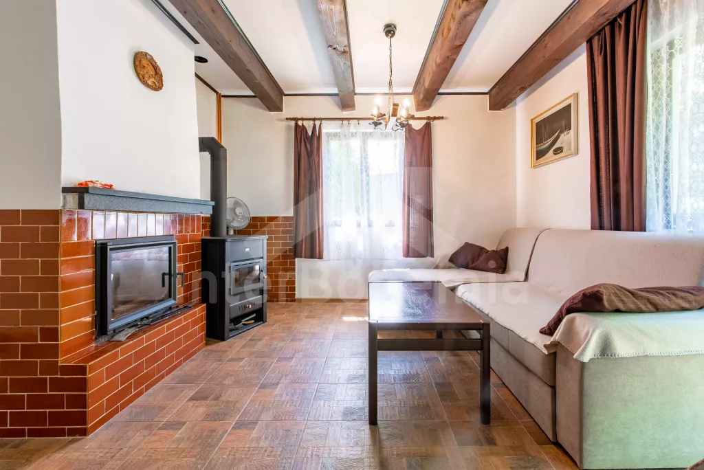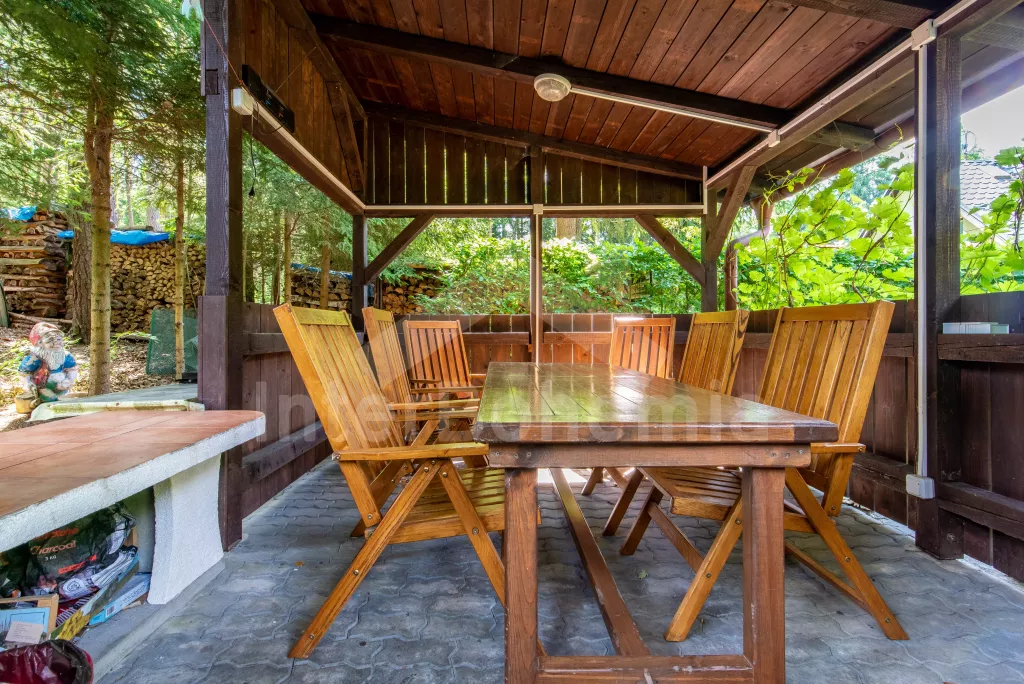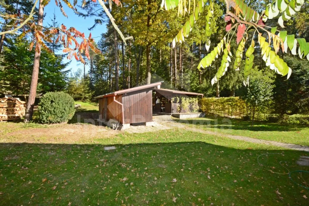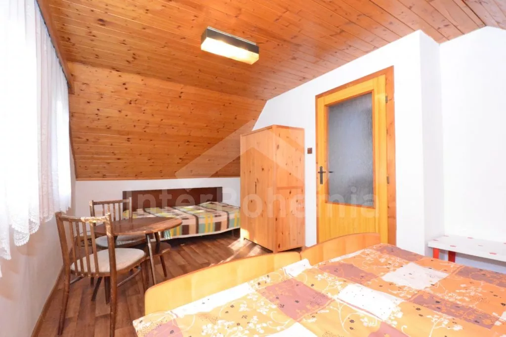 Volně stojící dvoupodlažní chata po částečné rekonstrukci v roce 2019, na vlastní téměř 1 000 m2 velké neoplocené zahradě. Vstup, hala, prostorná obývací místnost se sedací soupravou, krbem, krbovými kamny a LCD televizí se satelitem. V kuchyni jídelní stůl pro 6 osob. Kuchyňská linka se sporákem (plyn), troubou, mikrovlnnou troubou, lednicí s mrazákem, rychlovarnou konvicí a nádobím. V podkroví se nacházejí dvě ložnice, první s dvoulůžkem a jedním jednolůžkem, druhá ložnice se čtyřmi jednolůžky. Koupelna se sprchovým koutem, bidetem, umyvadlem a WC. Vytápění objektu lokální kamny. Hosté mají k dispozici zahradní posezení, dále velkou krytou pergolu s dřevěným nábytkem a grilem. Možnost vstupu do lesa přímo z pozemku chaty. Parkování u objektu pro 2 automobily.