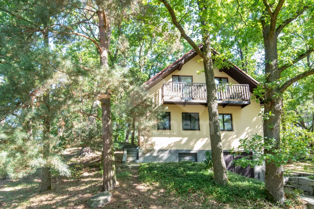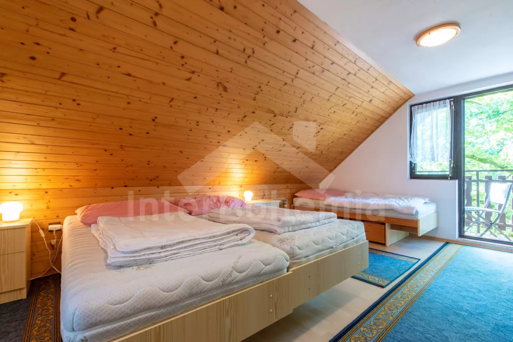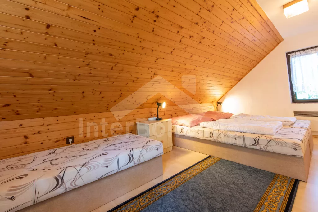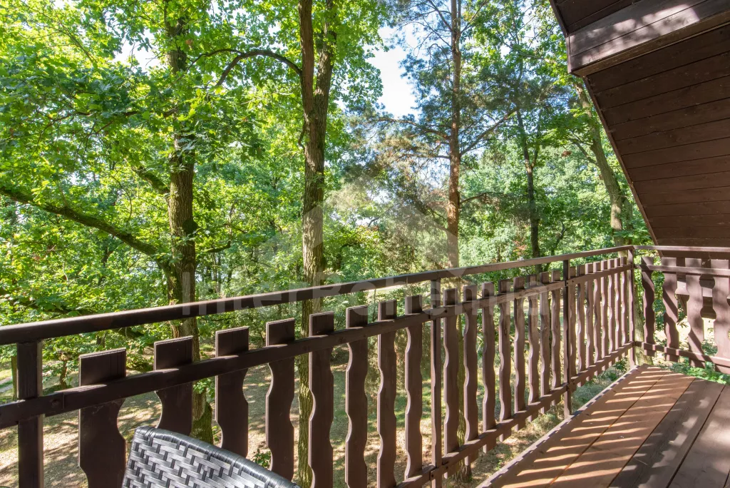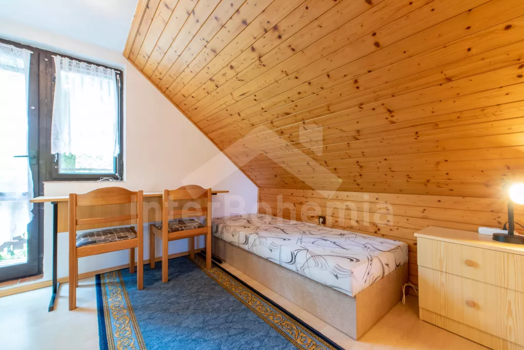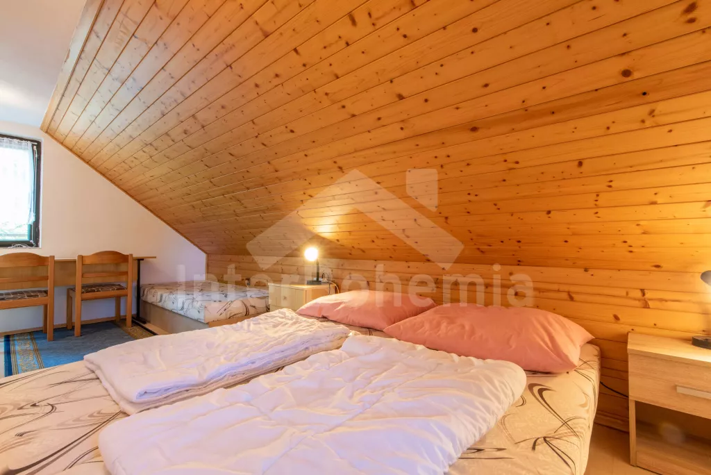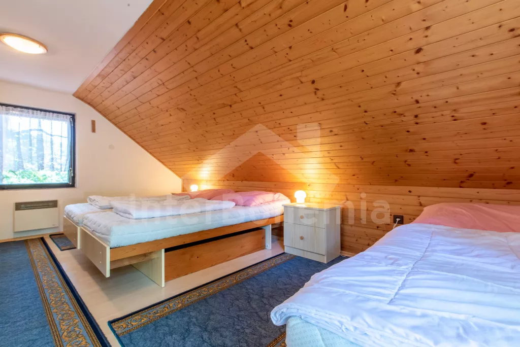 Volně stojící chata, útulně a příjemně zařízená. Vstup, chodba, malý obývací pokoj se sedací soupravou, jídelním stolem, krbem, televizí a videem. Kuchyňka s plynovým sporákem, lednicí, kávovarem, varnou konvicí a mikrovlnnou troubou. Koupelna se sprchou a toaletou. V patře se nachází dvě ložnice – každá s dvojlůžkem a jedním samostatným lůžkem. Z obou ložnic je přístup na balkón. Elektrické vytápění. Chata stojí na neoploceném pozemku s terasou, zahradním nábytkem a ohništěm. Garáž a vlastní parkoviště.