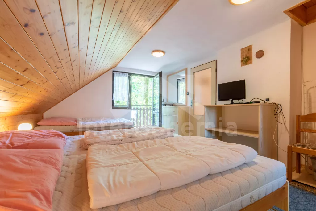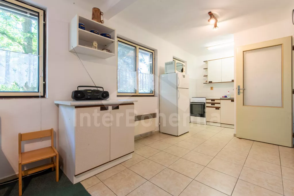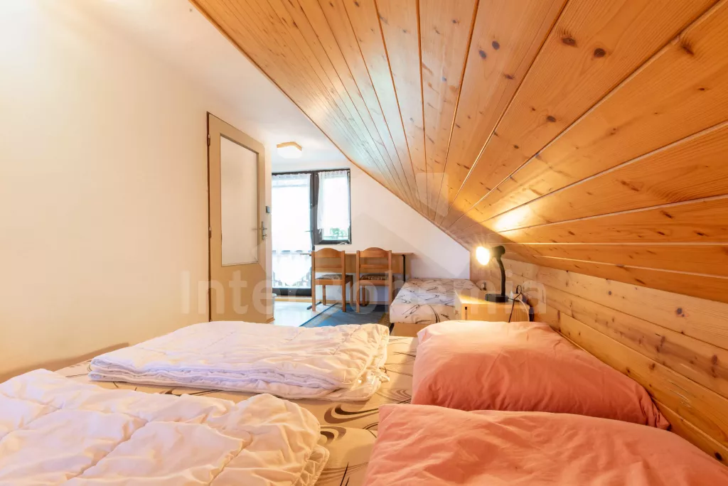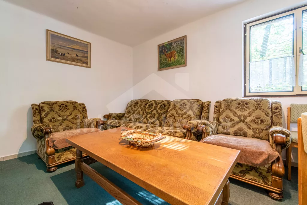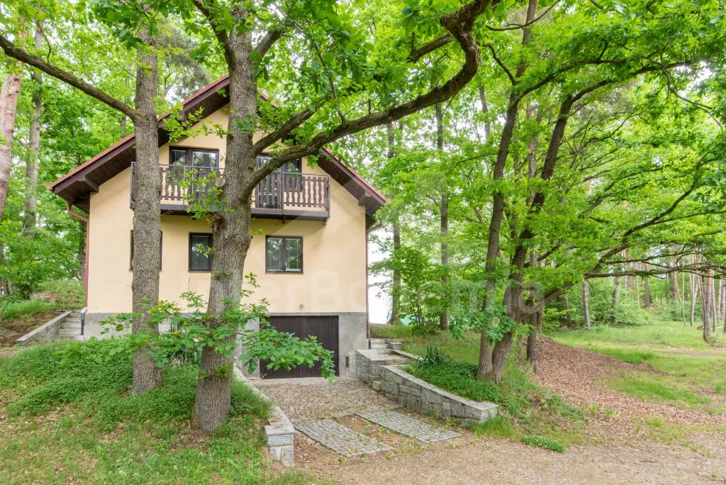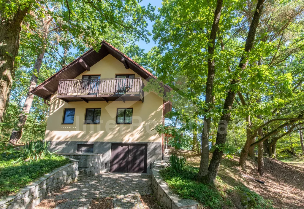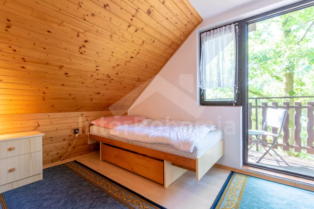 Volně stojící chata, útulně a příjemně zařízená. Vstup, chodba, malý obývací pokoj se sedací soupravou, jídelním stolem, krbem, televizí a videem. Kuchyňka s plynovým sporákem, lednicí, kávovarem, varnou konvicí a mikrovlnnou troubou. Koupelna se sprchou a toaletou. V patře se nachází dvě ložnice – každá s dvojlůžkem a jedním samostatným lůžkem. Z obou ložnic je přístup na balkón. Elektrické vytápění. Chata stojí na neoploceném pozemku s terasou, zahradním nábytkem a ohništěm. Garáž a vlastní parkoviště.