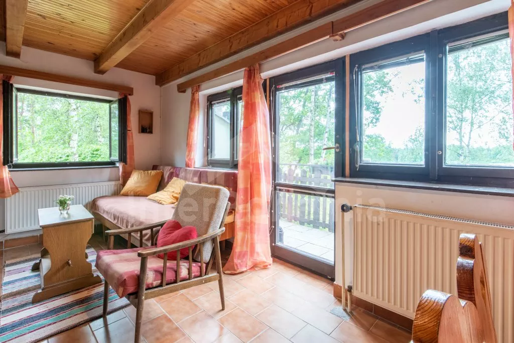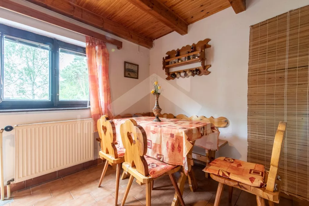 Volně stojící chata, útulně zařízená. Vstup, chodba, obývací pokoj s pohovkou, jídelním koutem, krbem, televizí a vstupem na balkón. Kuchyňka s elektrickým sporákem s keramickou varnou deskou,… Více informací